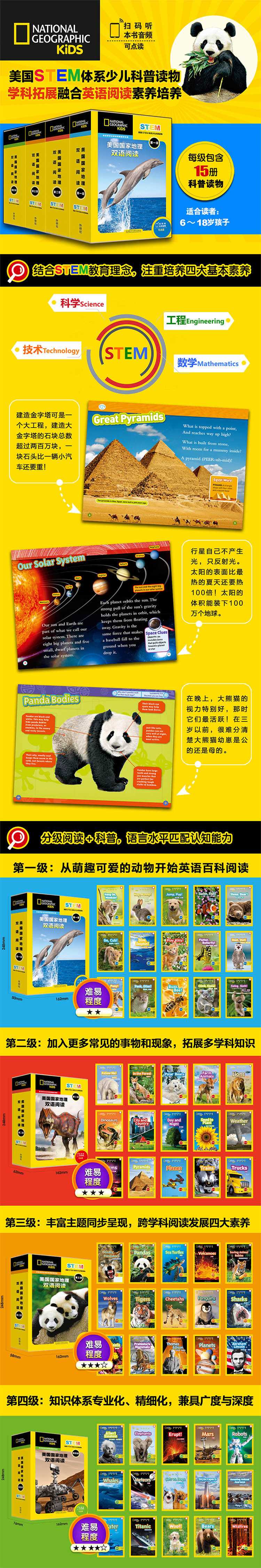 “美国国家地理双语阅读”共分4个级别,每个级别包含15册图书: