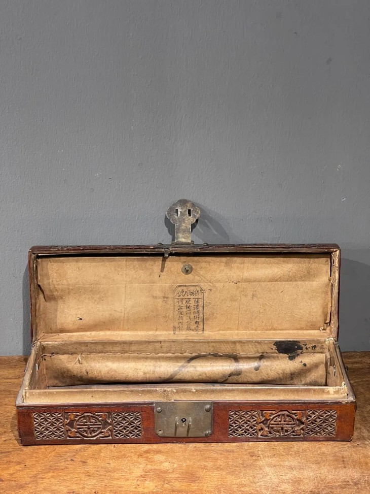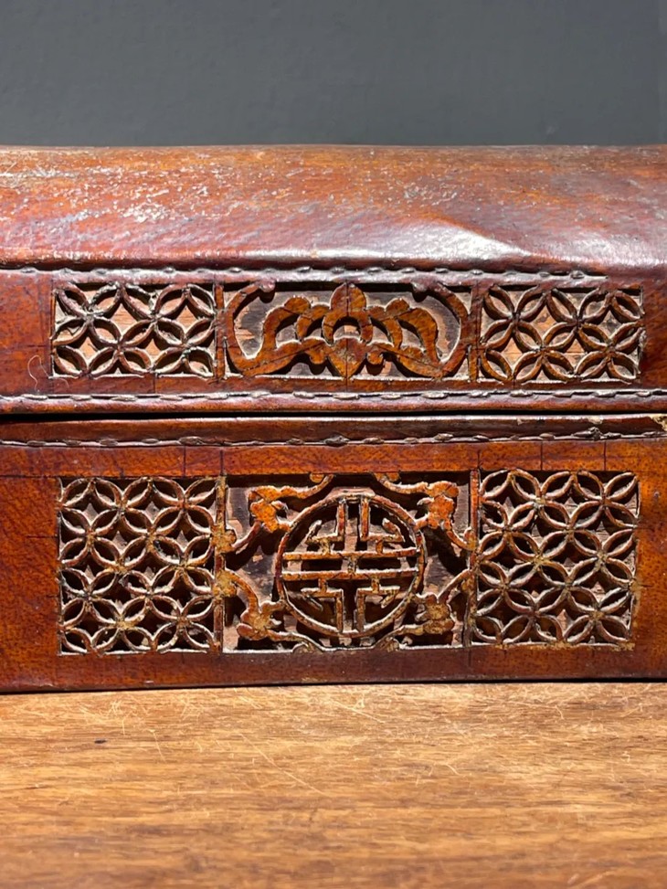 这是一件木胎外包裹雕花牛皮加青铜扣制作成型的长方型收纳盒,此收纳盒上方圆弧前方皮雕金钱纹,搭配青铜锁扣,是一件实用美观的收纳盒,皮雕技艺是延续久远的传统民俗技艺,此精致的收纳箱造型简约大氣,雕金钱纹饰,精美华丽,搭配传统如意形金属锁扣,整体风格虽岁月痕迹明显,却不减华丽贵气,可以融入当代空间增色添彩,或当坚固耐用的杂物收纳箱。