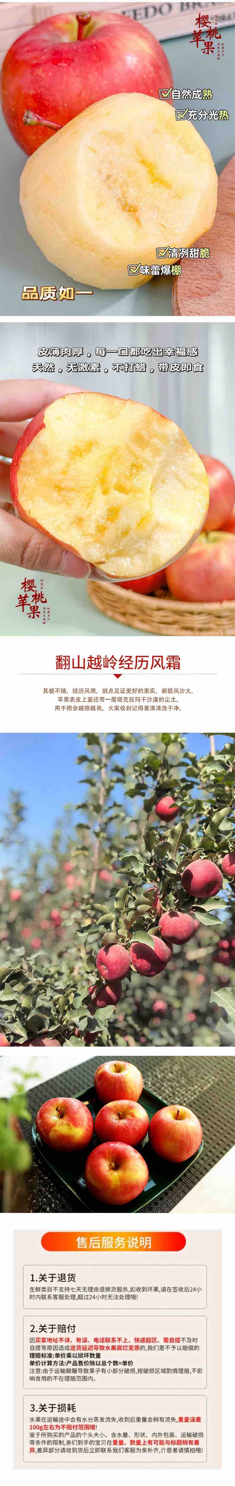 【品名】阿克苏樱桃苹果 【规格】5斤彩箱装(10-14枚)/8斤家庭装(15-18枚) 【产地】新疆.阿克苏 【发货地】新疆阿克苏/陕西西安 【发货快递】顺丰快递 【发货说明】海南、黑龙江、吉林、辽宁、内蒙、西藏、新疆不发(零度以下慎重下单,冻伤不售后),其他地区包邮(市级以下地址,由于时效不稳定,售后不予理赔) 【保存方式】冷藏保存 【发货时效】下单后72小时 【产品售后说明】 1、签收24小时内反馈质量问题,超出时效不予赔付。 2、轻微磕碰不影响食用的不予赔付,坏果每颗按销售价的均价赔付,售后赔偿顾客需要回传快递单号与坏果的合拍照,清晰可见快递单号及坏果部位,不能出示照片的不予赔付。 3、生鲜水果不能拒收,水果外观口感不满意,地址不详,收件人电话不接,签收超时不予赔付。 4、水果产品下单发货后,不支持退单、中途改收件地址。