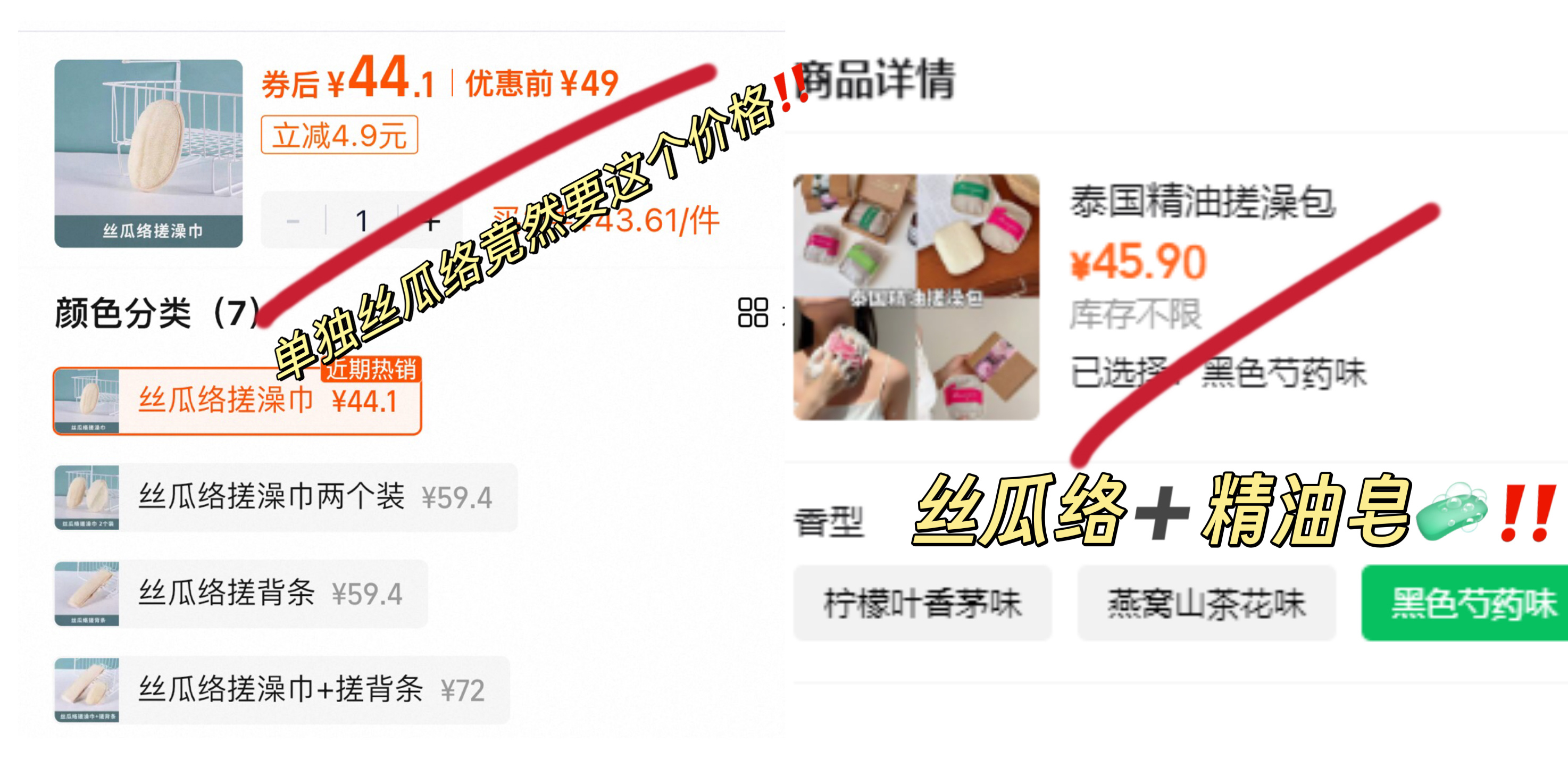 我们这直接给你配好 ——丝瓜络搓澡包➕一块 SPA 精油皂,一套才 45.9❗
