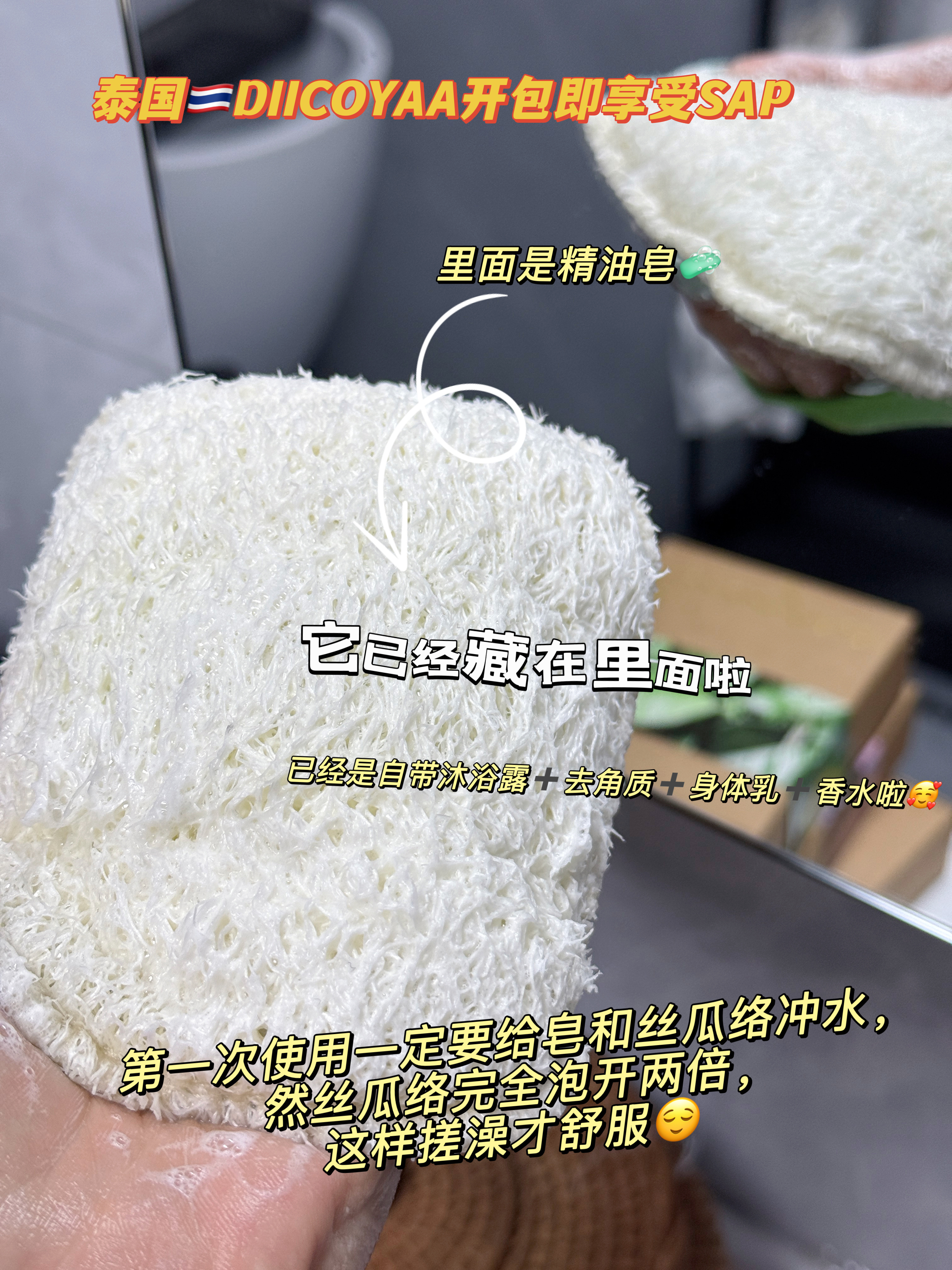 这个搓澡包直接把精油皂和丝瓜络缝一块儿了🉑,拆开就能用❗️