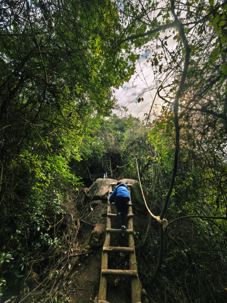 木头梯子、绳索攀爬、手脚并用、野趣十足,山顶视野开阔,穿行嶙峋怪石与原始森林