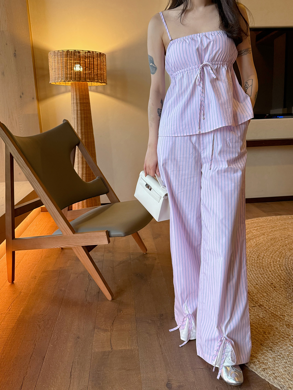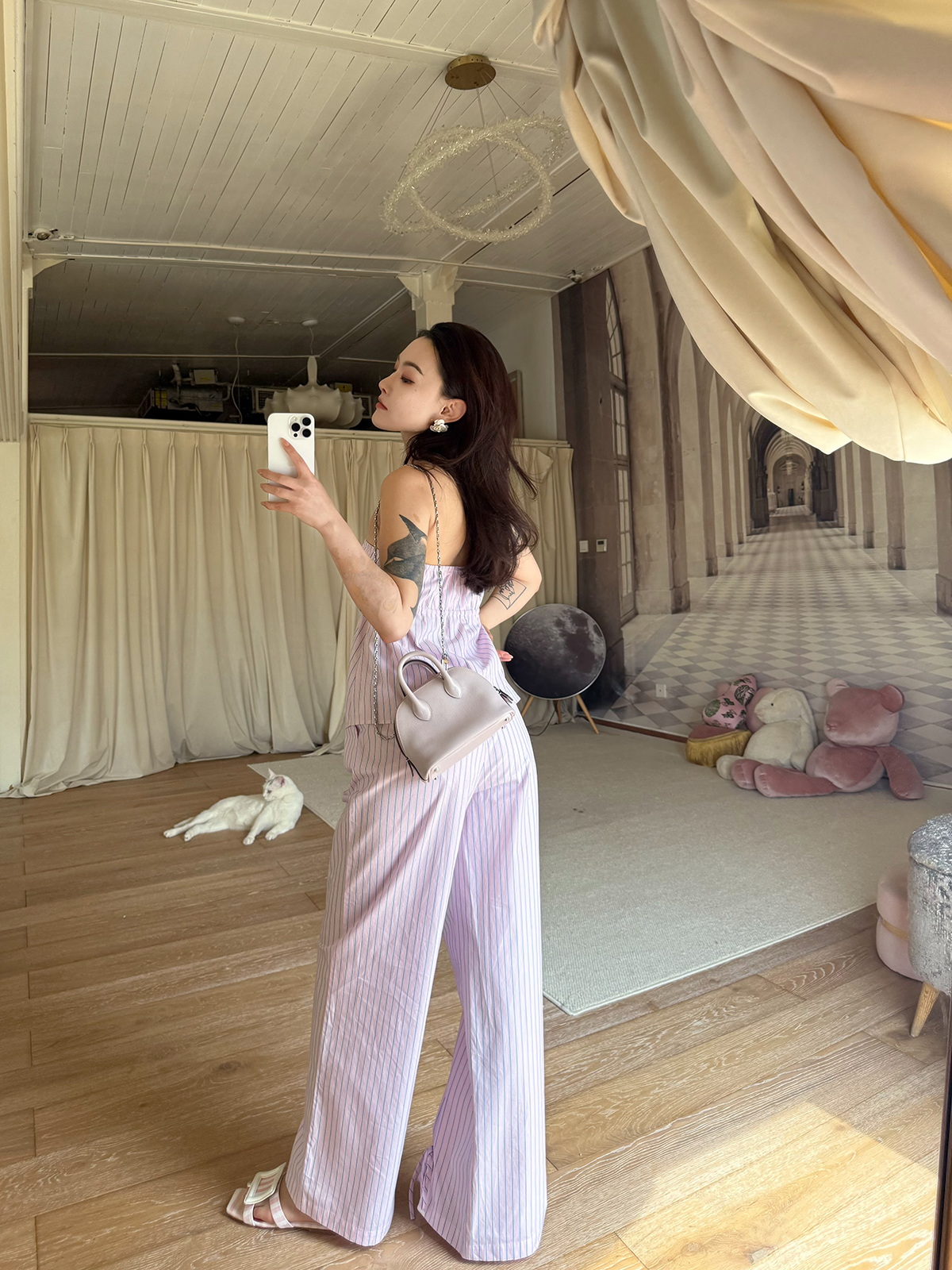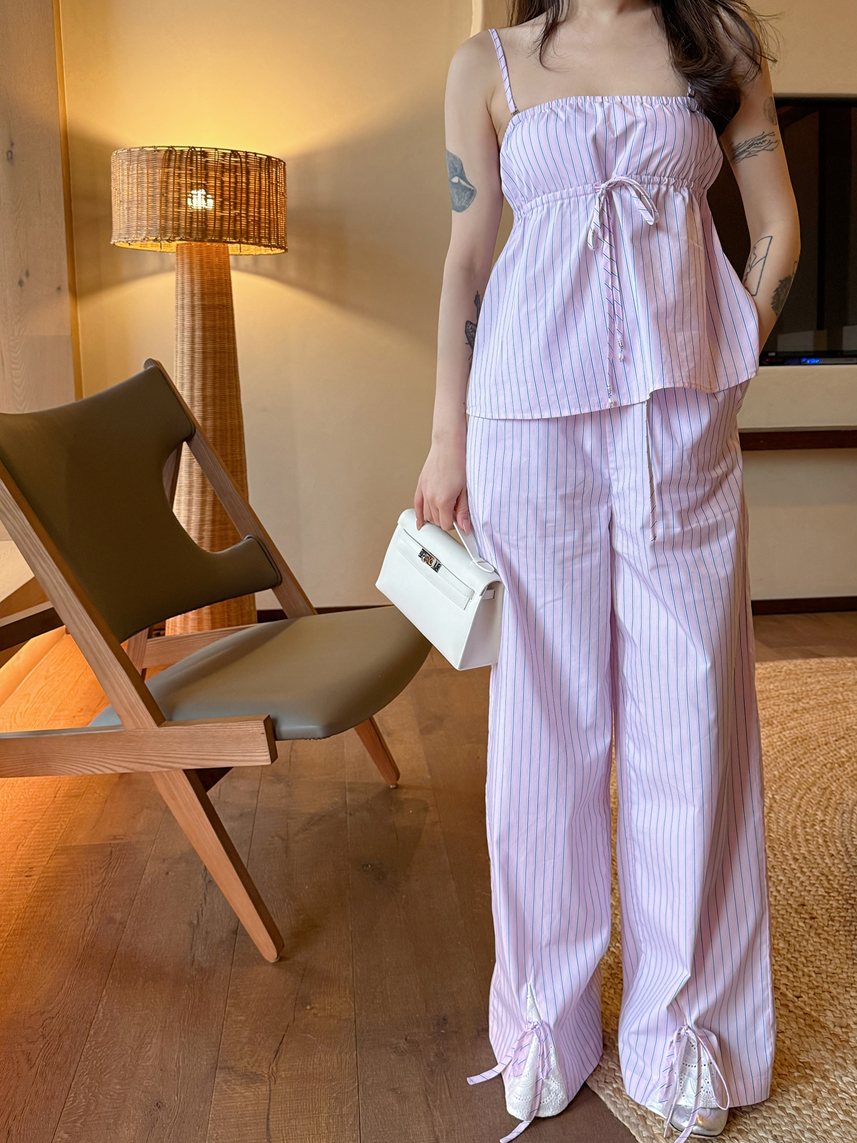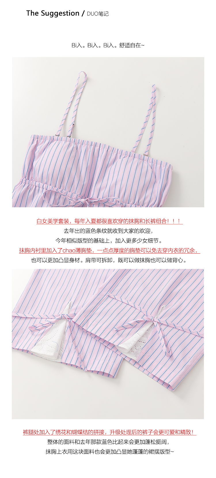 DUO智仙生 粉标 白女美学套装粉红条纹抹胸和阔腿裤