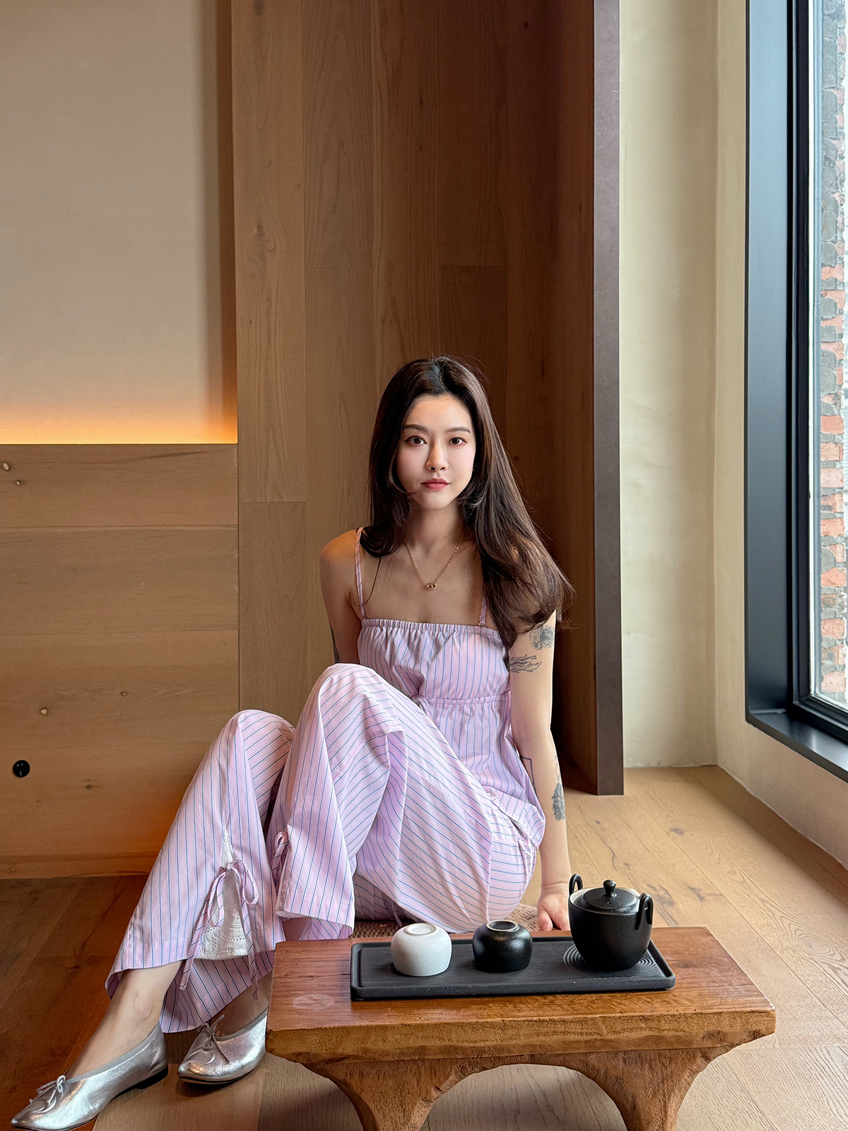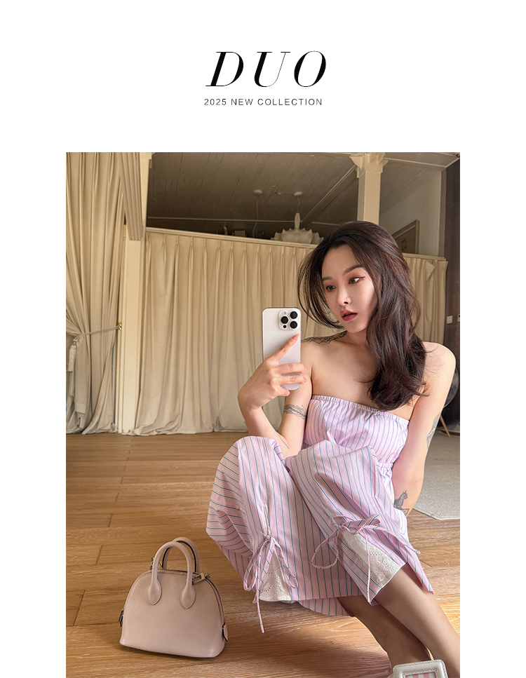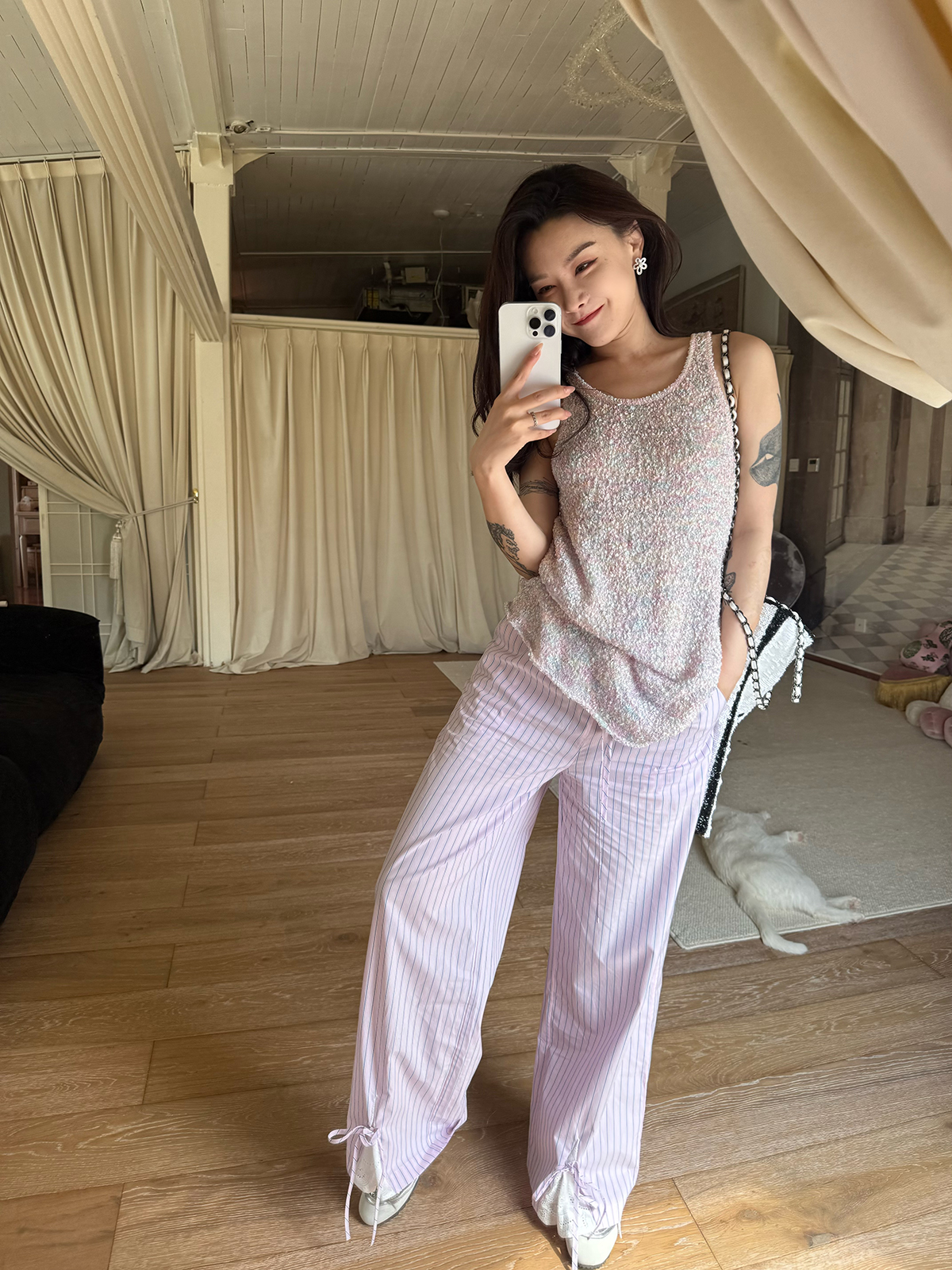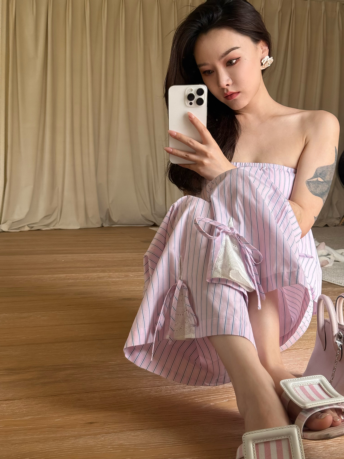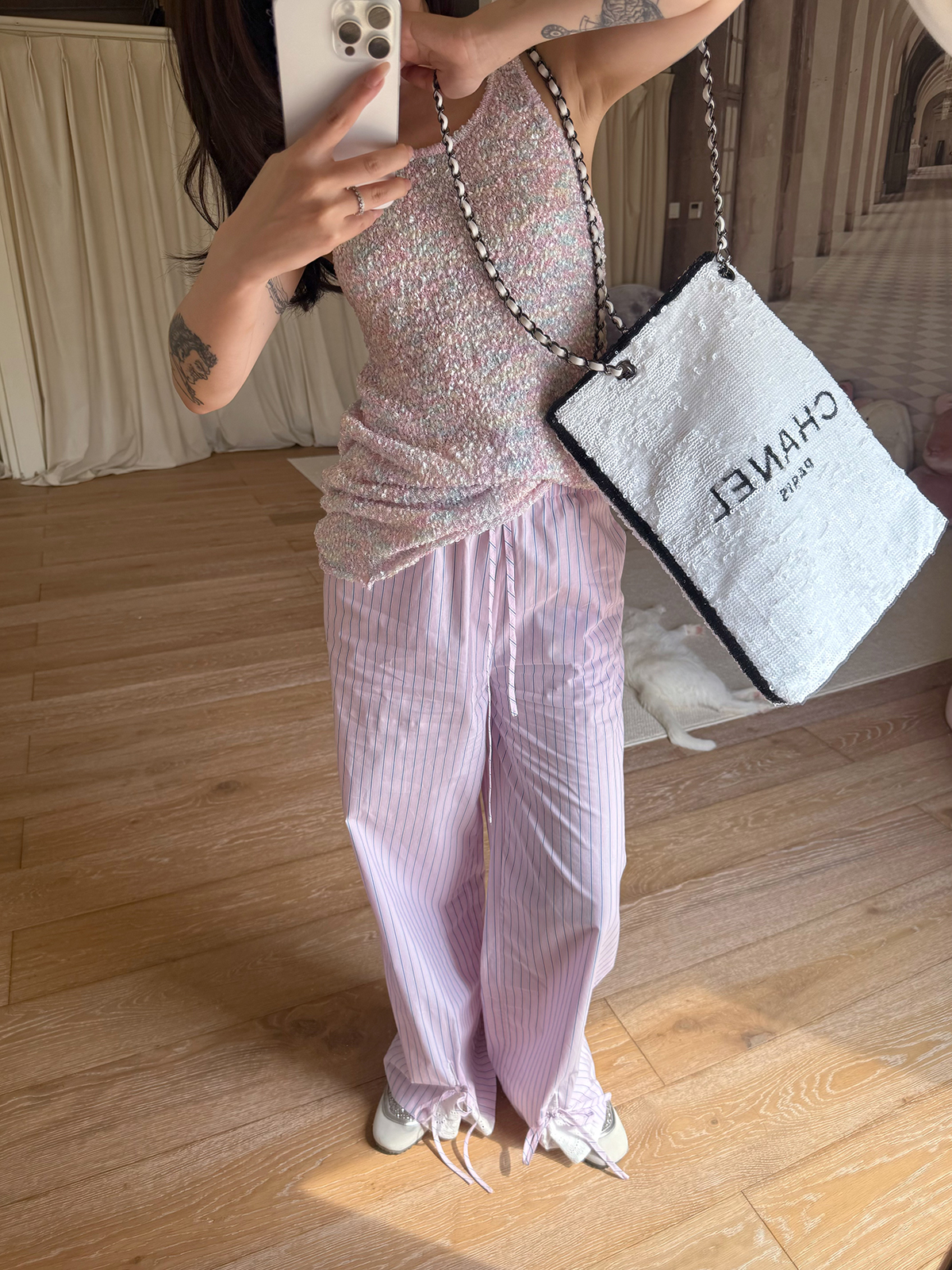DUO智仙生 粉标 白女美学套装粉红条纹抹胸和阔腿裤