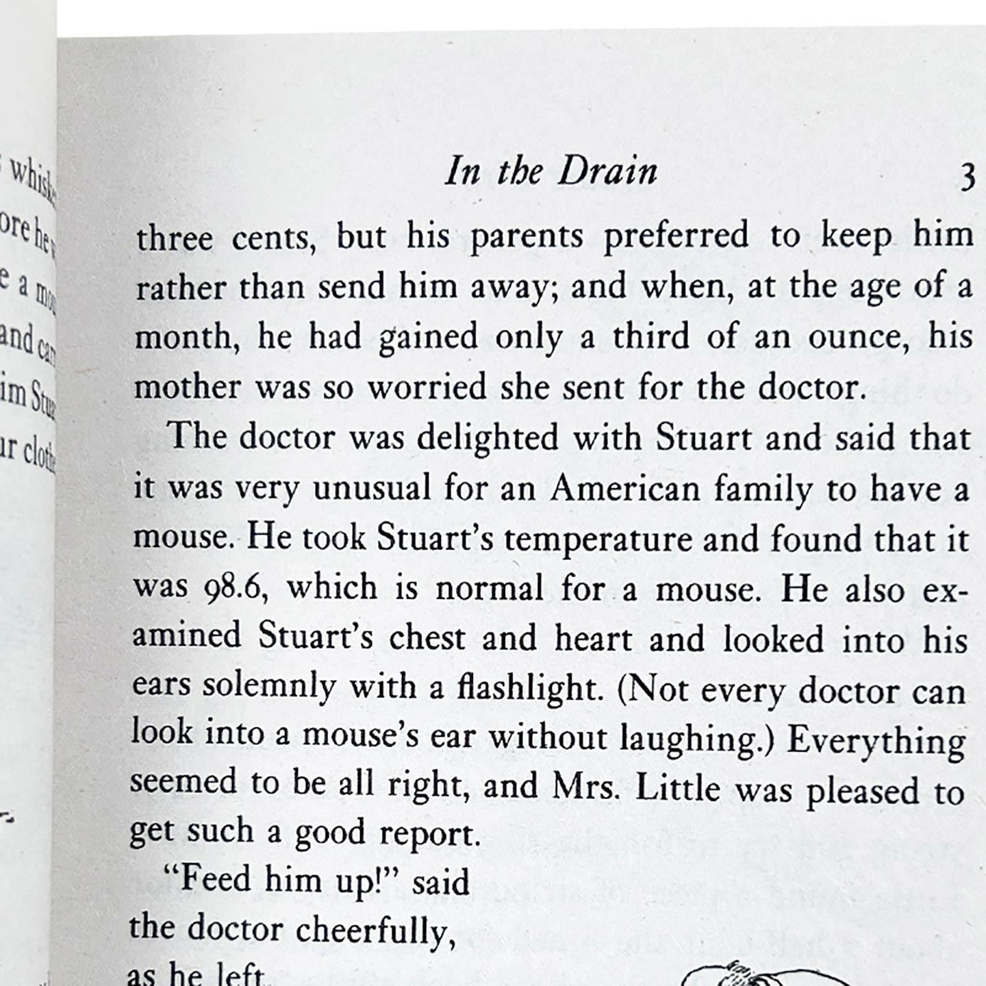 The doctor was delighted with Stuart and said that it was very unusual for an American family to have a mouse. He took Stuart’s temperature and found that it was 98.6, which is normal for a mouse. He also examined Stuart’s chest and heart and looked into his ears solemnly with a flashlight. (Not every doctor can look into a mouse’s ear without laughing.) Everything seemed to be all right, and Mrs. Little was pleased to get such a good report.