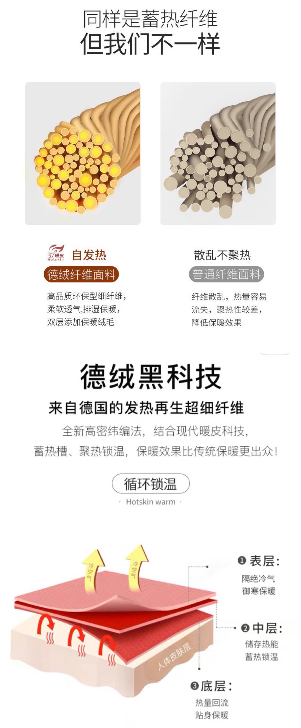 它采用德国拜耳公司授权使用的发热纤维面料——德绒,轻薄一层却温暖加倍!