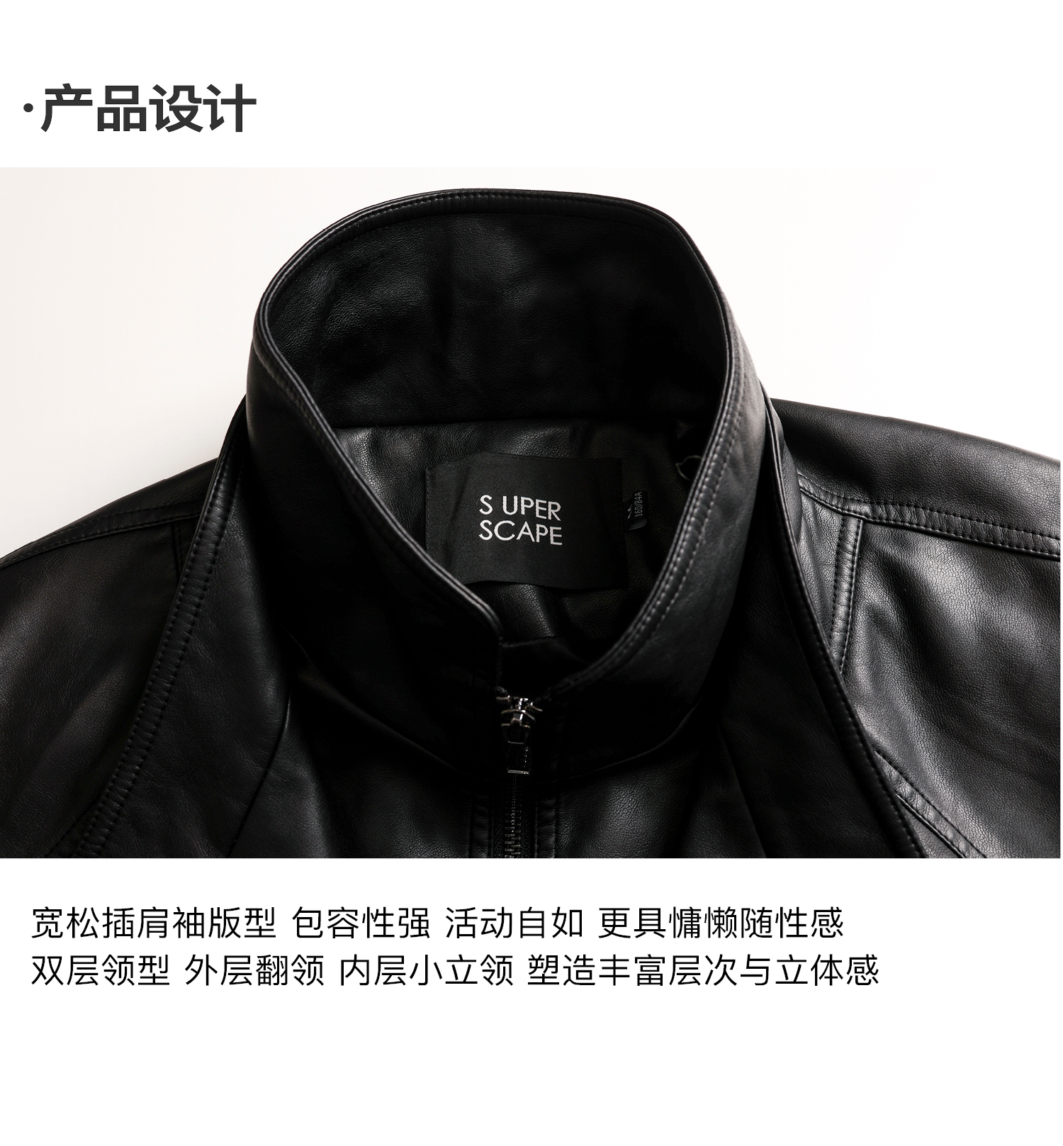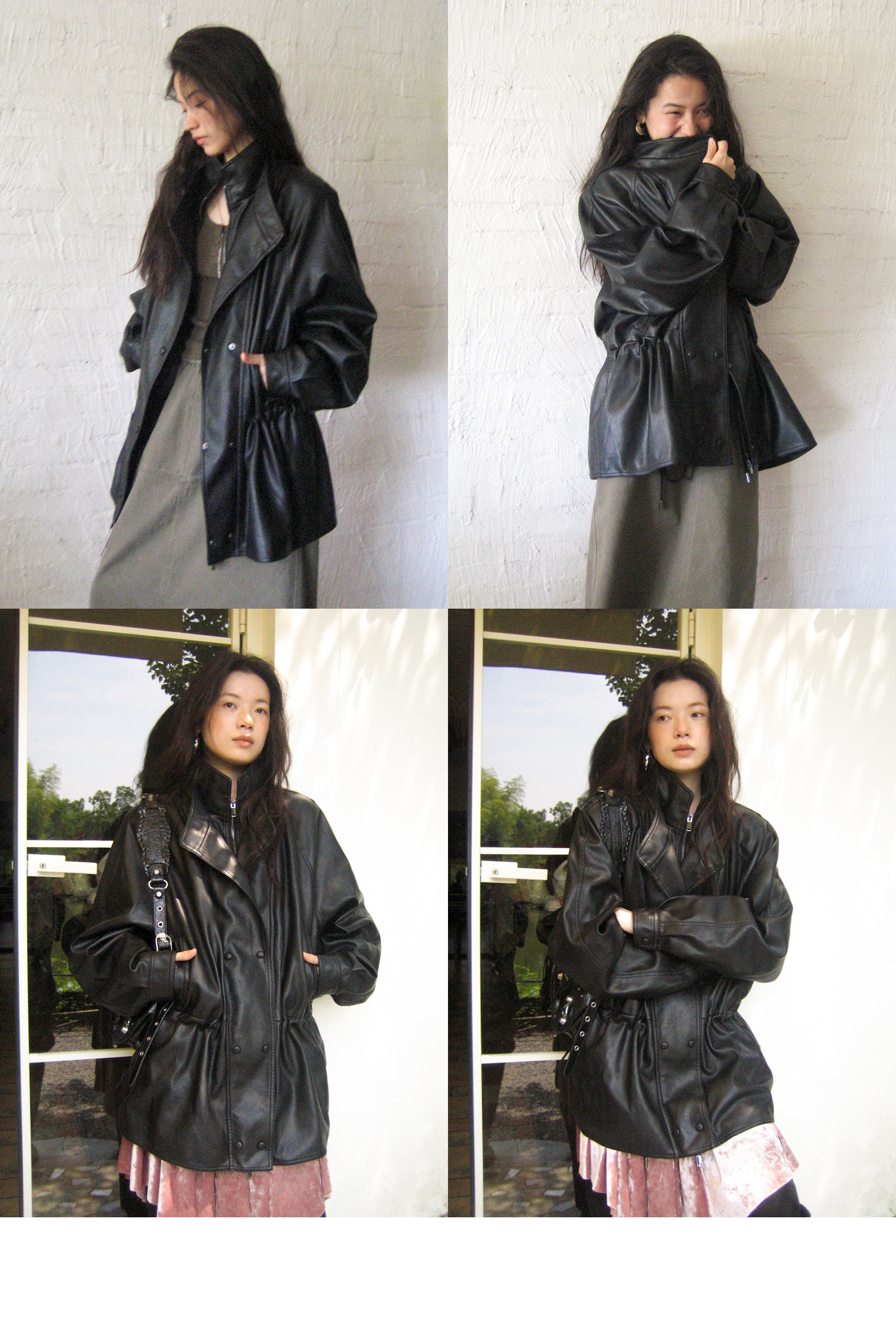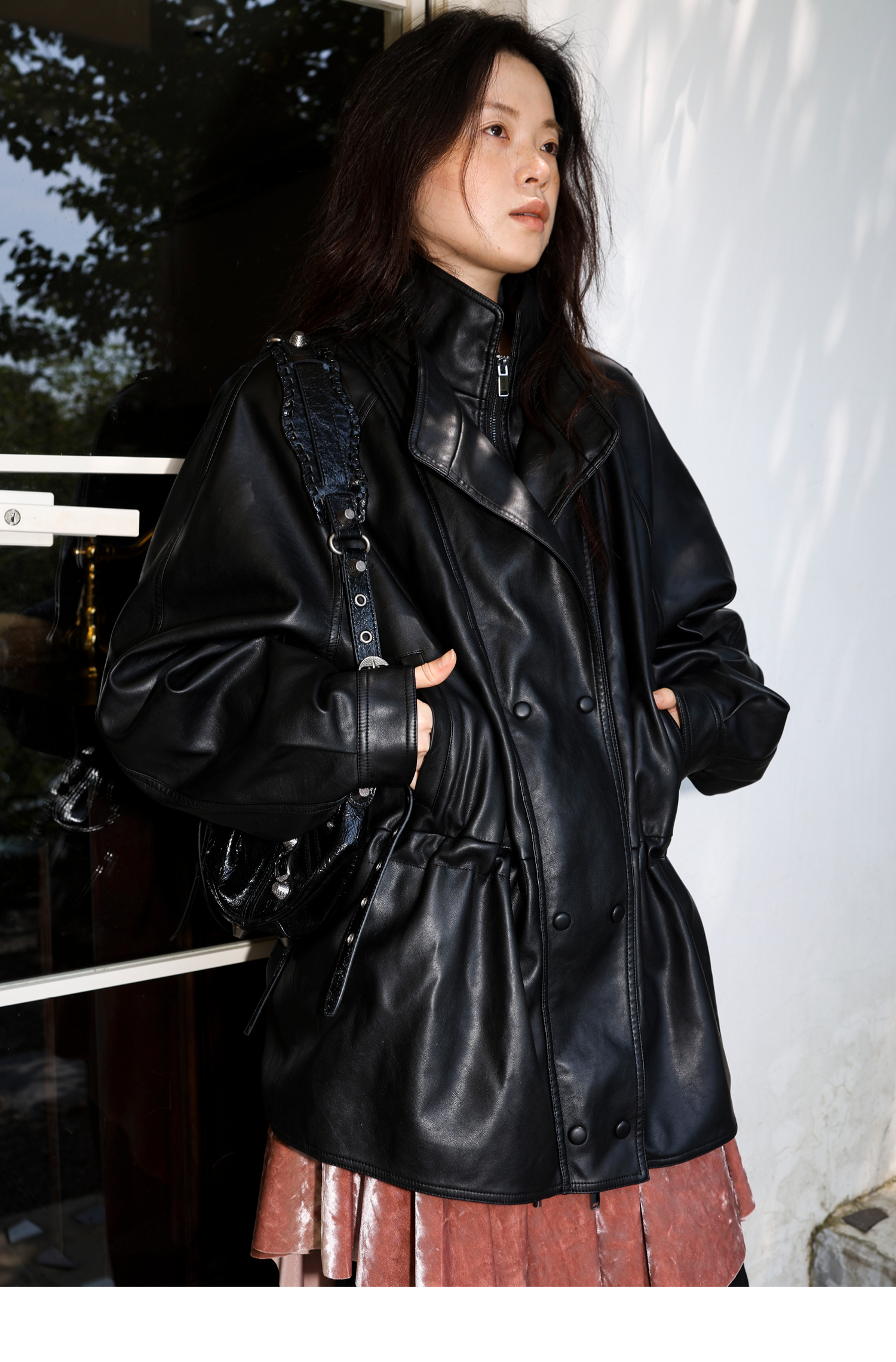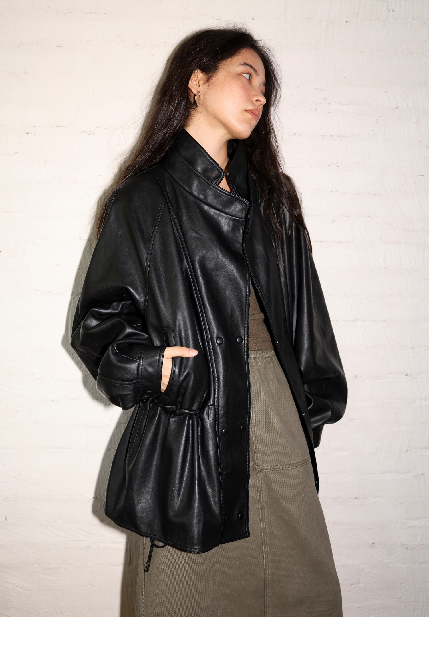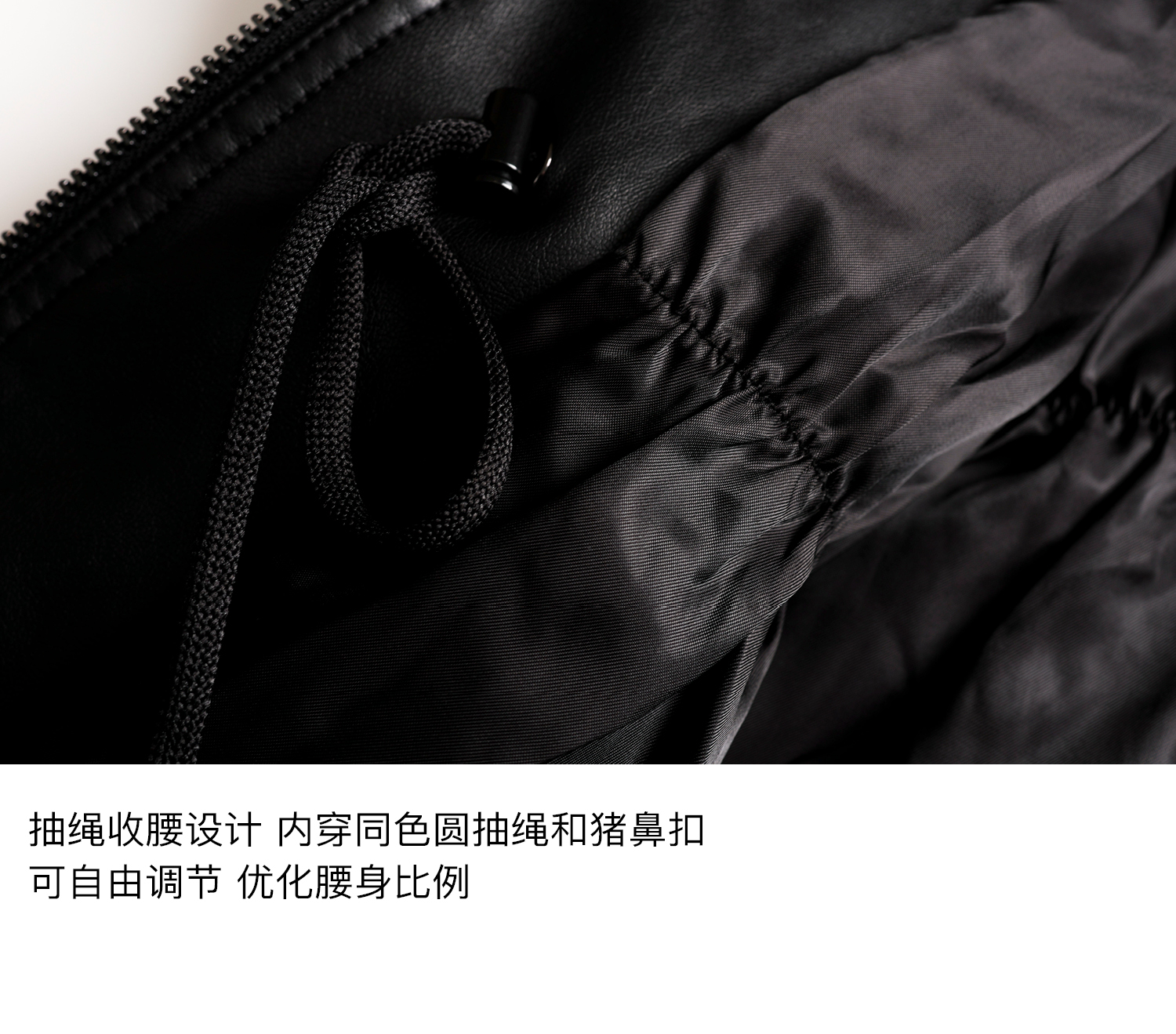 素舶 环保哑光轻洗水抽绳收腰双层立领皮衣夹克