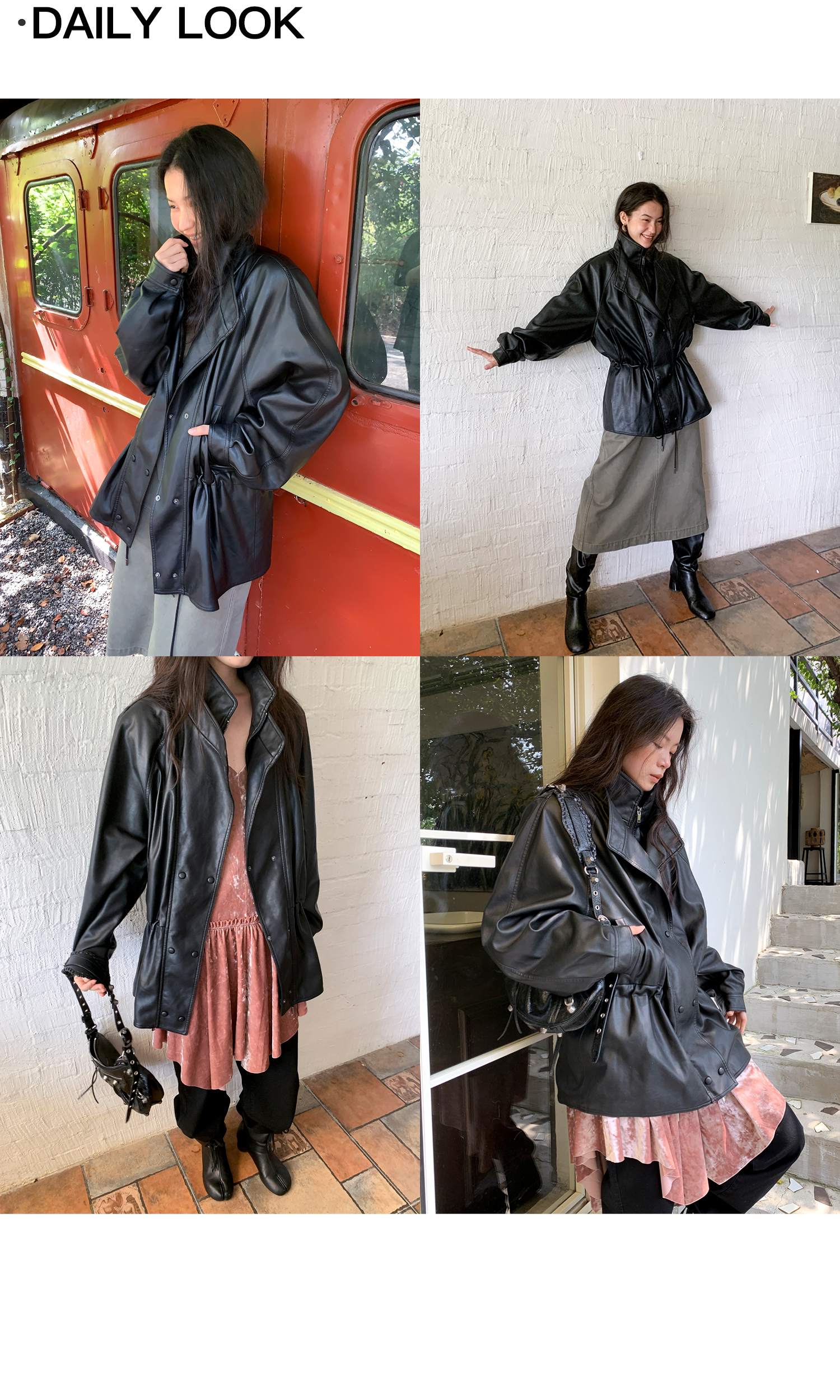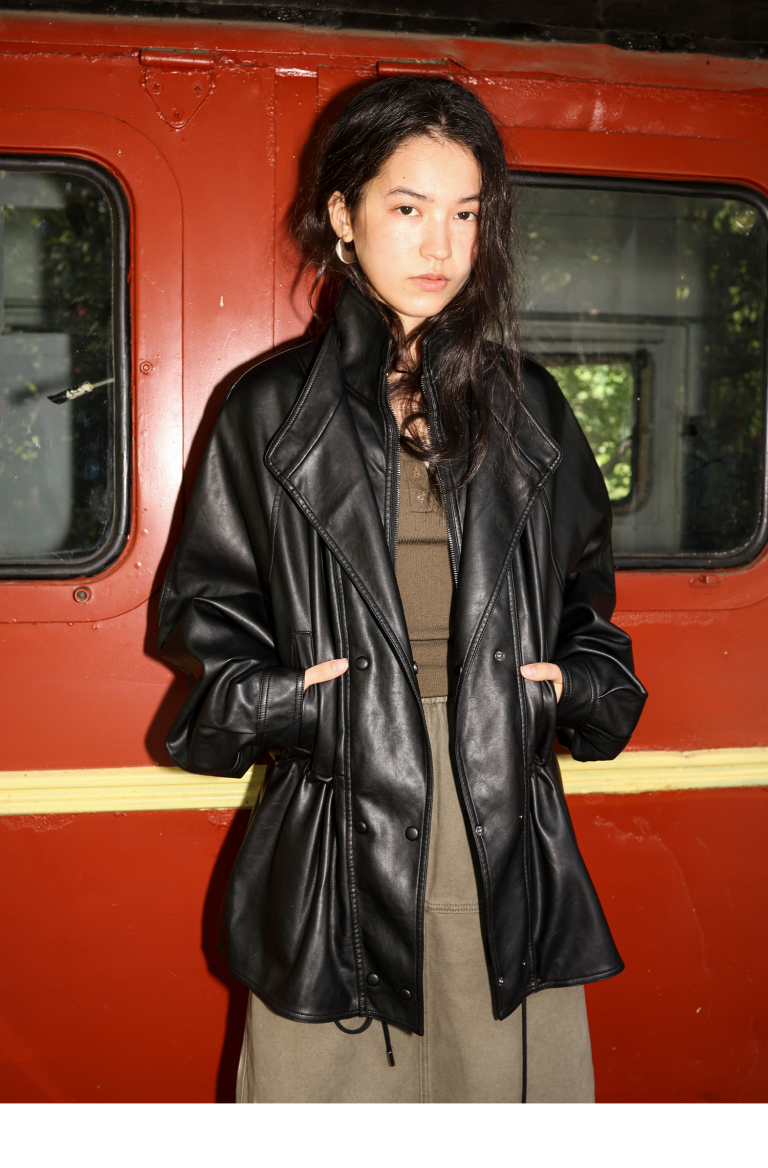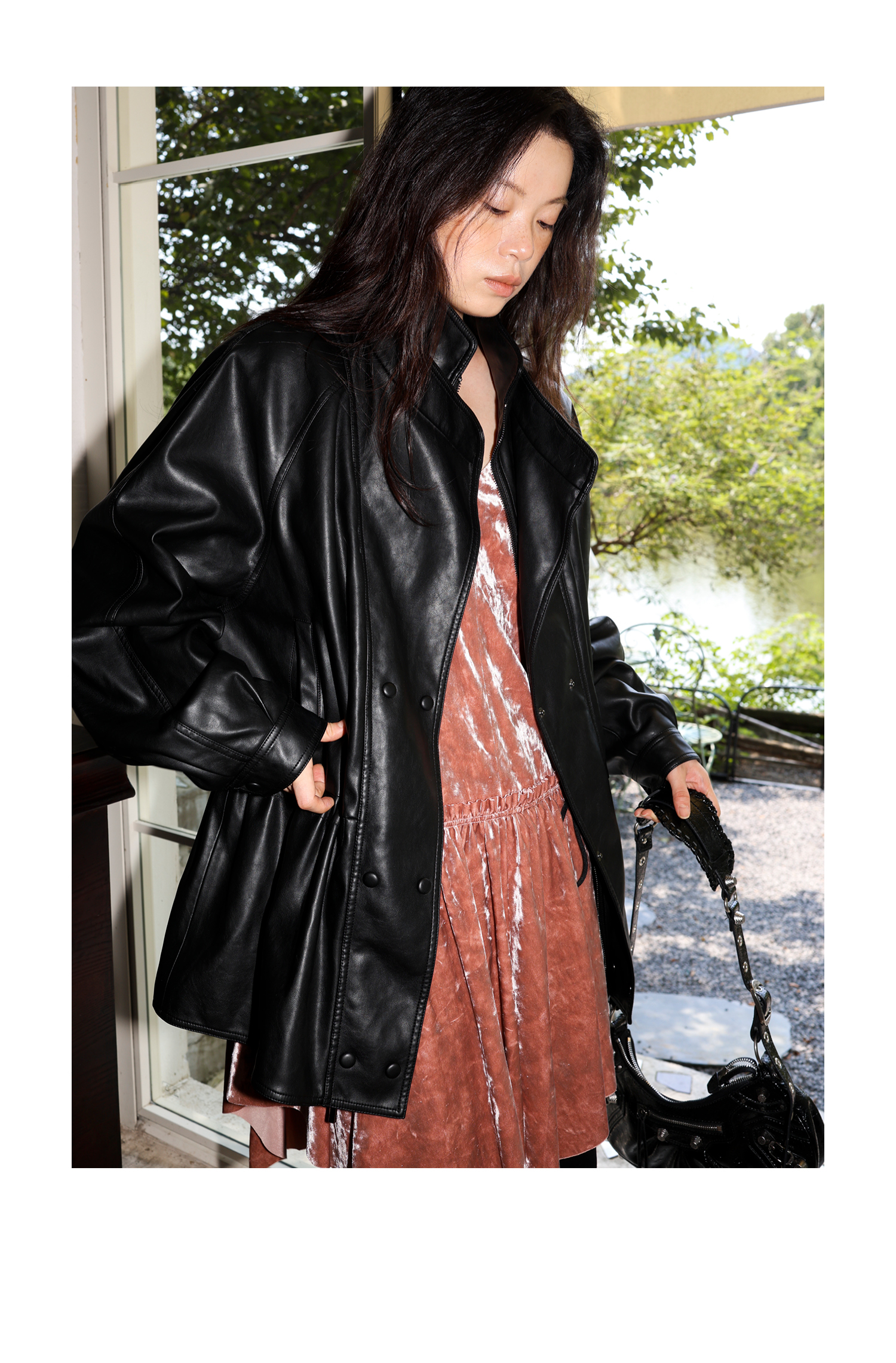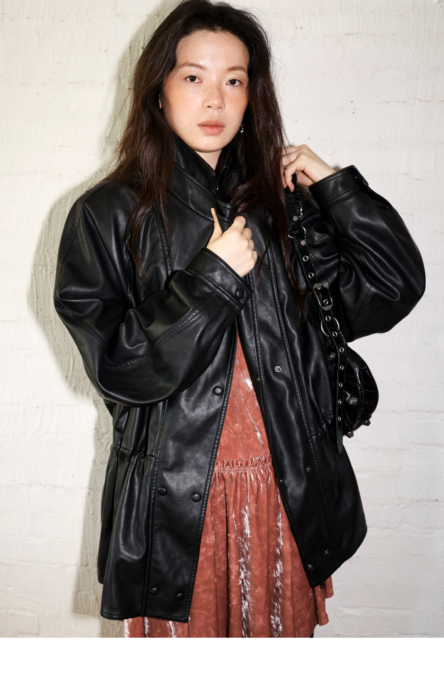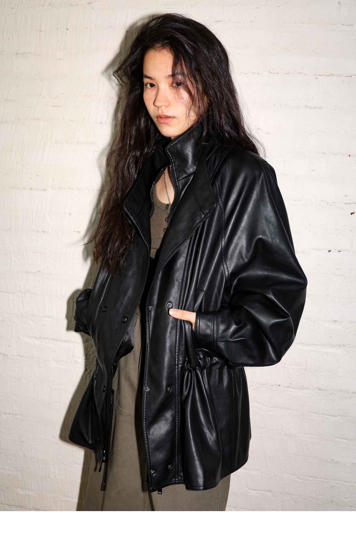 素舶 环保哑光轻洗水抽绳收腰双层立领皮衣夹克