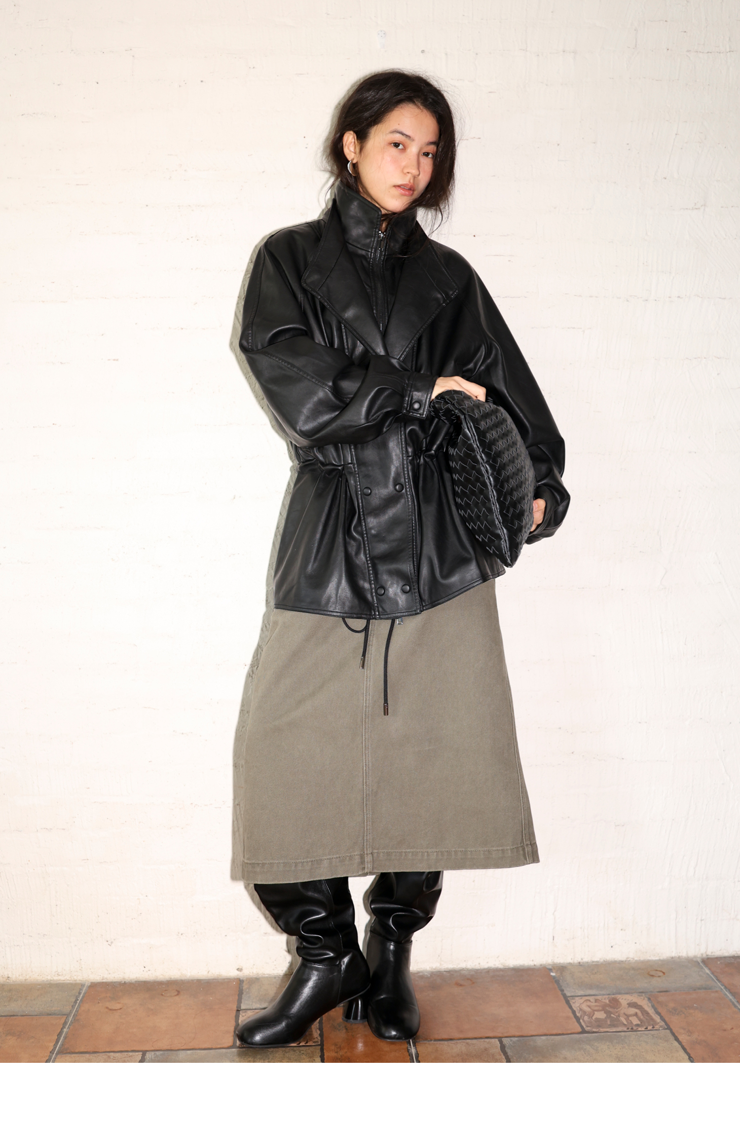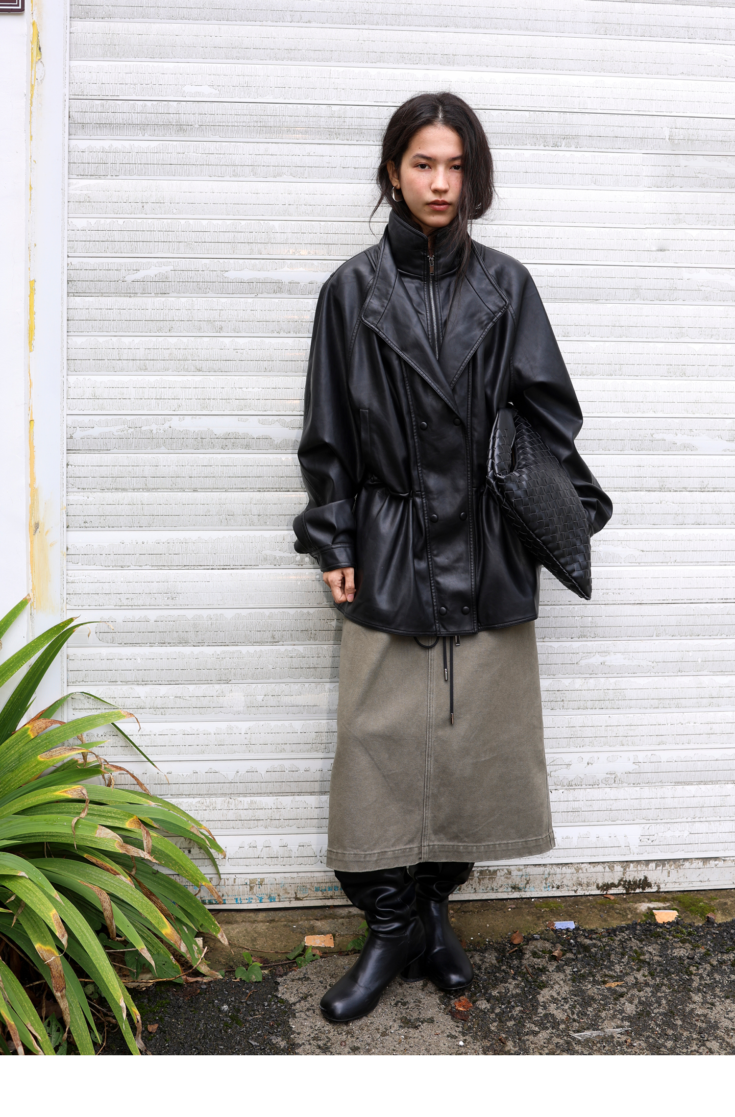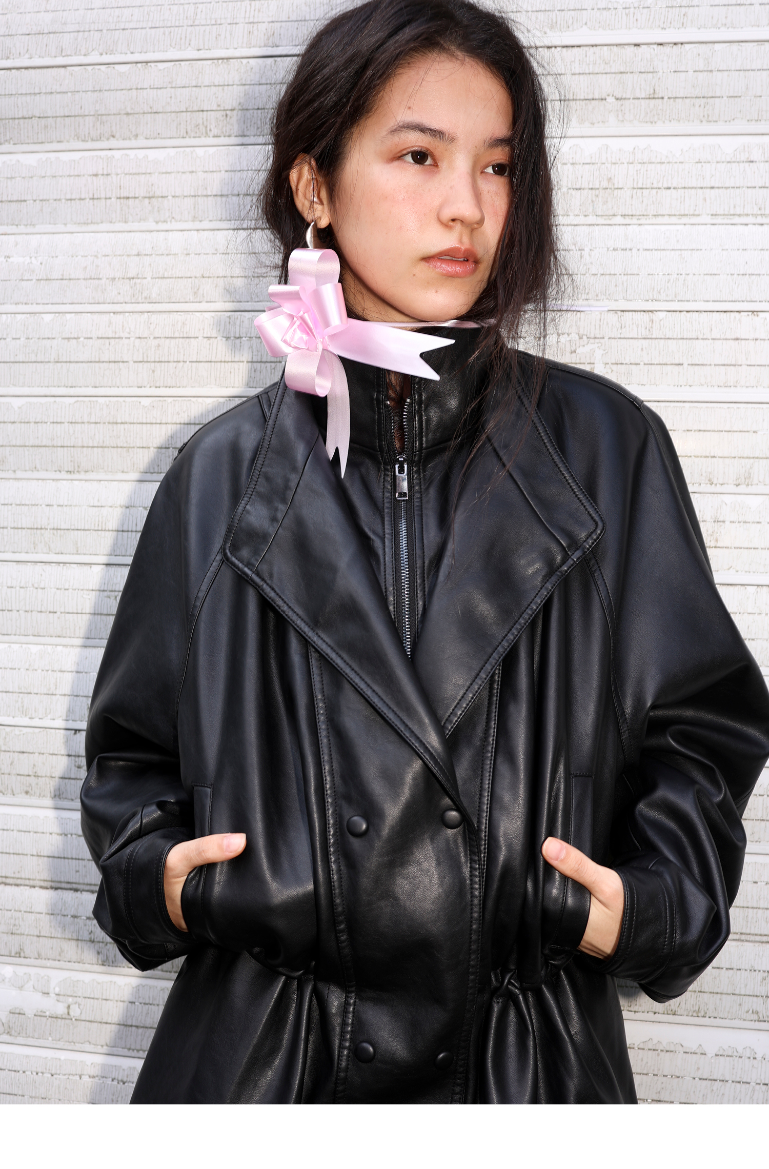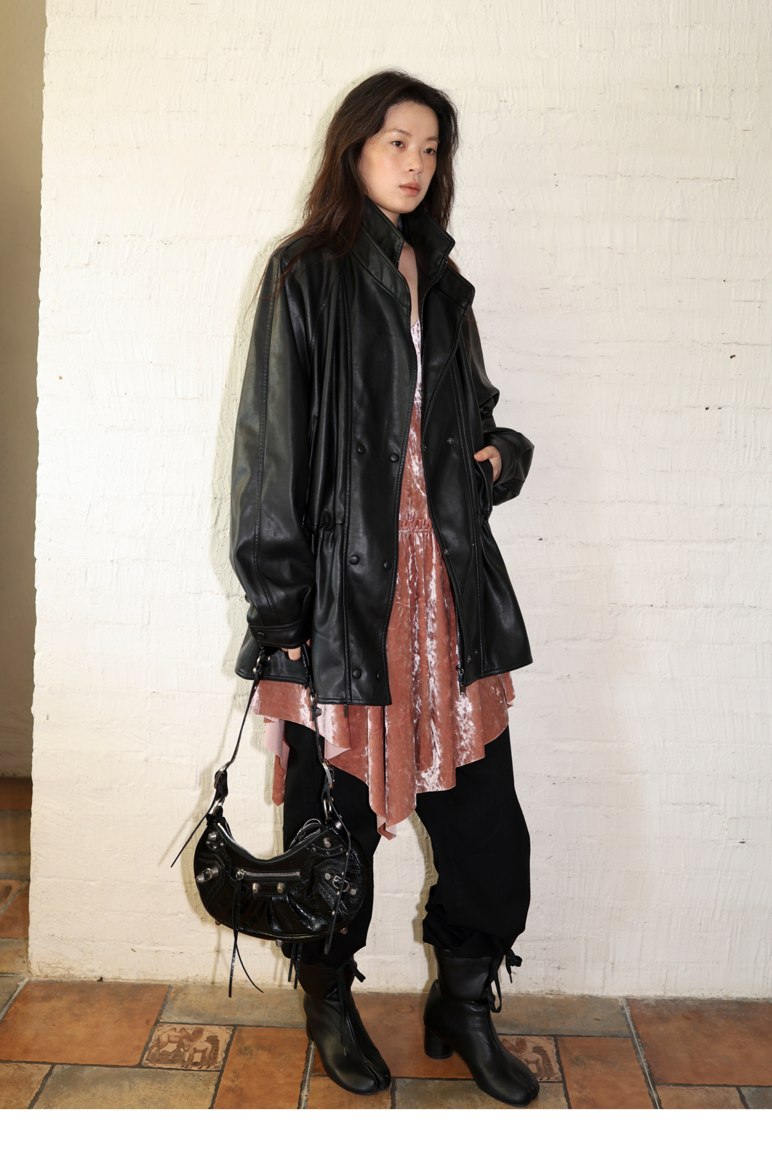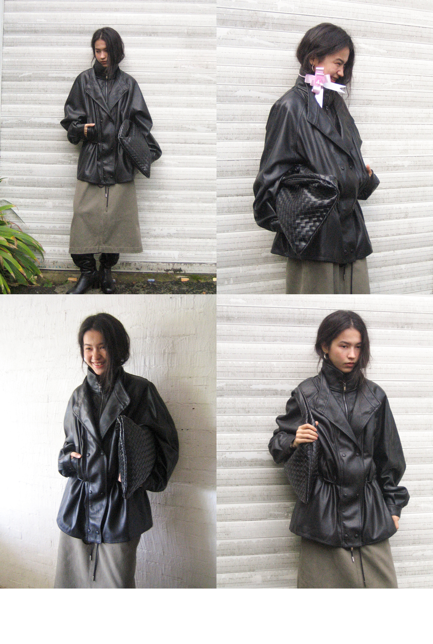 素舶 环保哑光轻洗水抽绳收腰双层立领皮衣夹克