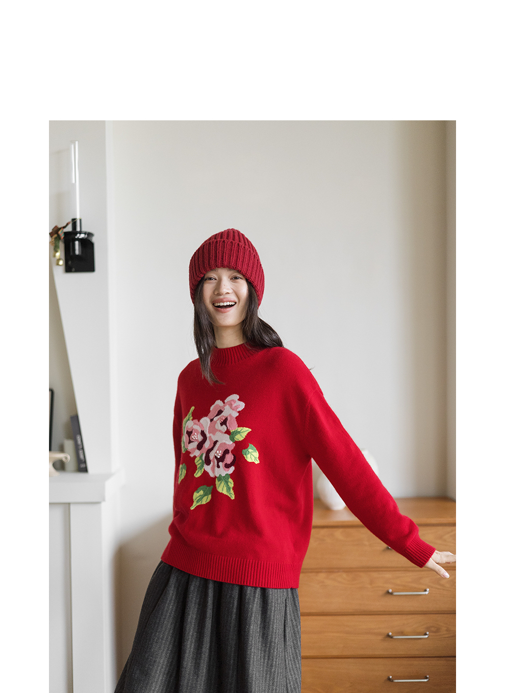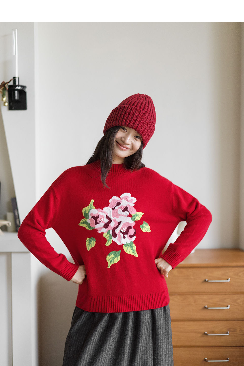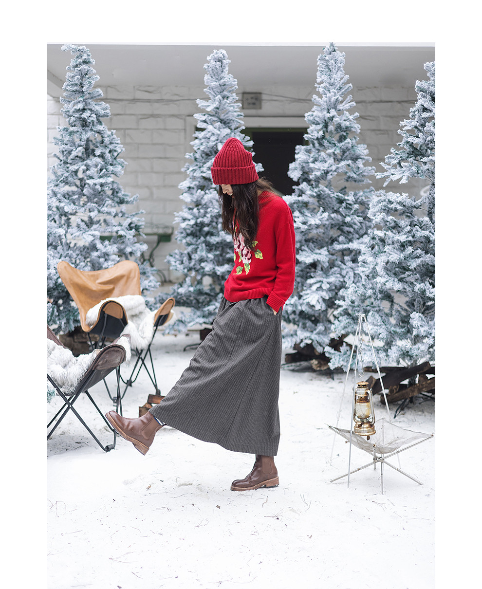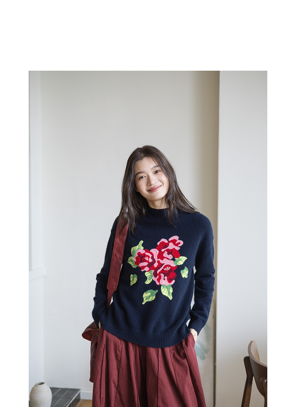 绽放823朵/纯山羊绒毛衫撞色花朵落肩半高领套头毛针织衫内搭毛衣