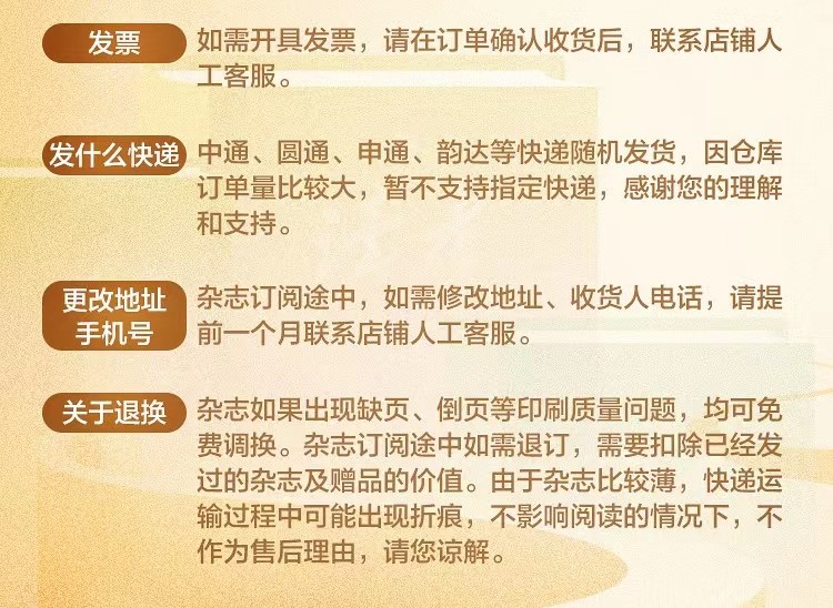 订阅期内,每月25号前发次月的一本杂志,如遇春节等节假日发货稍有延迟,感谢您的理解与支持