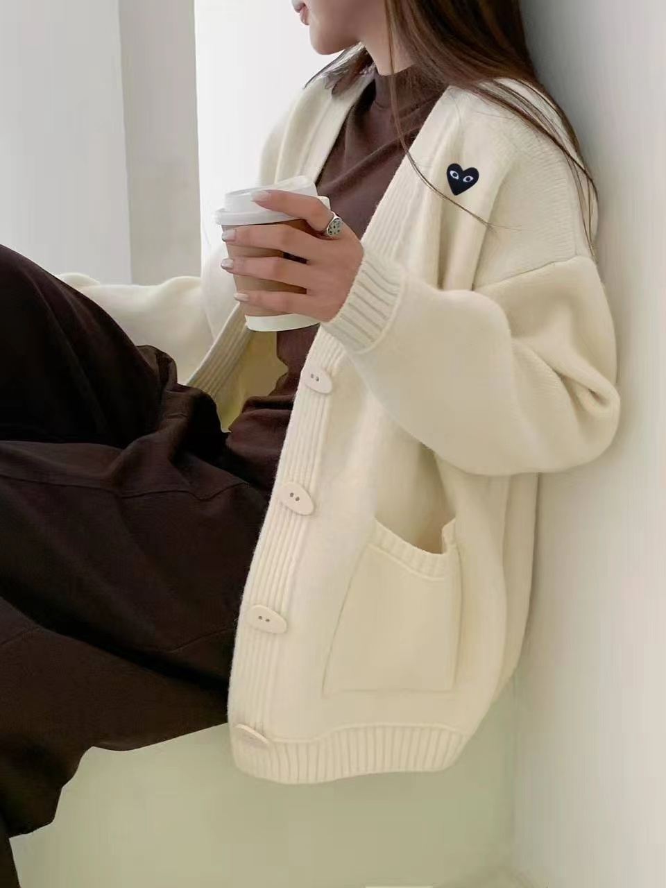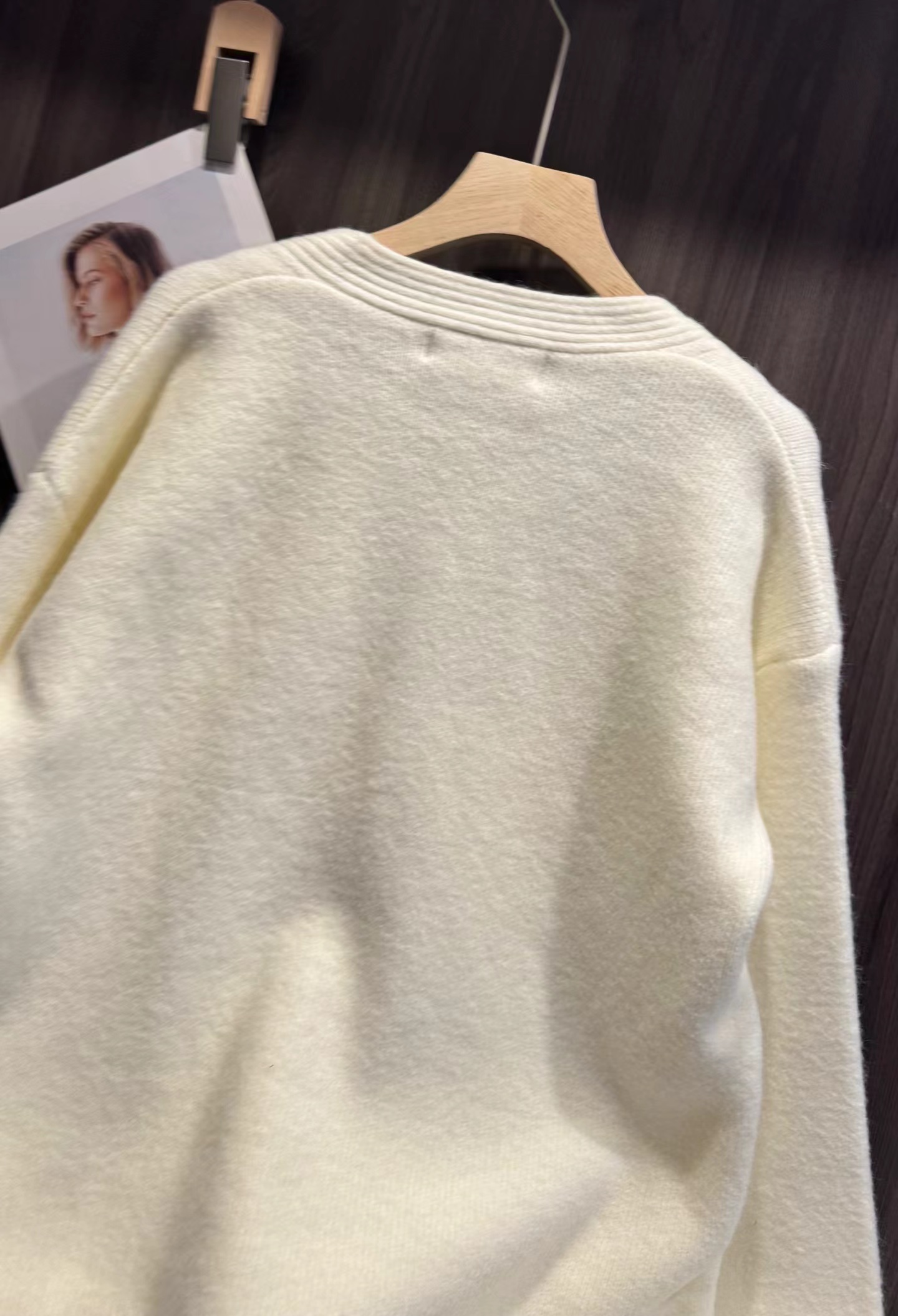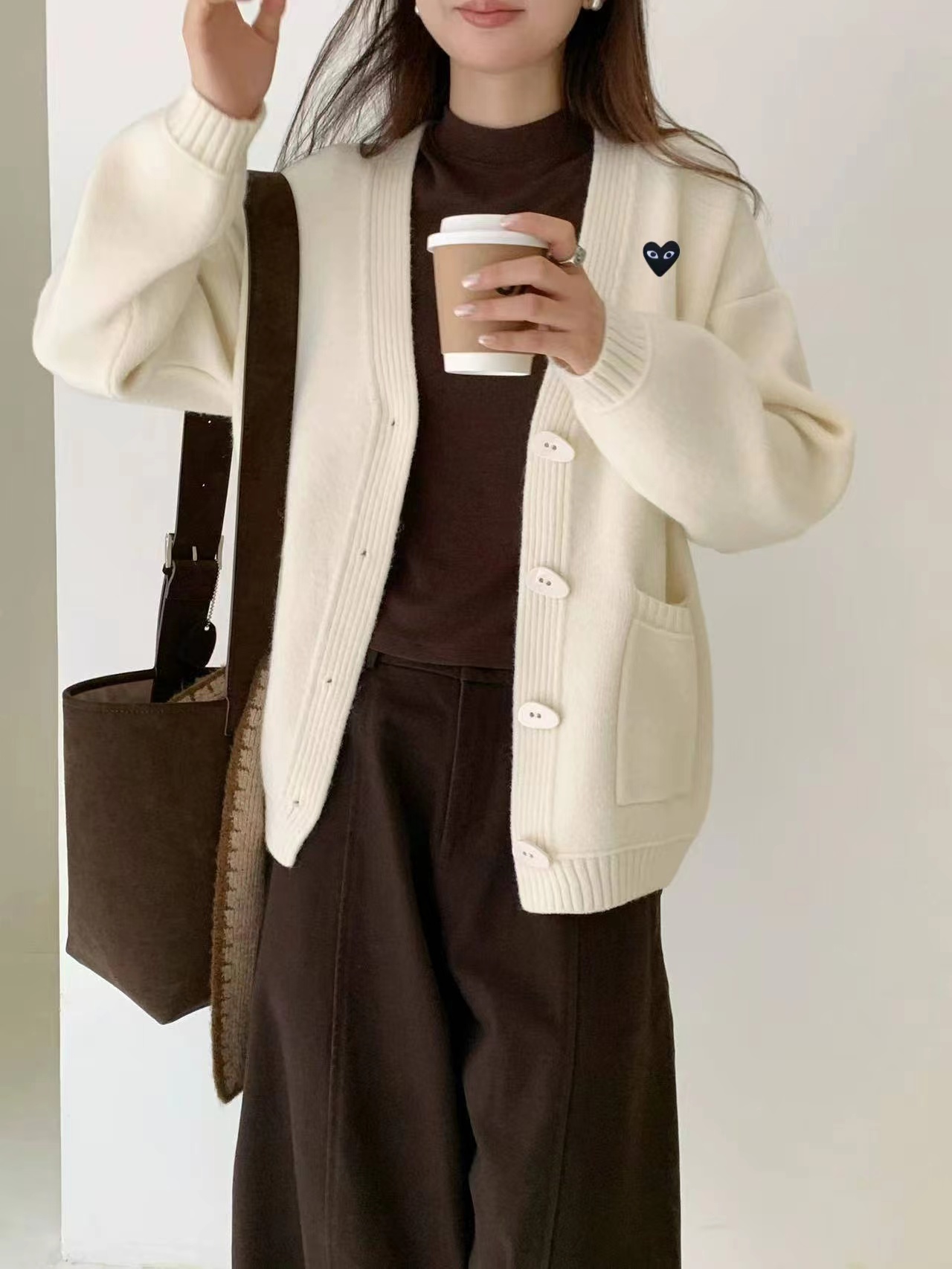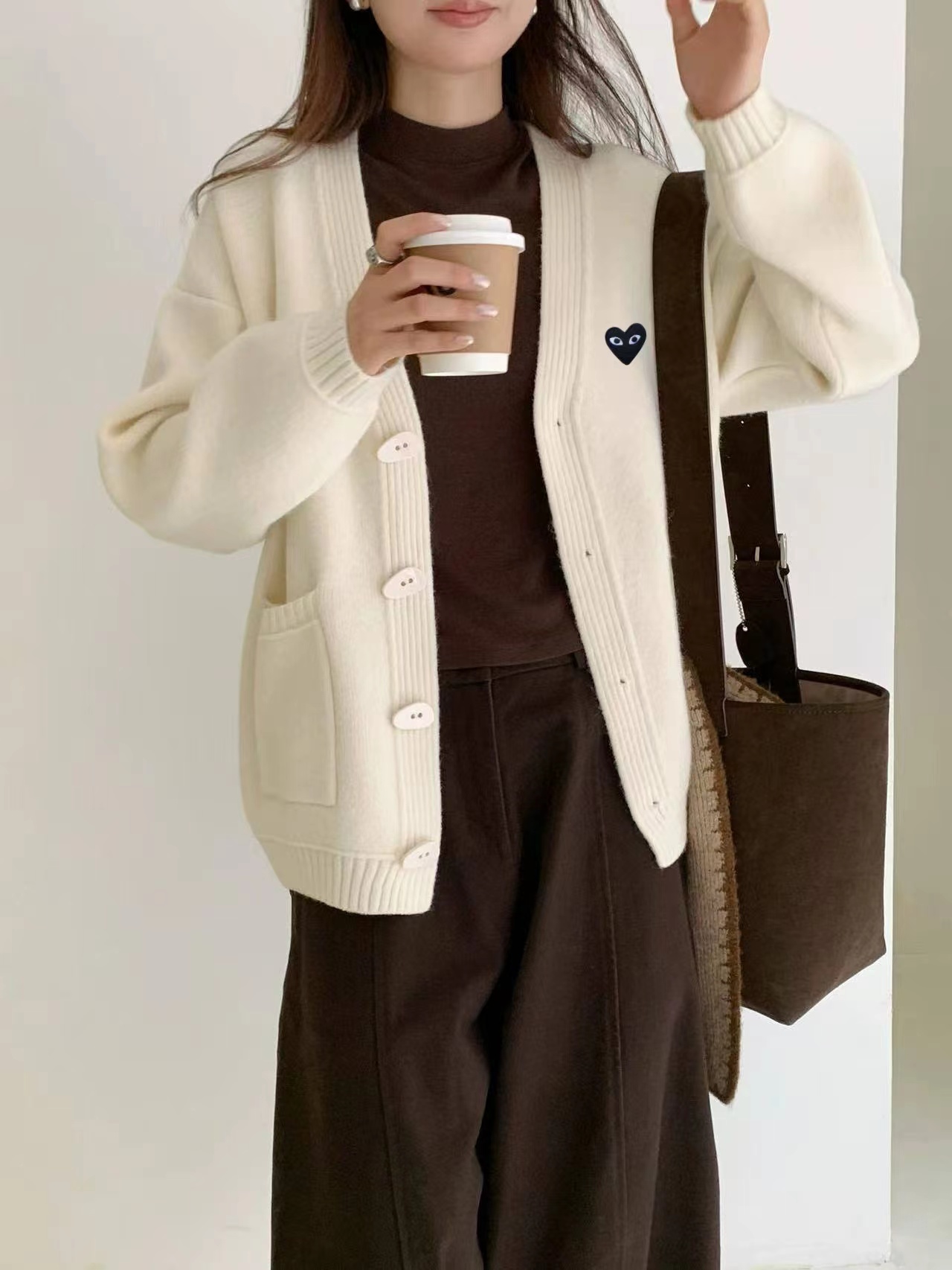 毛衣米白色V领针织开衫,整体风格温柔简约,是兼具舒适与质感的百搭单品。宽松落肩版型,包容度高,不挑身材,自带慵懒随性的氛围感,衣长及胯,能有效修饰腰胯线条。门襟采用四颗质感圆润的同色系纽扣,简约利落,与整体色调融为一体。两侧设有方形贴袋,兼具实用性与装饰性,可放置随身小物,也丰富了视觉层次。?左胸位置点缀了一枚标志性的黑色爱心小标,带有独特的品牌辨识度,为简约版型增添了设计感。袖口与下摆均采用罗纹收边设计,弹性佳且不易变形,贴合身形的同时能锁住暖意。采用细腻柔软的针织面料,亲肤保暖,触感软糯,适合春秋单穿或秋冬叠穿。可参考图中搭配,内搭深咖色高领打底衫,下装同色系阔腿裤,整体配色和谐羔级,通勤、休闲场景均适配;也可内搭T恤、衬衫,打造多种风格造型。