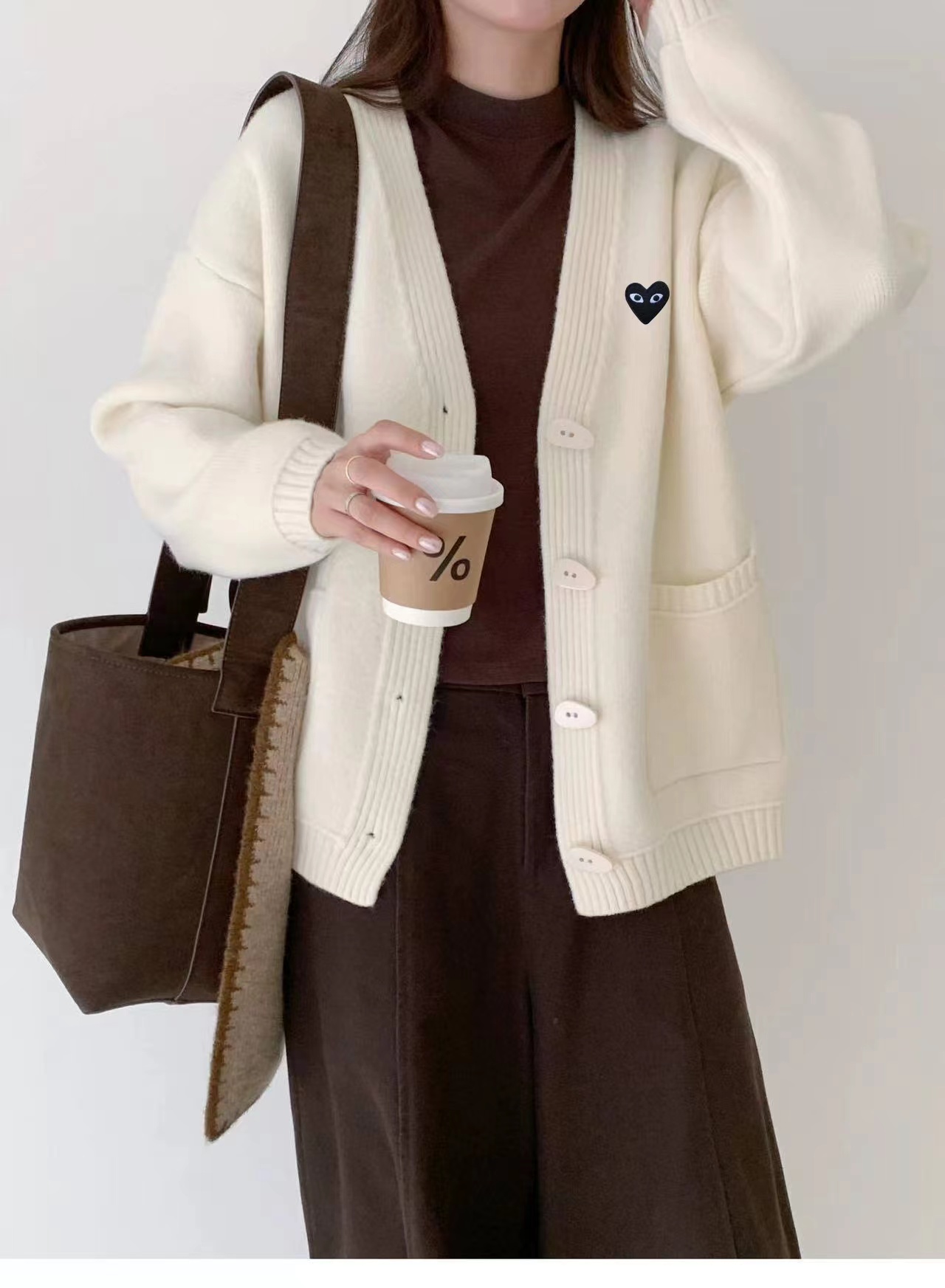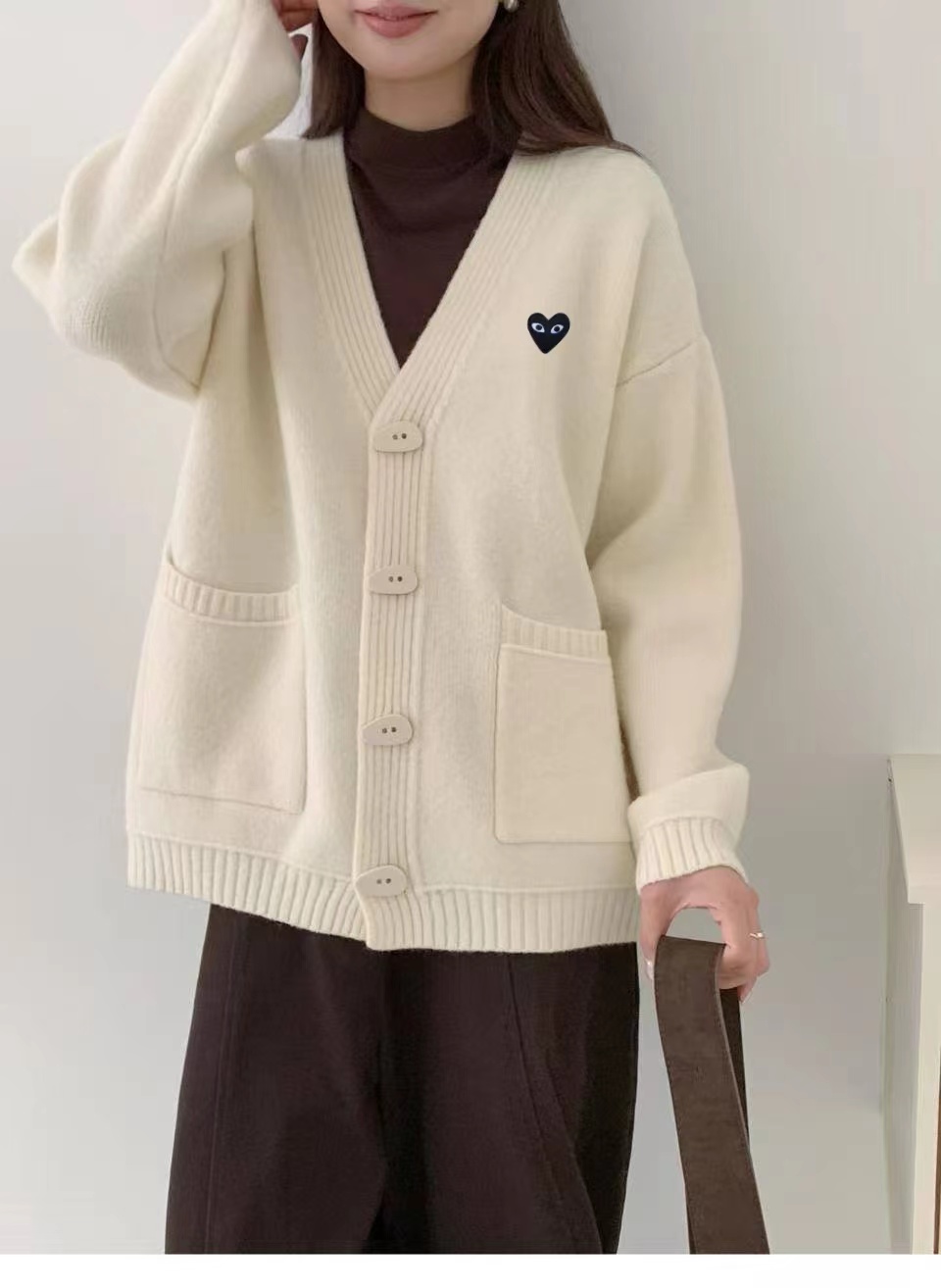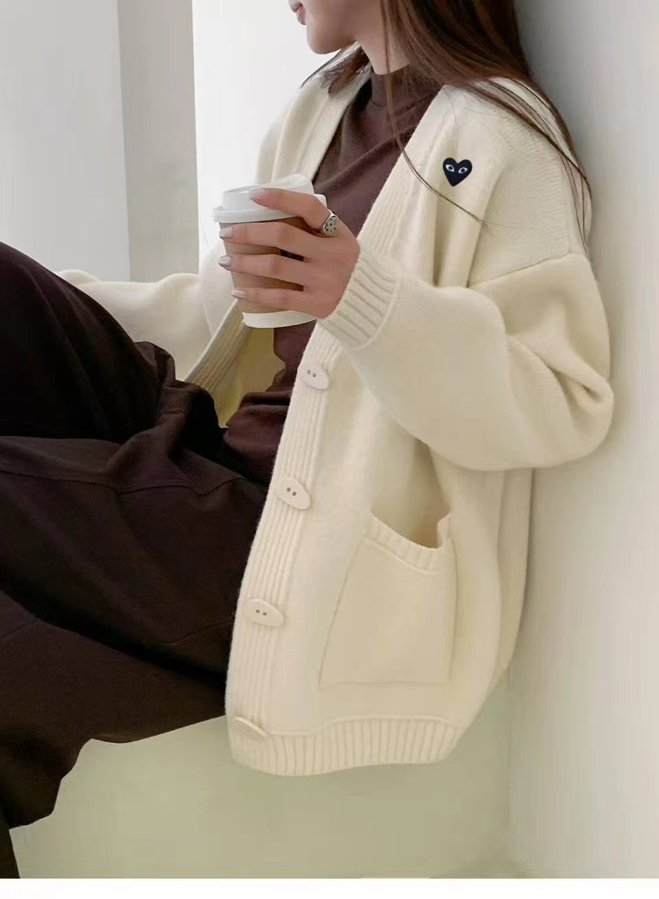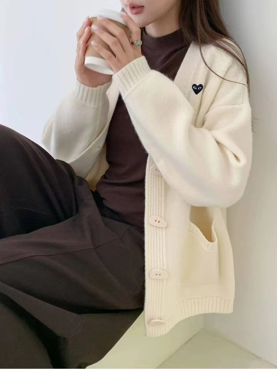 毛衣米白色V领针织开衫,整体风格温柔简约,是兼具舒适与质感的百搭单品。宽松落肩版型,包容度高,不挑身材,自带慵懒随性的氛围感,衣长及胯,能有效修饰腰胯线条。门襟采用四颗质感圆润的同色系纽扣,简约利落,与整体色调融为一体。两侧设有方形贴袋,兼具实用性与装饰性,可放置随身小物,也丰富了视觉层次。?左胸位置点缀了一枚标志性的黑色爱心小标,带有独特的品牌辨识度,为简约版型增添了设计感。袖口与下摆均采用罗纹收边设计,弹性佳且不易变形,贴合身形的同时能锁住暖意。采用细腻柔软的针织面料,亲肤保暖,触感软糯,适合春秋单穿或秋冬叠穿。可参考图中搭配,内搭深咖色高领打底衫,下装同色系阔腿裤,整体配色和谐羔级,通勤、休闲场景均适配;也可内搭T恤、衬衫,打造多种风格造型。