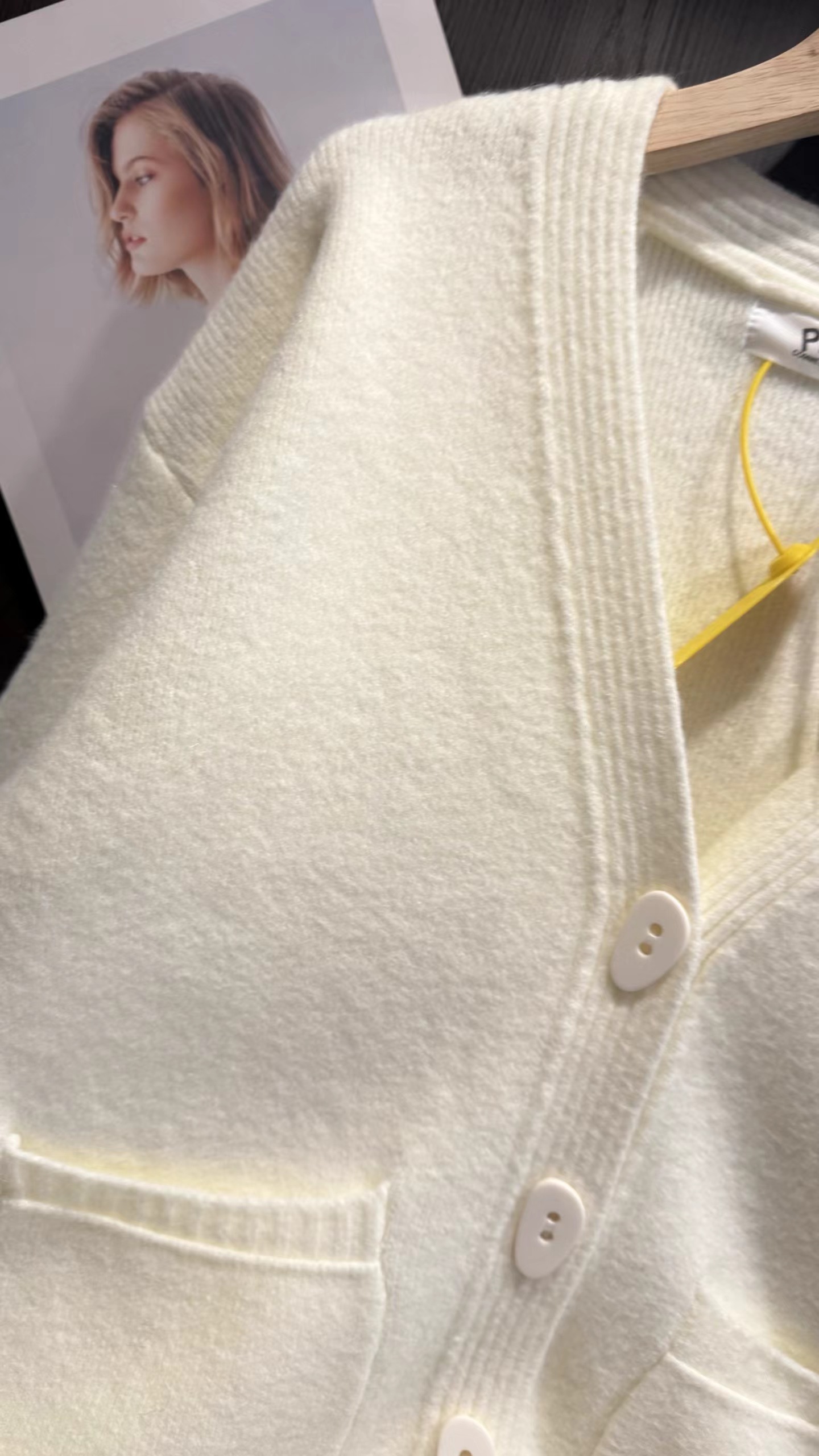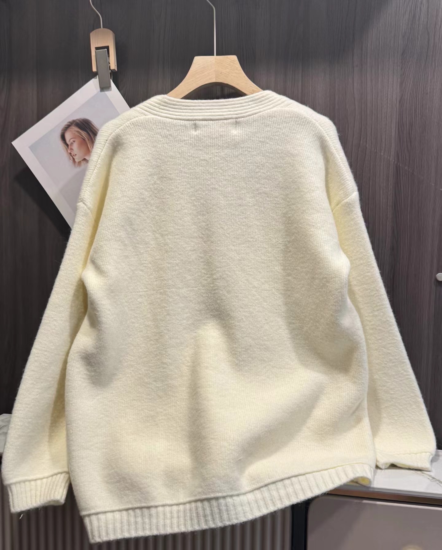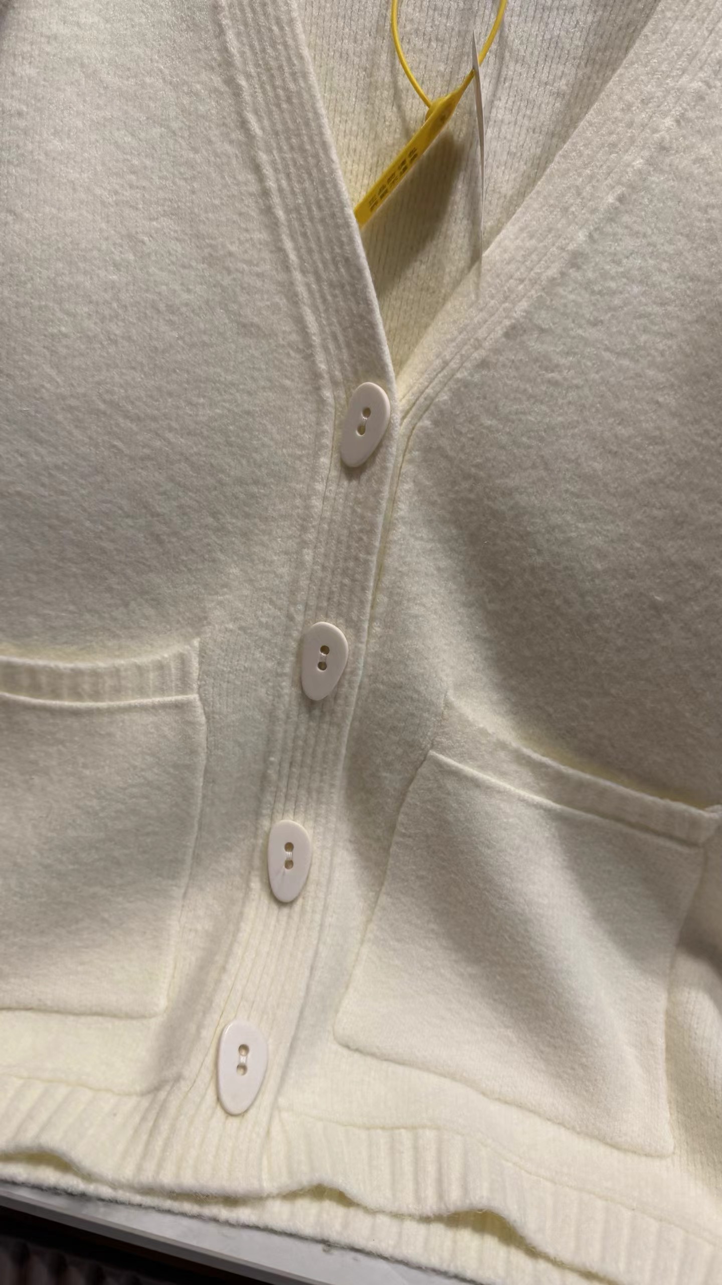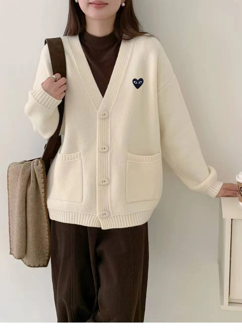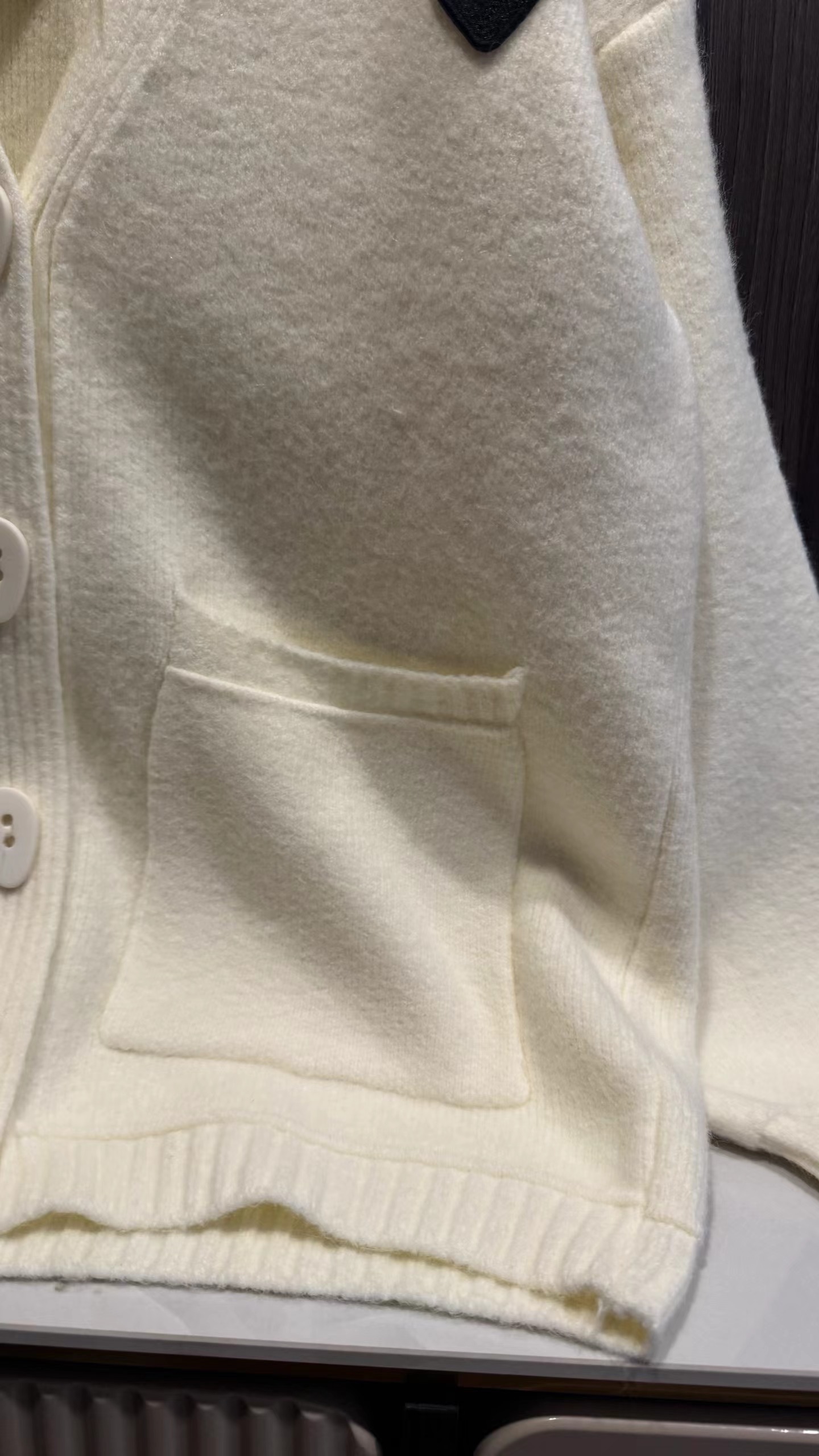 毛衣米白色V领针织开衫,整体风格温柔简约,是兼具舒适与质感的百搭单品。宽松落肩版型,包容度高,不挑身材,自带慵懒随性的氛围感,衣长及胯,能有效修饰腰胯线条。门襟采用四颗质感圆润的同色系纽扣,简约利落,与整体色调融为一体。两侧设有方形贴袋,兼具实用性与装饰性,可放置随身小物,也丰富了视觉层次。?左胸位置点缀了一枚标志性的黑色爱心小标,带有独特的品牌辨识度,为简约版型增添了设计感。袖口与下摆均采用罗纹收边设计,弹性佳且不易变形,贴合身形的同时能锁住暖意。采用细腻柔软的针织面料,亲肤保暖,触感软糯,适合春秋单穿或秋冬叠穿。可参考图中搭配,内搭深咖色高领打底衫,下装同色系阔腿裤,整体配色和谐羔级,通勤、休闲场景均适配;也可内搭T恤、衬衫,打造多种风格造型。
