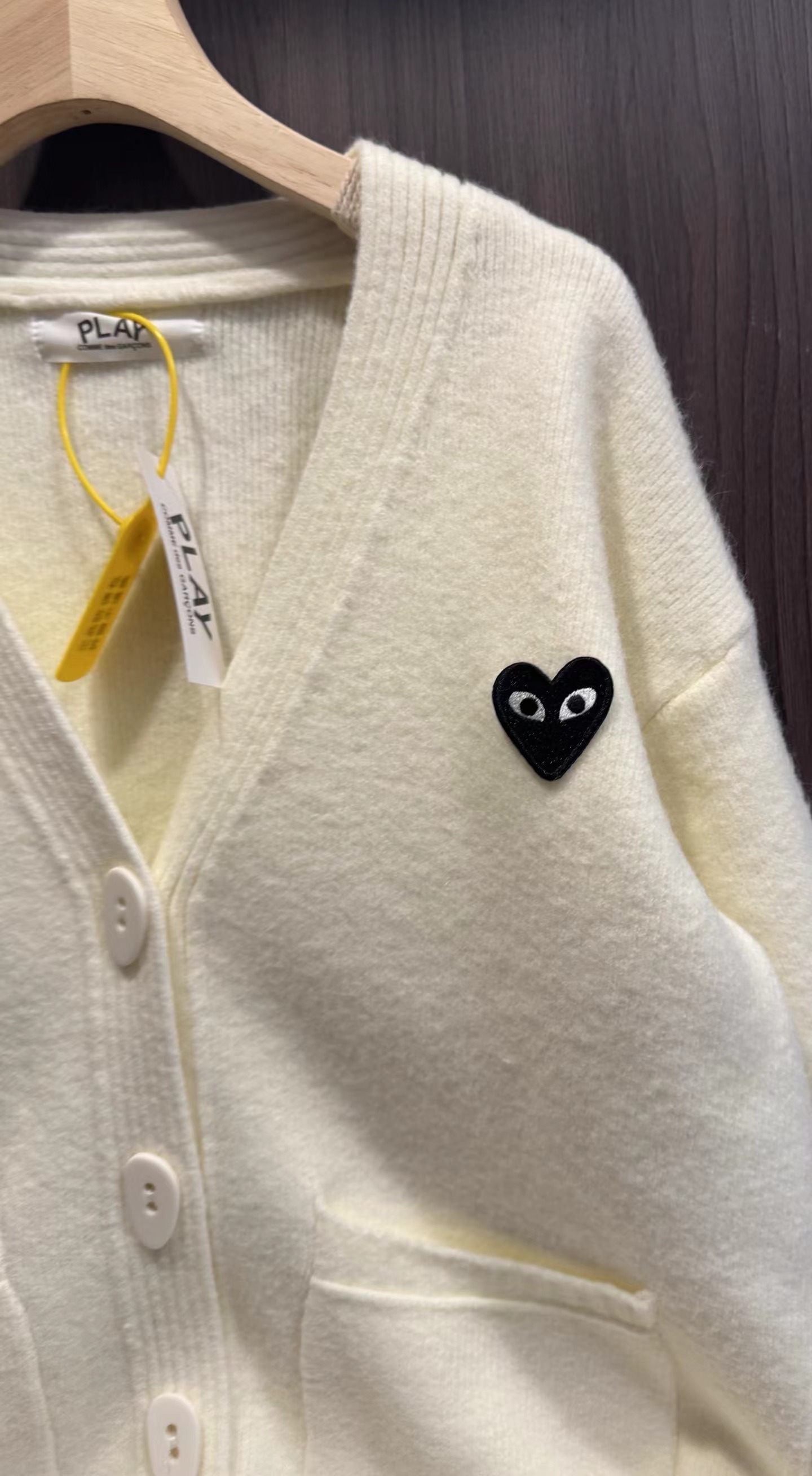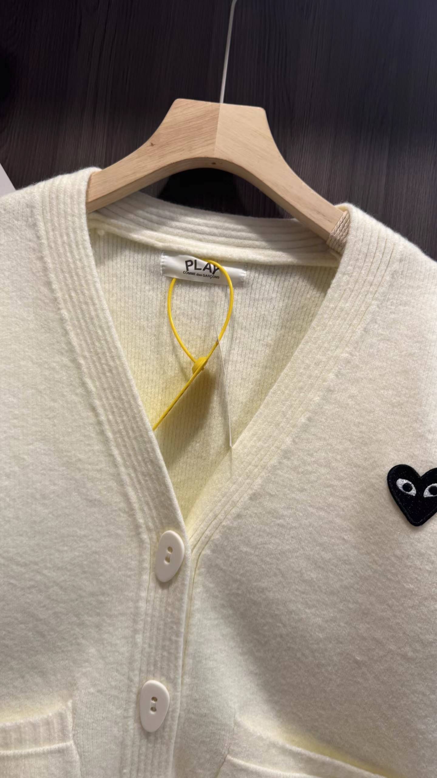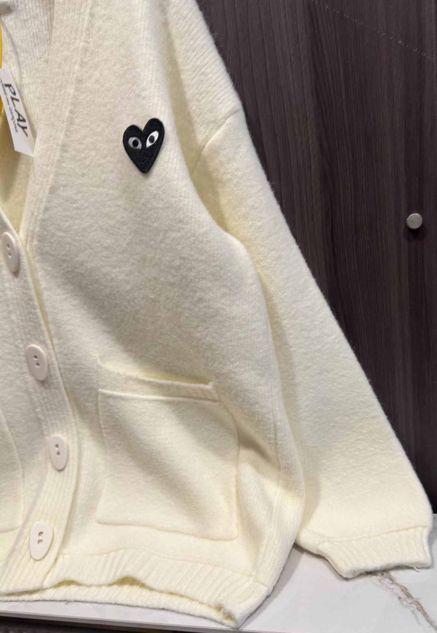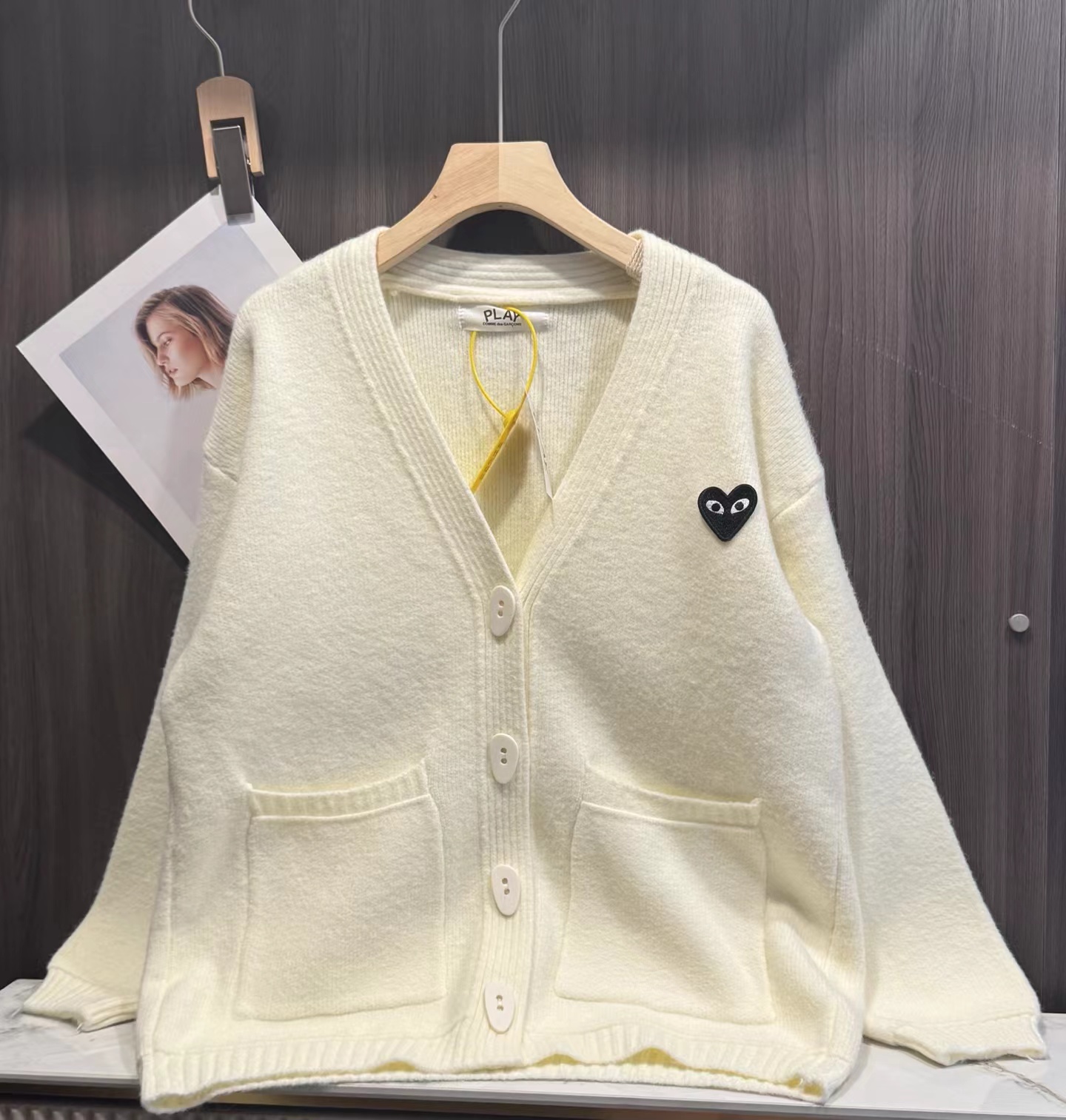毛衣米白色V领针织开衫,整体风格温柔简约,是兼具舒适与质感的百搭单品。宽松落肩版型,包容度高,不挑身材,自带慵懒随性的氛围感,衣长及胯,能有效修饰腰胯线条。门襟采用四颗质感圆润的同色系纽扣,简约利落,与整体色调融为一体。两侧设有方形贴袋,兼具实用性与装饰性,可放置随身小物,也丰富了视觉层次。?左胸位置点缀了一枚标志性的黑色爱心小标,带有独特的品牌辨识度,为简约版型增添了设计感。袖口与下摆均采用罗纹收边设计,弹性佳且不易变形,贴合身形的同时能锁住暖意。采用细腻柔软的针织面料,亲肤保暖,触感软糯,适合春秋单穿或秋冬叠穿。可参考图中搭配,内搭深咖色高领打底衫,下装同色系阔腿裤,整体配色和谐羔级,通勤、休闲场景均适配;也可内搭T恤、衬衫,打造多种风格造型。