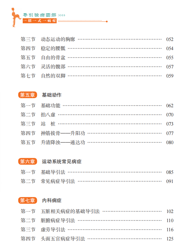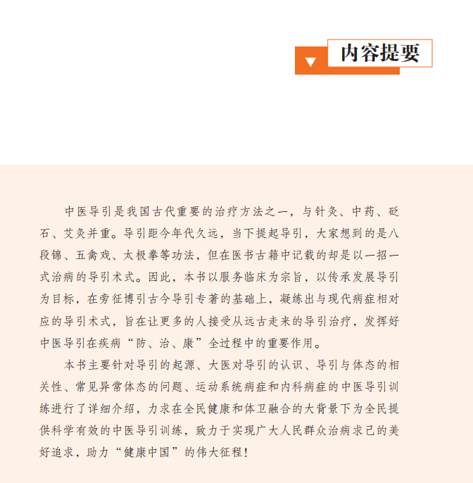 本书主要针对导引的起源、大医对导引的认识、导引与体态的相关性、常见异常体态的问题、运动系统病症和内科病症的中医导引训练进行了详细介绍,力求在全民健康和体卫融合的大背景下为全民提供科学有效的中医导引训练,致力于实现广大人民群众治病求己的美好追求,助力“健康中国”的伟大征程!