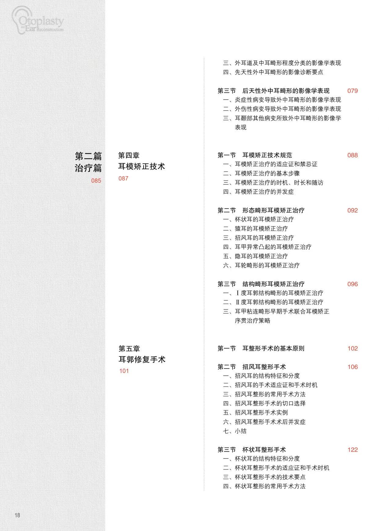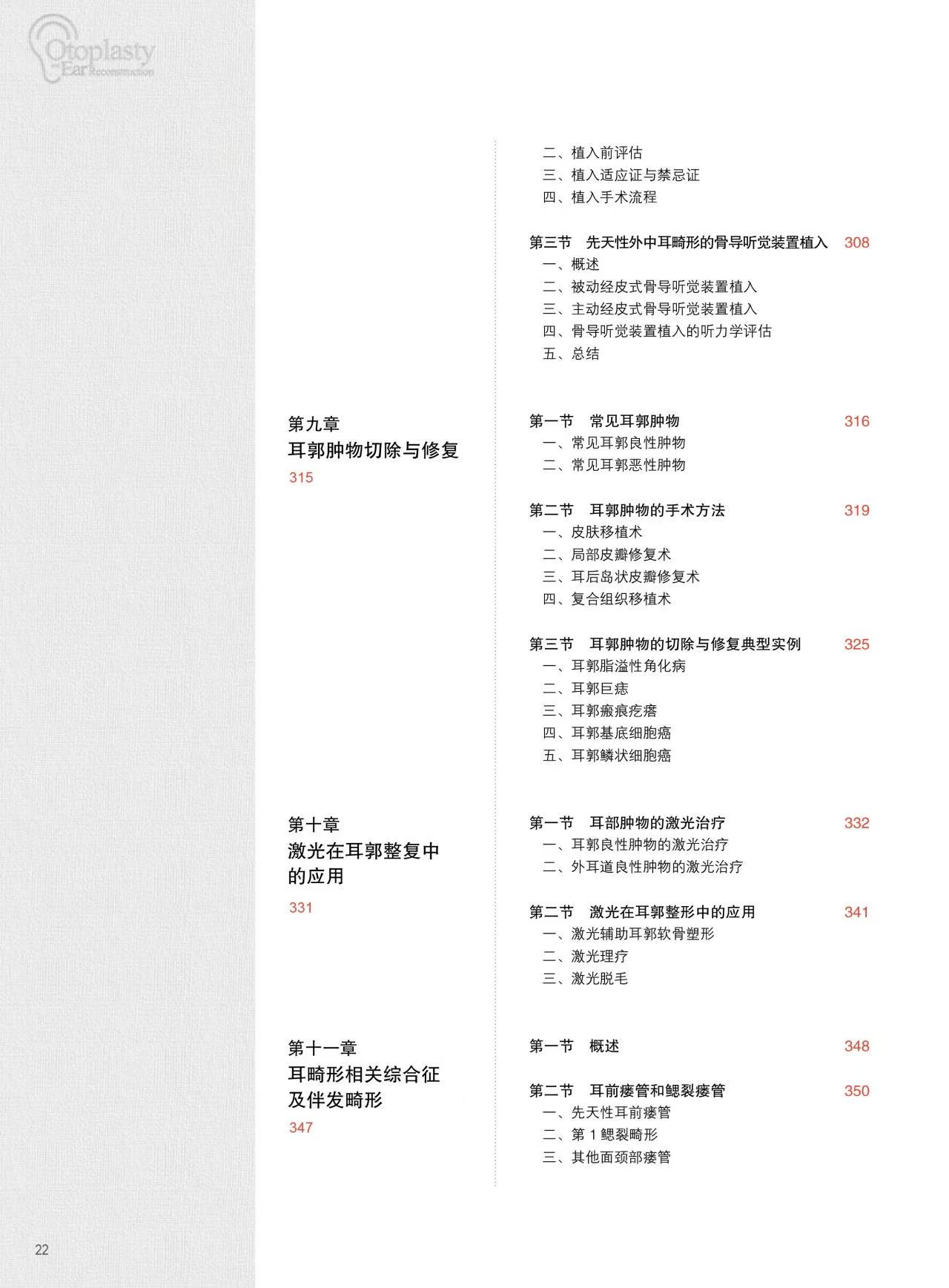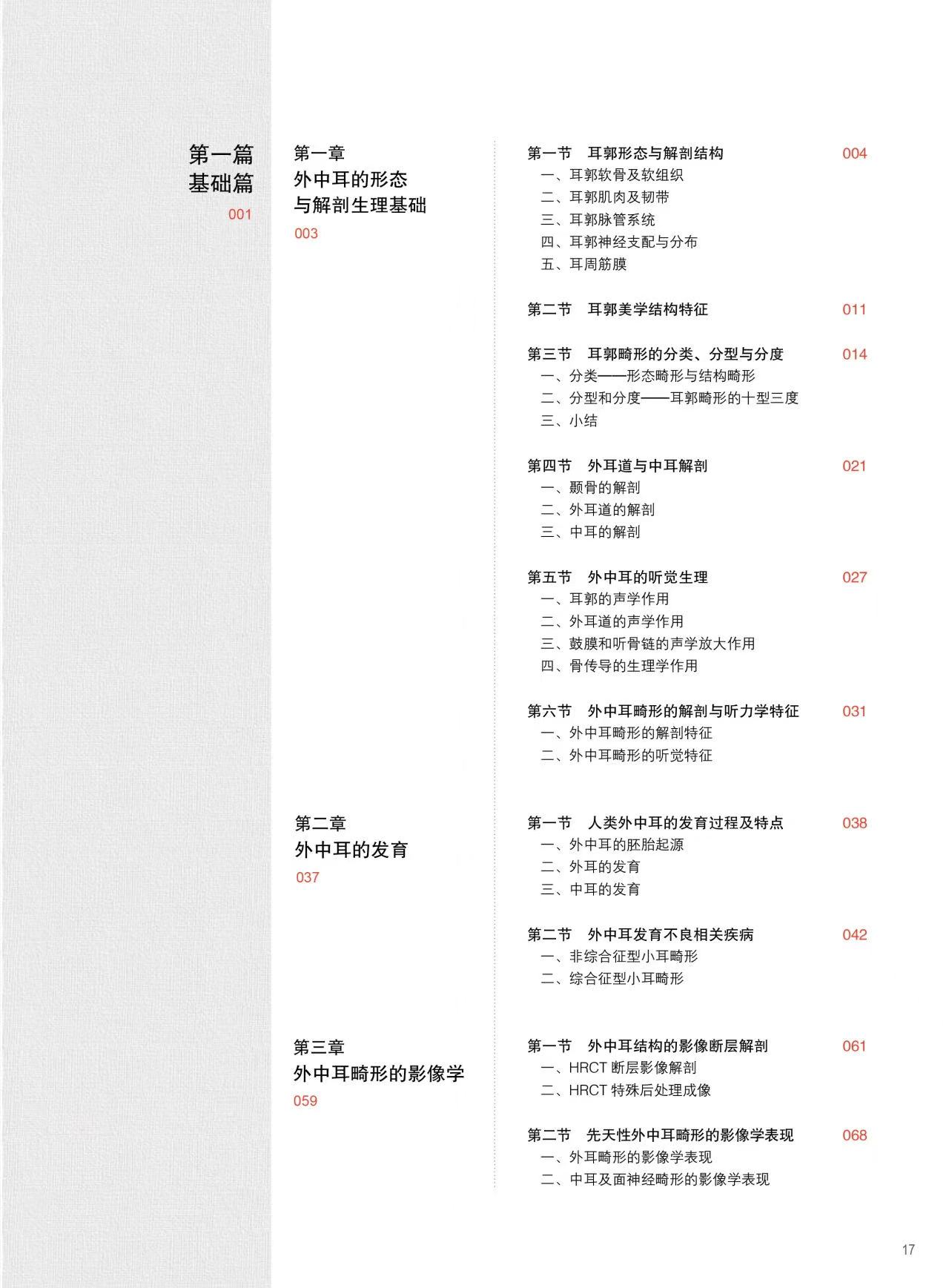 本书分三篇(基础篇、外科治疗篇、护理篇),共十章,分别为外中耳的形态与解剖生理基础、外中耳的发育、外中耳畸形的影像学表现、耳模矫正技术、耳郭修复手术、耳郭再造手术、功能性耳再造、耳郭肿物切除与修复、激光在耳郭整复中的应用、耳畸形相关综合征及伴发畸形、耳畸形相关心理学、耳畸形整复外科护理学。临床各章以病例展示为切入点,衔接国际进展,15年上海五官经验积淀,国内多位著名耳再造专家巅峰之作,国家科学技术著作基金资助。可谓是耳畸形整复领域的非常有价值的书籍。