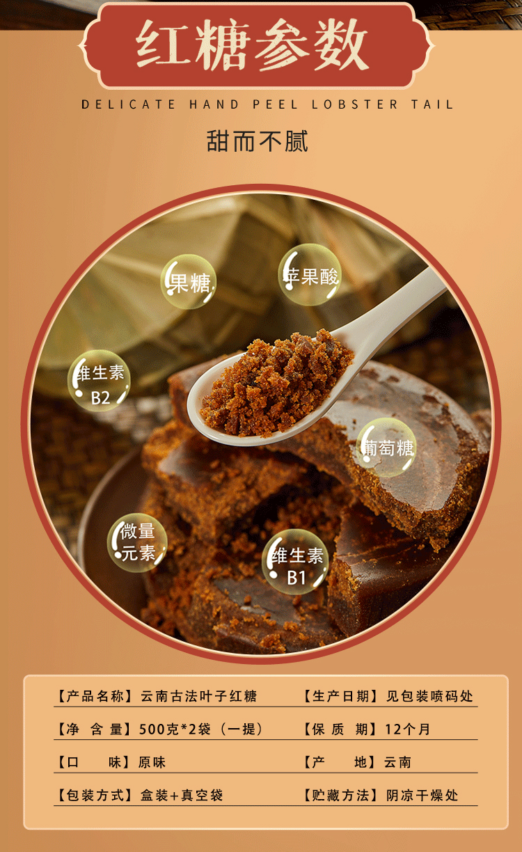 品名:叶子红糖规格1:一提(500克*2袋)包装:真空饼状+盒装 快递:中通/韵达/申通随机 发货地/产地:云南昆明 售卖期:全年 保质期:24个月 发货时效:48-72小时 运费模板:北京上海加+1元;内蒙+5元;新疆、西藏、港澳台不发货周六周天、节假日除外,早上十点之前的订单是48小时发货 ,到货时间约为2-5天,请您耐心等待 |