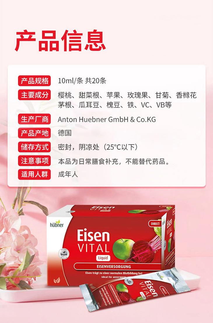 德国Huebner红铁是供货商推荐给我的,说zui近很多明星达人都在推荐,也有老粉一直问我有没有有没有。起初我也没放在心上,没觉得我需要补铁,后来听朋友说起她这半年都在喝,大姨妈都变准时,量也很可观。我就想起你们常问我大姨妈不规律和姨妈痛痛怎么办,其实我自己除了饮食上注意,经期喝点黑糖,再热敷,我也没有特别好的办法,这次算是朋友提醒了我,现在很多常坐在办公室的小仙女,容易缺铁。