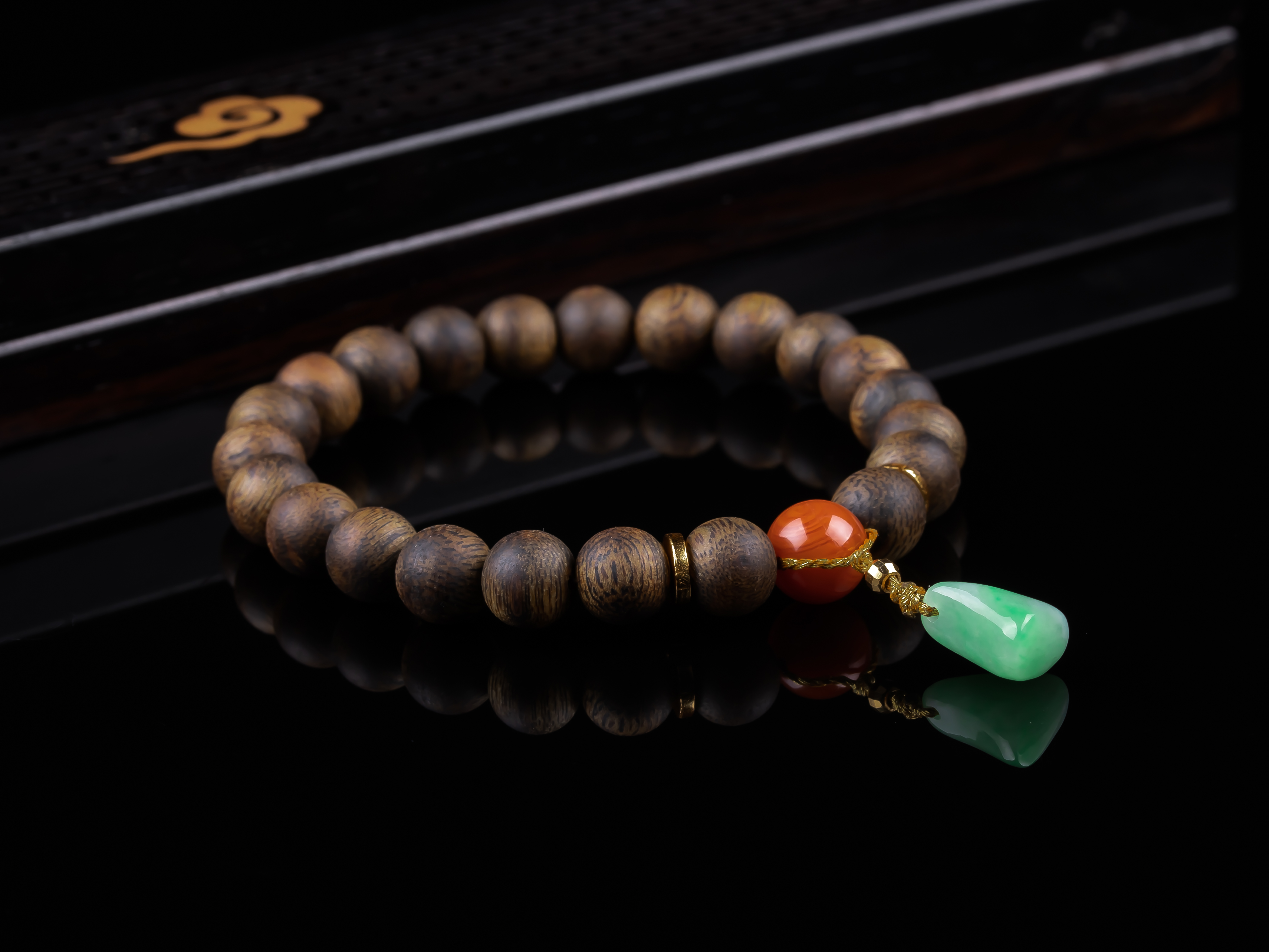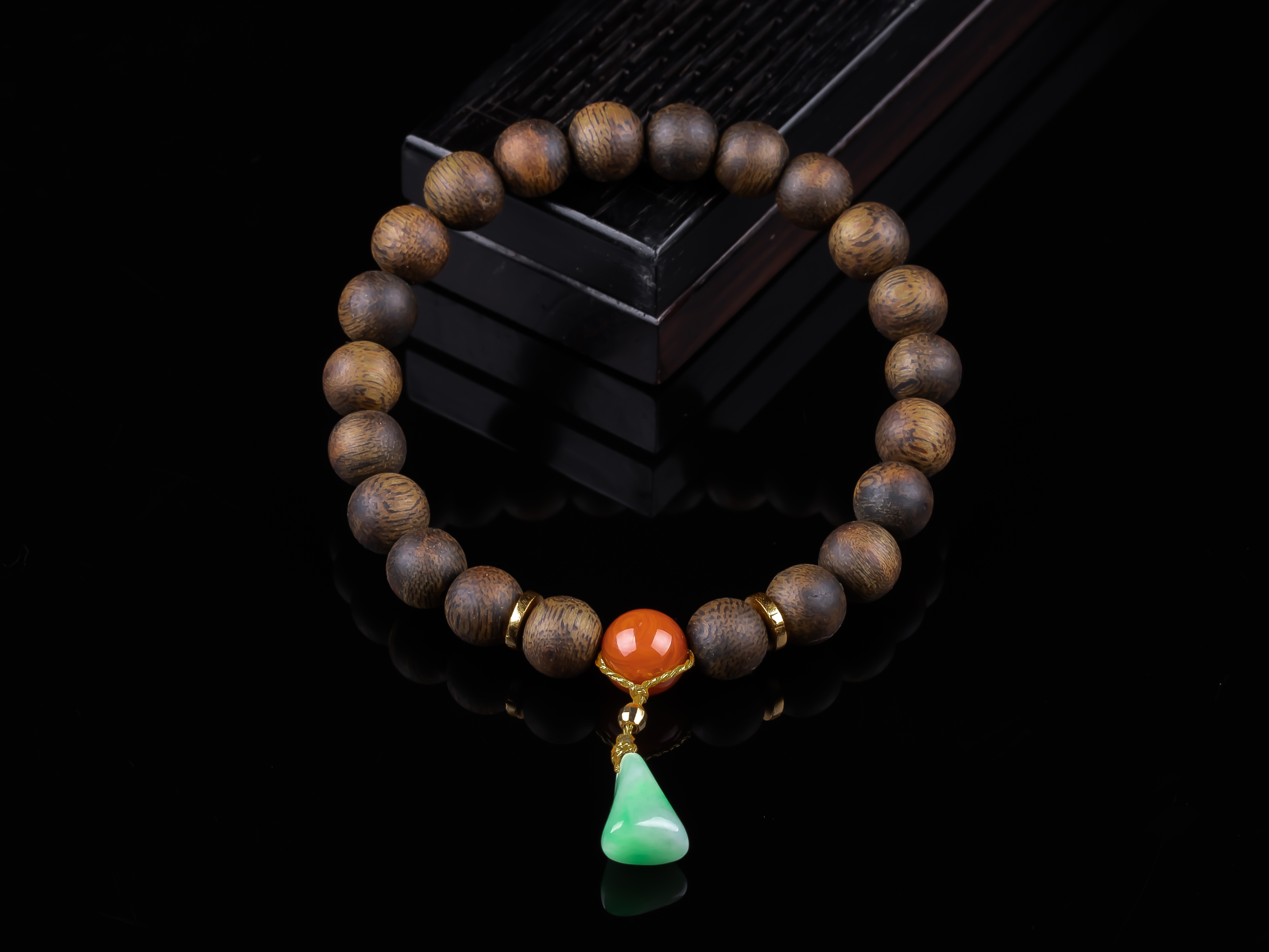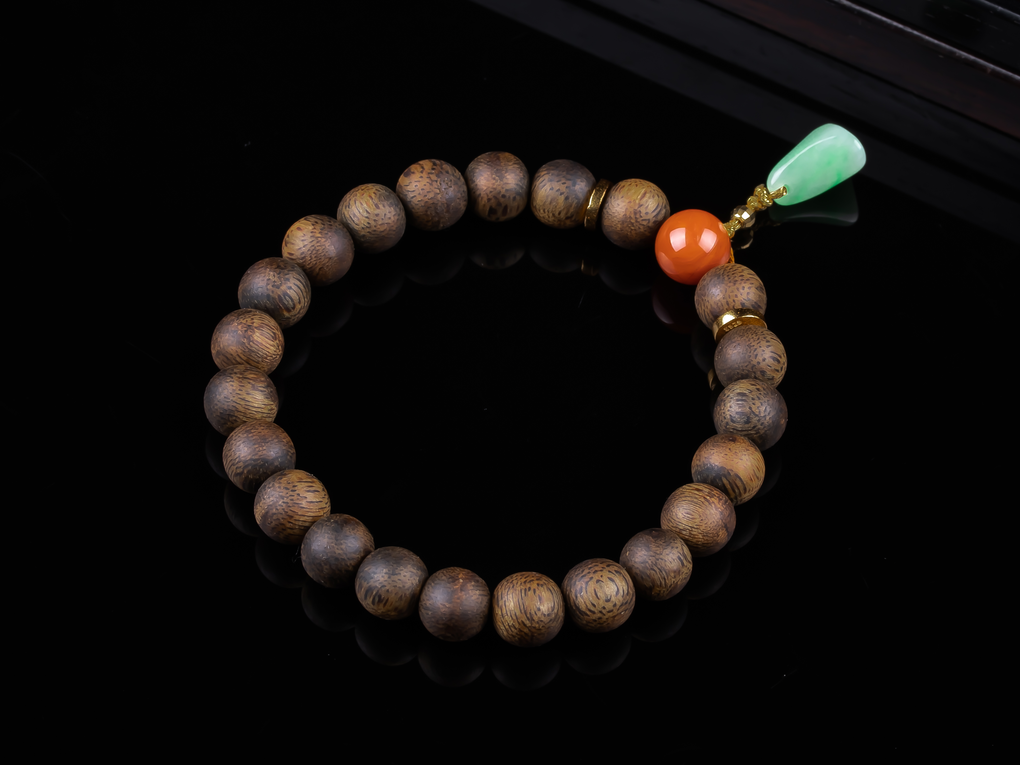 XY0307沉香+南红翡翠随型小坠手串.银,天然沉香约8.3mm。原色原味,香味自然清甜,满色肉南红下搭一颗飘绿的翡翠随型小坠,款式简约可爱,优雅中带着时尚与灵动。