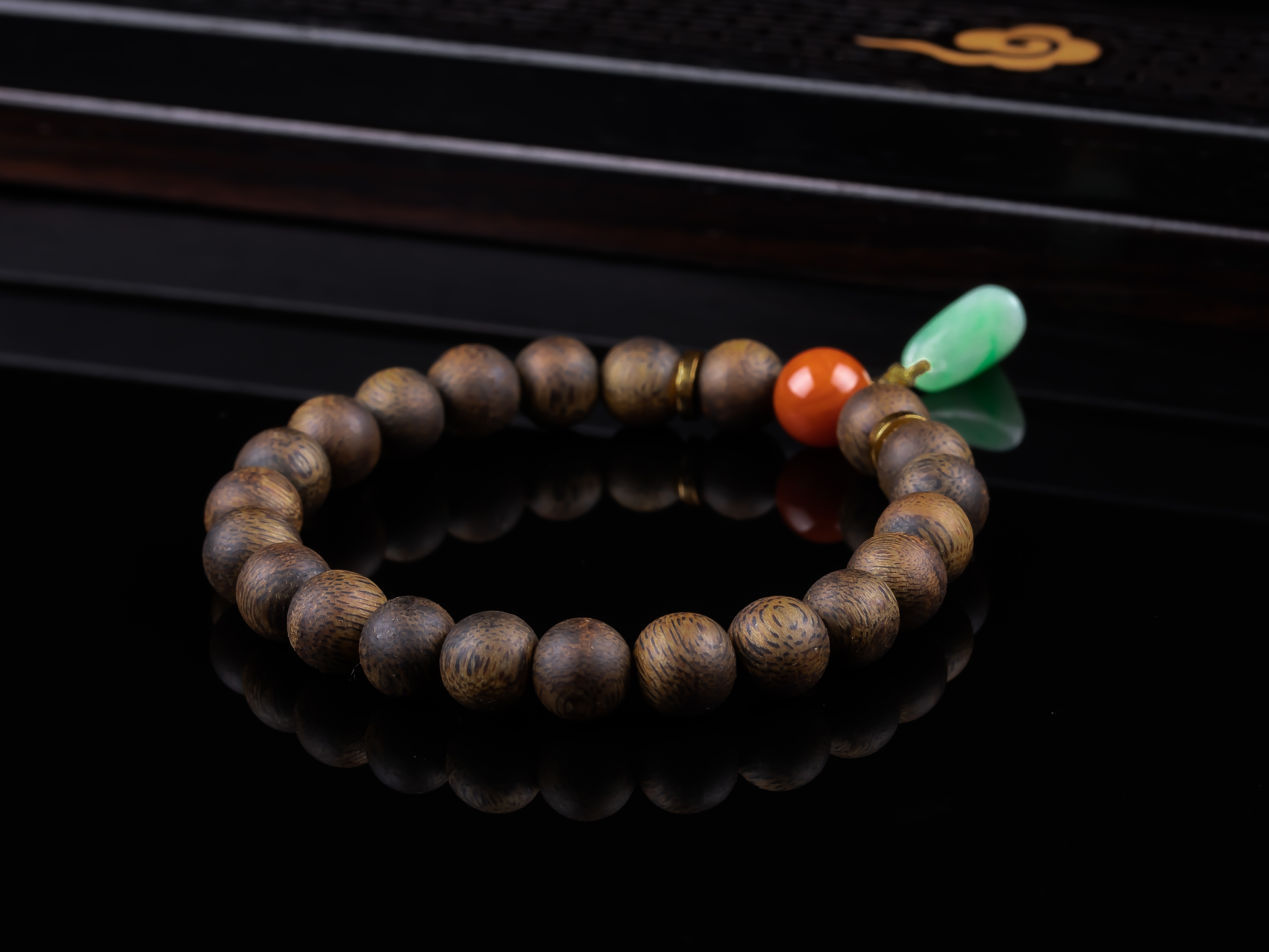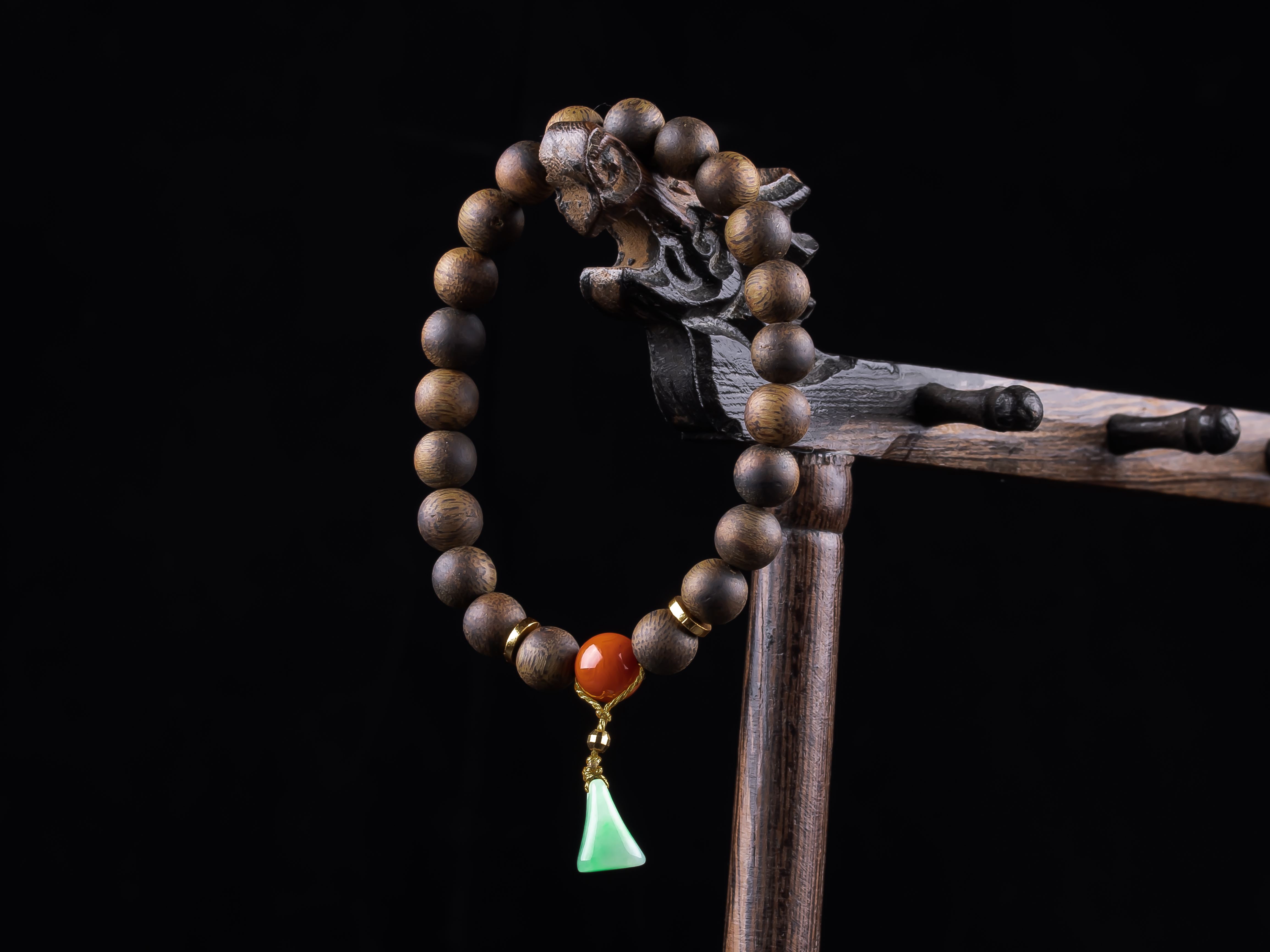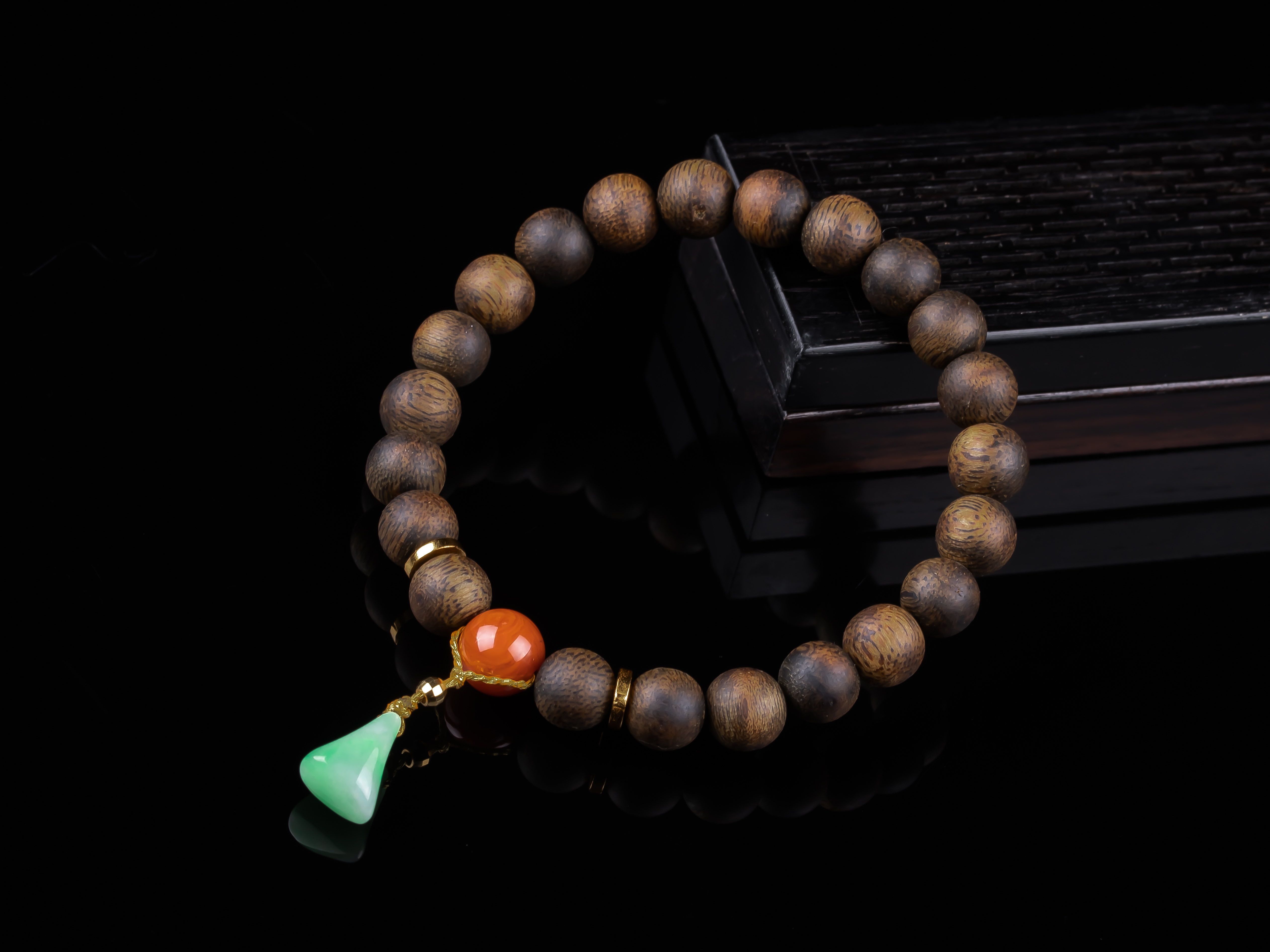 XY0307沉香+南红翡翠随型小坠手串.银,天然沉香约8.3mm。原色原味,香味自然清甜,满色肉南红下搭一颗飘绿的翡翠随型小坠,款式简约可爱,优雅中带着时尚与灵动。