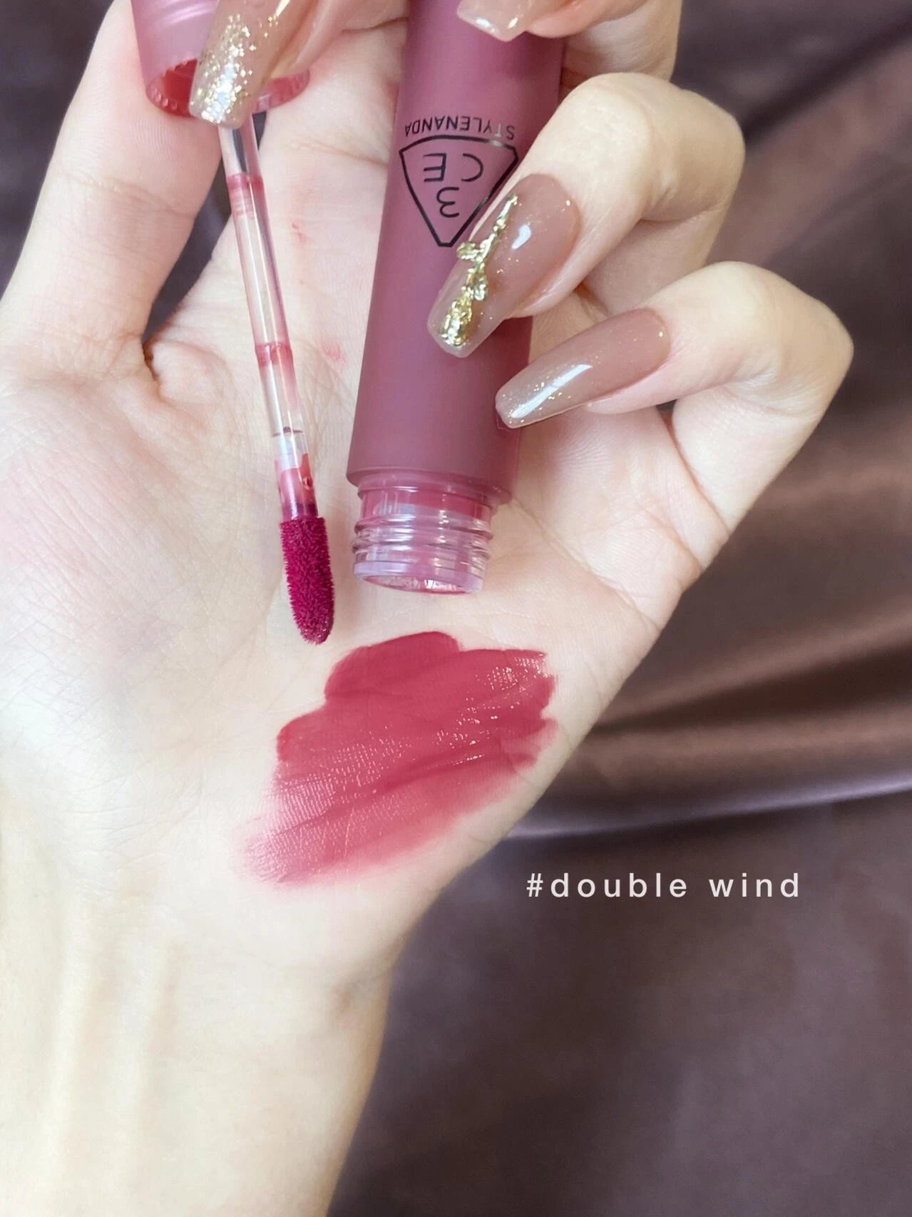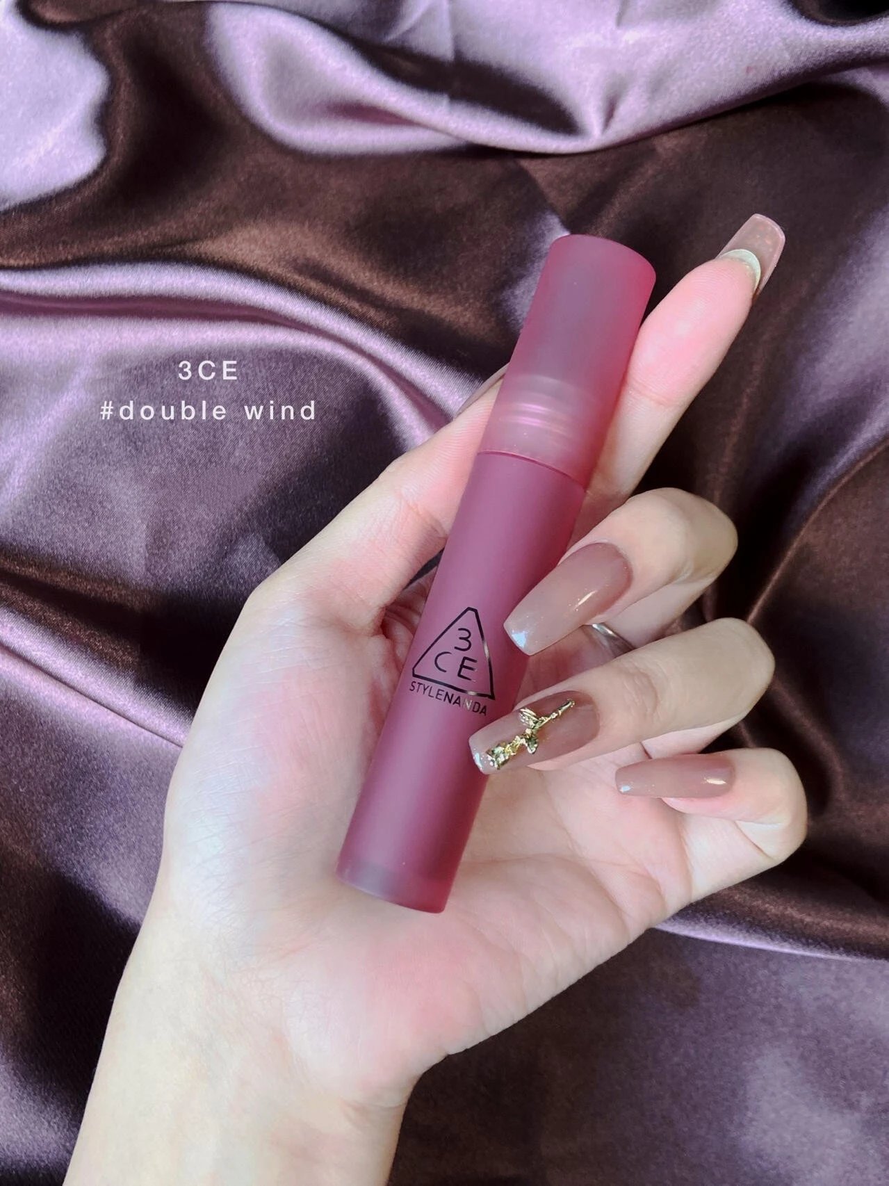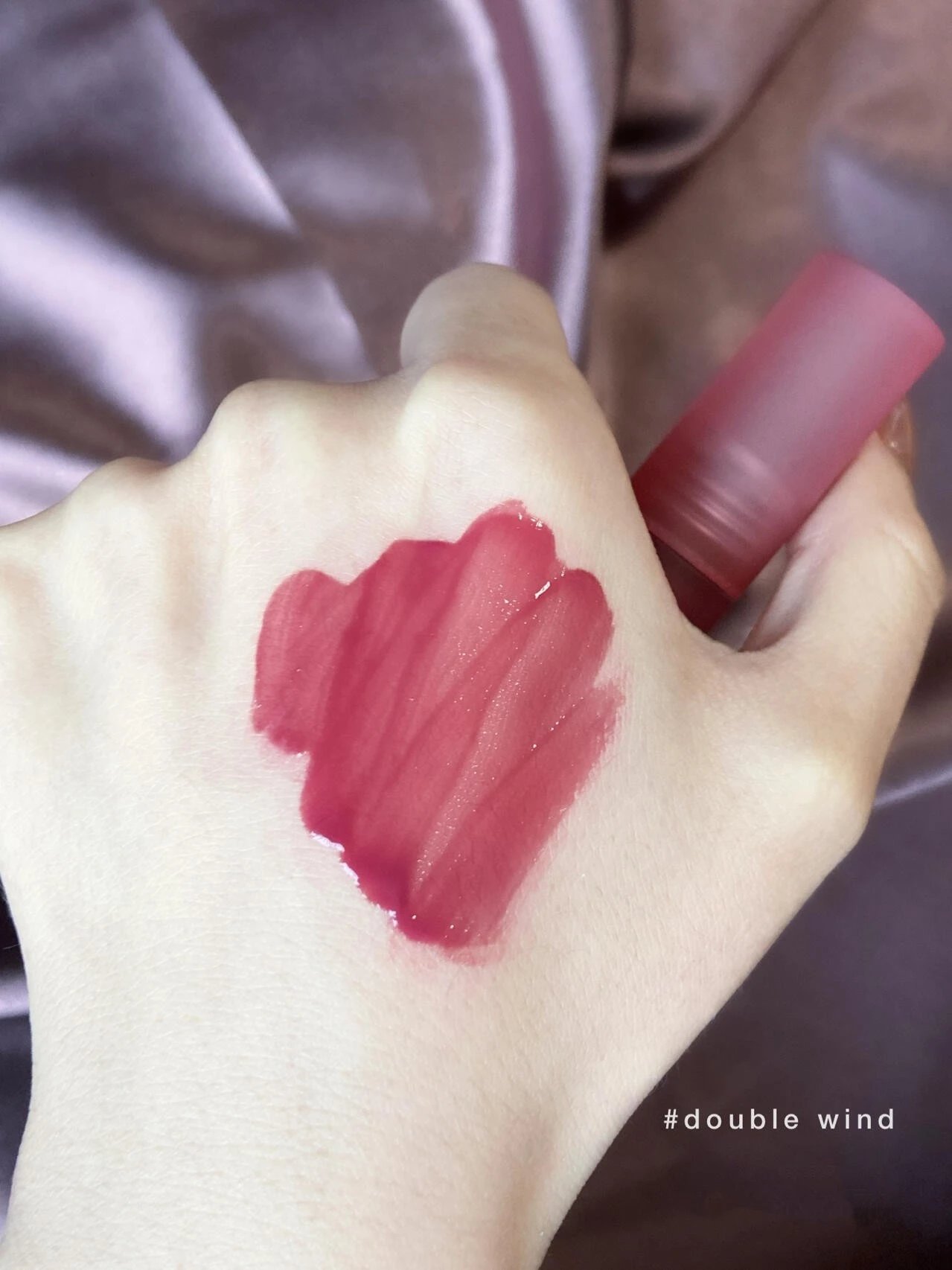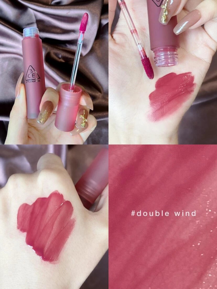清冷和温柔并存【3CE水雾唇釉#Double Wind 1.5g】上嘴丝滑水润,下一秒变微雾绒感~低饱和度紫红调莓果色,不显老不挑皮!不沾杯!