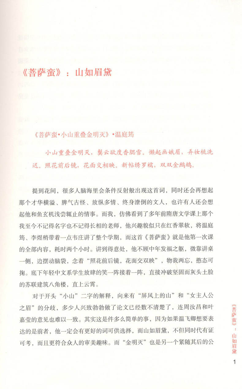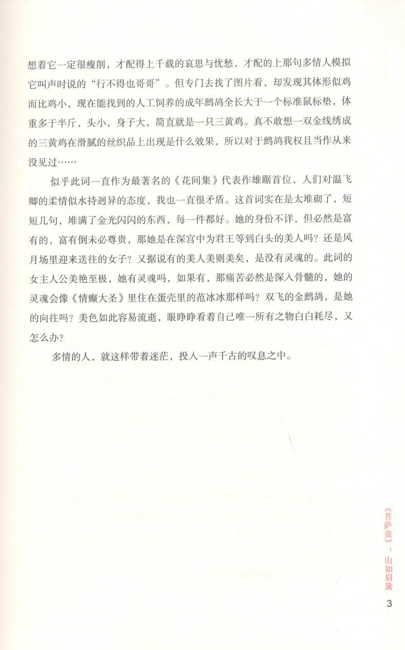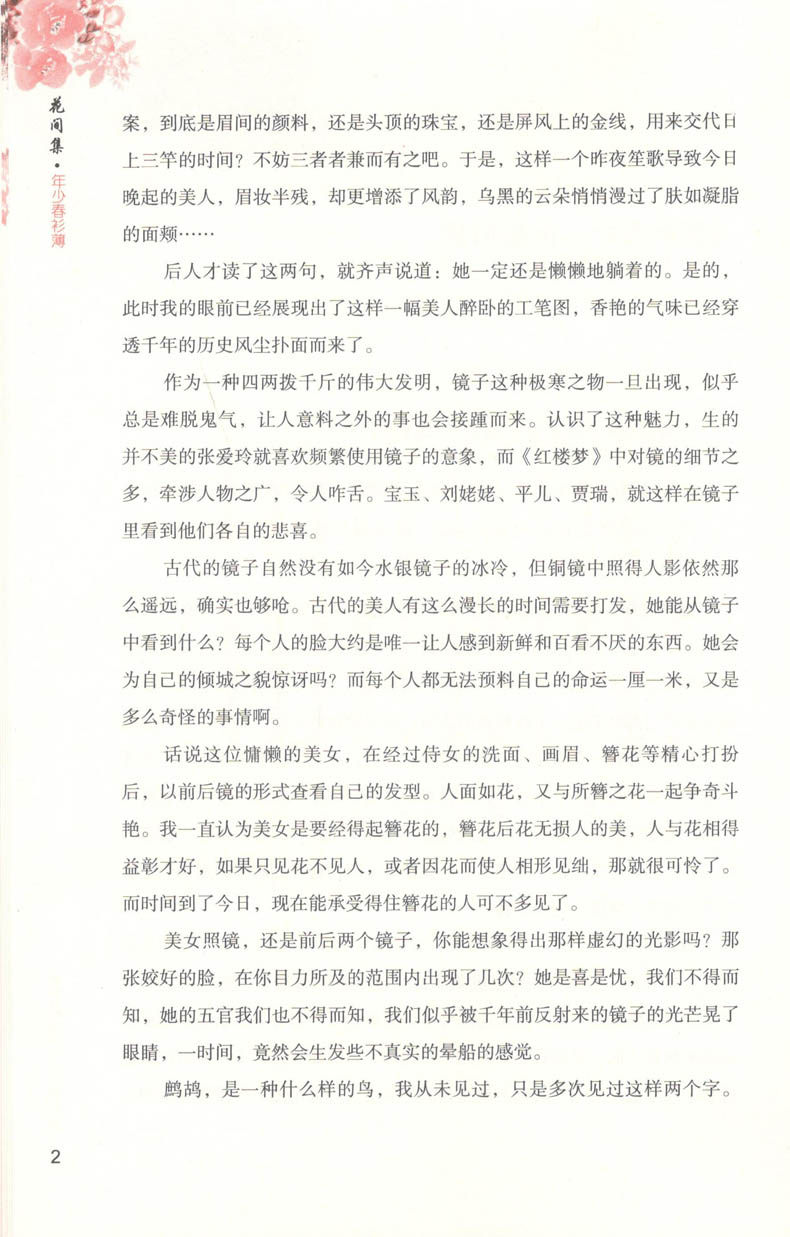 丝丝入扣的《花间集·年少春衫薄》里有多少宫廷贵妇和青楼女子,即使周围富丽堂皇,即使她们彻夜歌舞,当黎明到来,当一切肤浅的快乐烟消云散,她们还需要面对自己的悲哀。不同的女子怀揣着她们不为人知的隐秘故事,欲语还羞地出现在读者的面前。