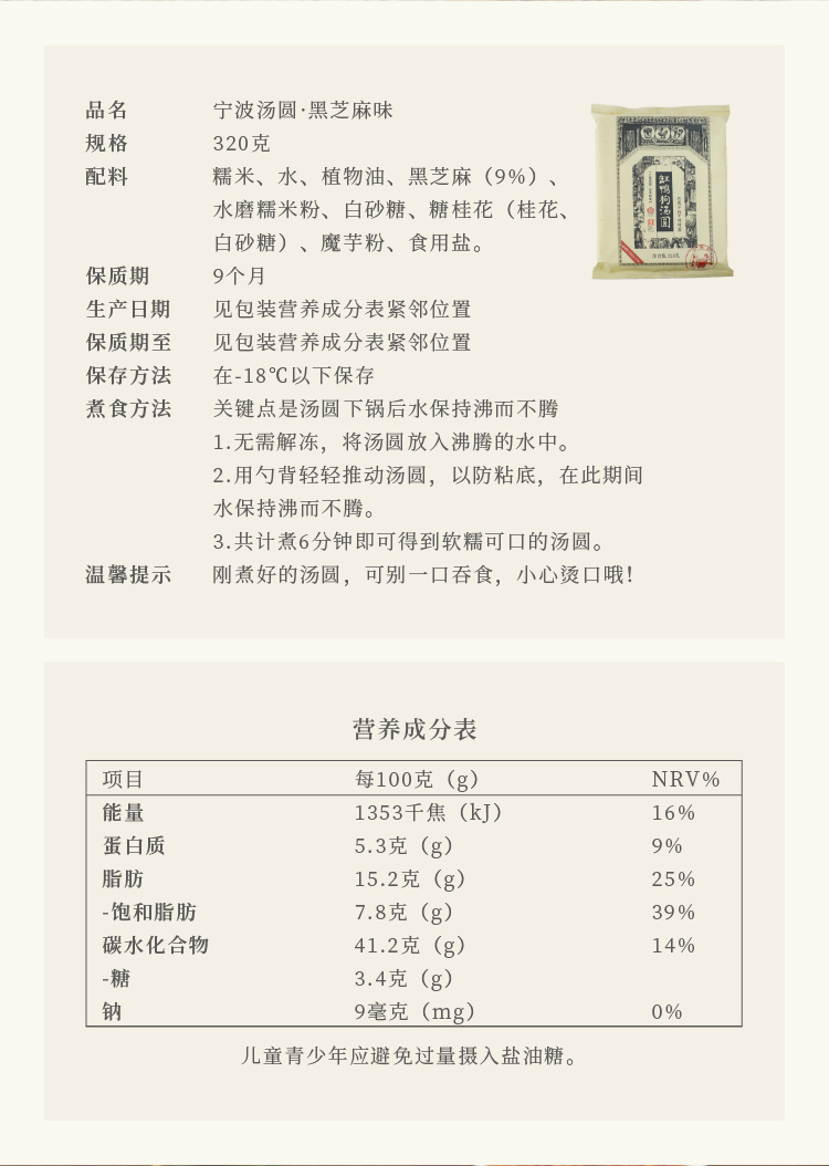 芝麻香香小汤圆:糯米、水、食用油脂制品、黑芝麻、白砂糖、乳糖醇、复配增稠剂、桂花、食用盐、柠檬。
