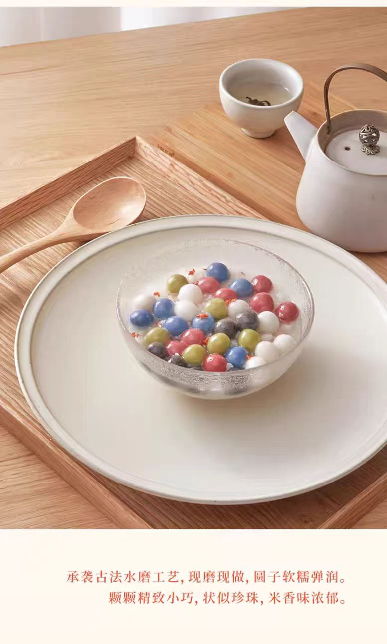 五彩小圆子:糯米、水、食用油脂制品、复配增稠剂、黑芝麻、白砂糖、红甜菜粉、抹茶粉、栀子粉。