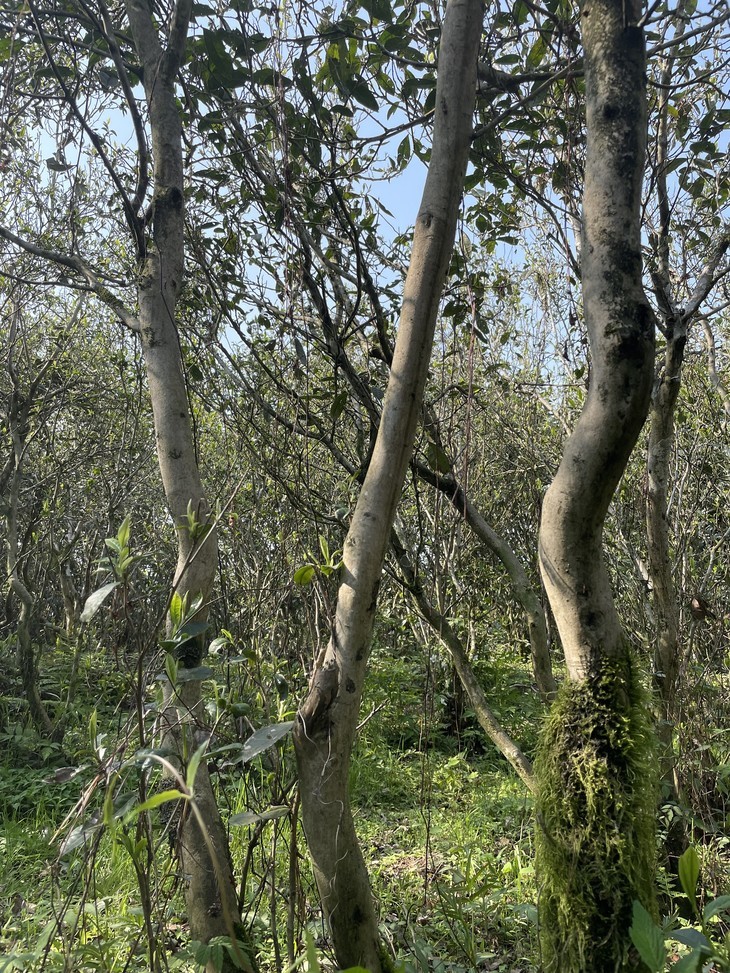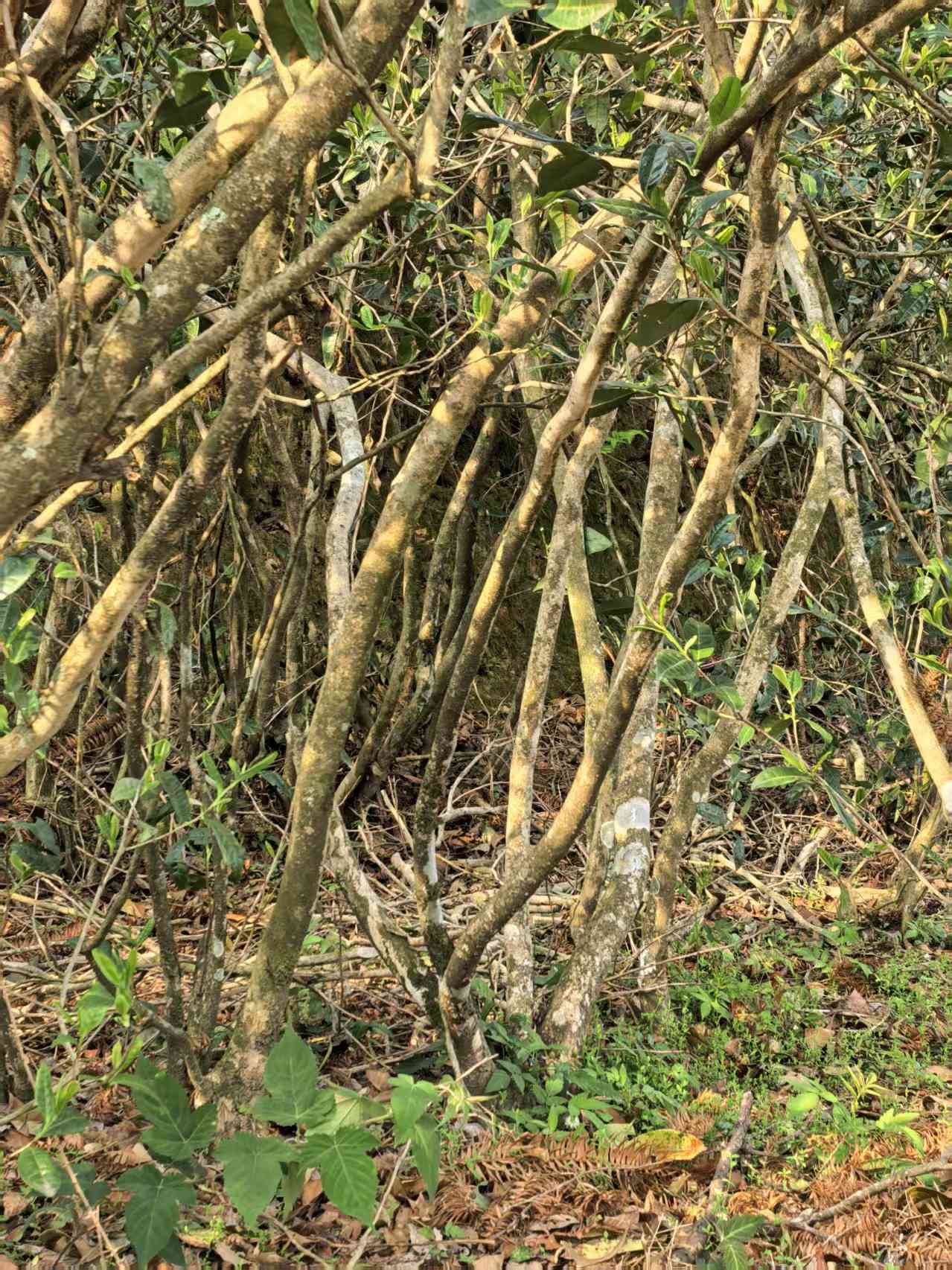 再和大家说一个知识点:大家看这些茶树的主杆,都是白色的,有白斑,这是荒龄大,树龄大的表现。