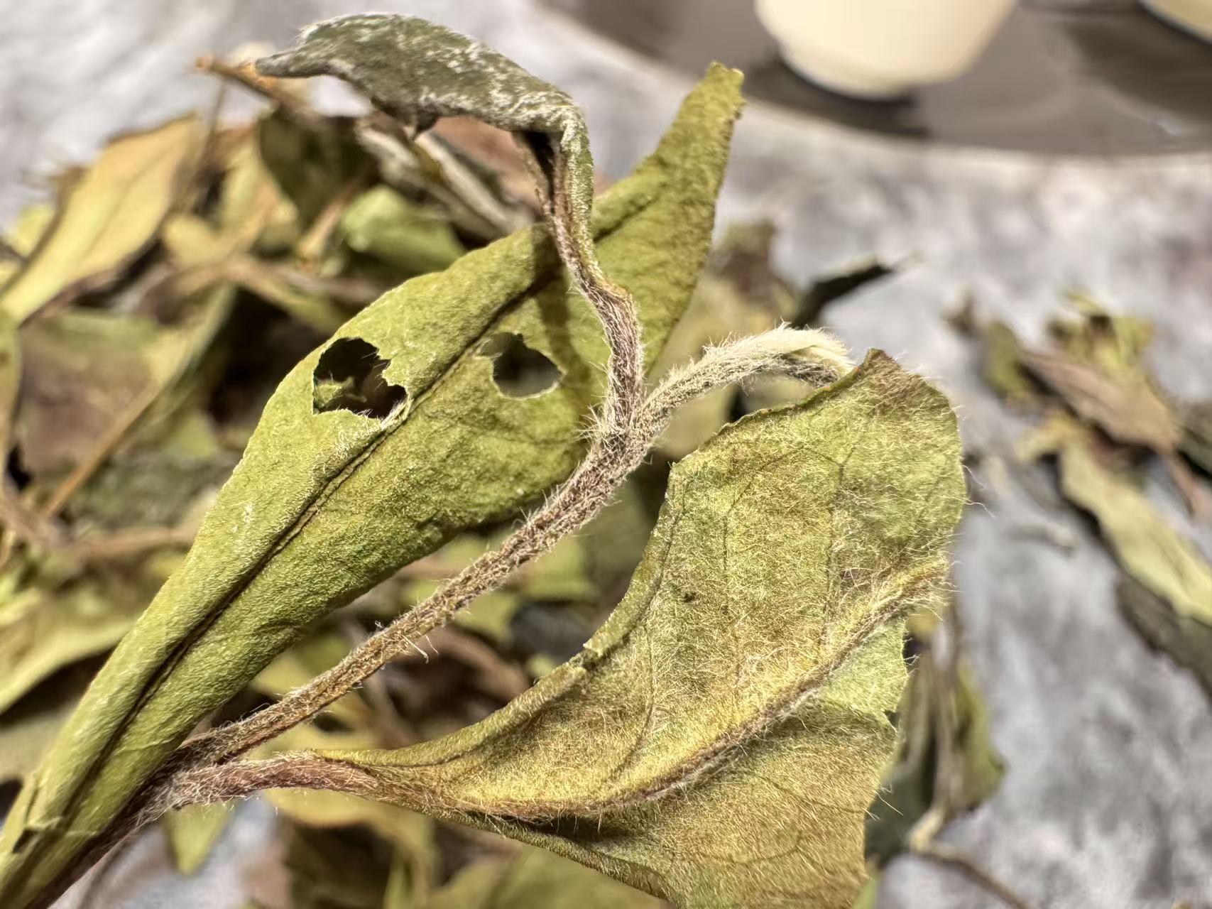 部分还能看到虫眼,虫眼不是很多,那是因为早点采摘下来,否则茶叶太老就会内质空寡。如果再等三五天,那会有更多的虫眼,但是成熟度已经到了,不能再等。