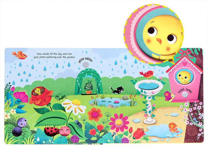 风和日丽,花园裡各种声响,小鸟唱歌,蜜蜂嗡嗡叫,雨滴拍挞拍挞落下,河畔青蛙呱呱叫,书中有许多动物和大自然的声音,按下页面上的按钮就能够听到,新奇有趣。图案也特别有凹凸设计,让小朋友可以藉由触摸留下深刻印象,并认识大自然的魅力。