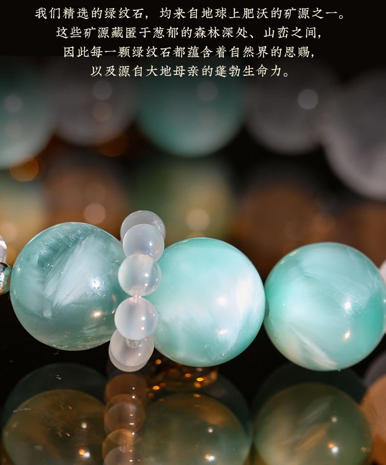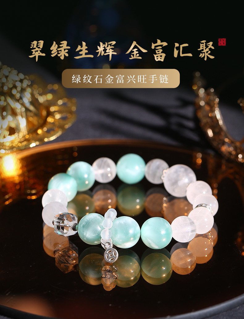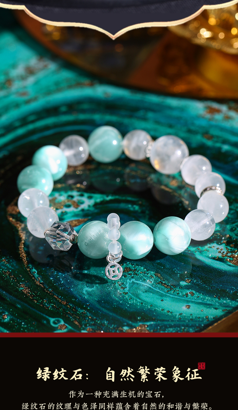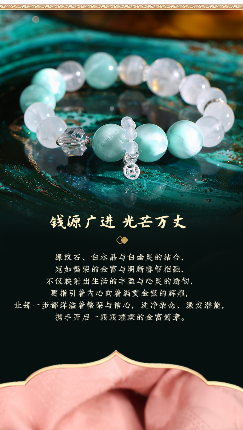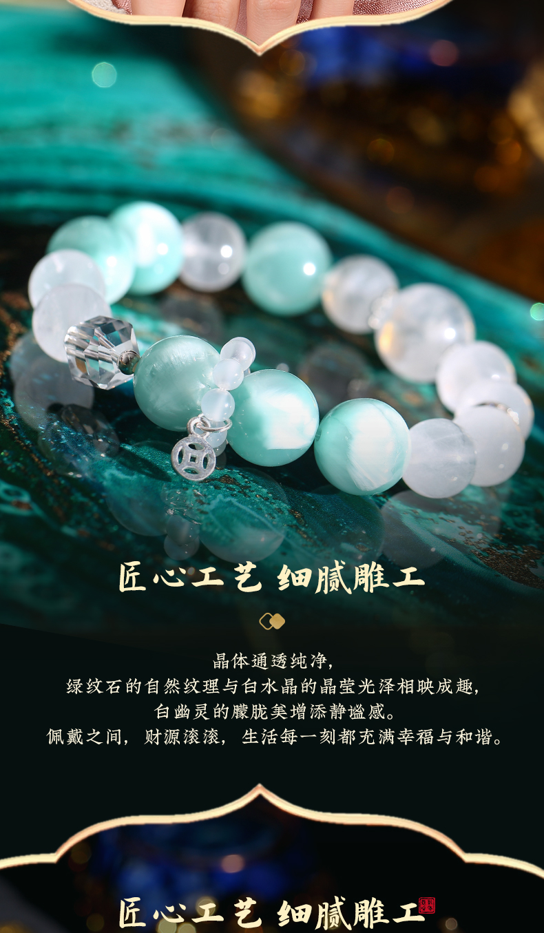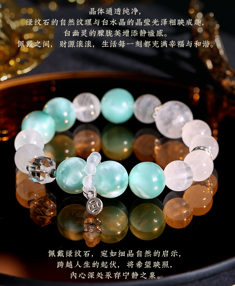 灵机生活馆 绿纹石钱币手链 缓和情绪 白水晶白幽灵手串
