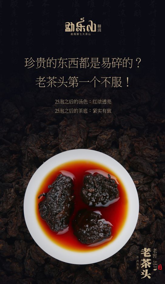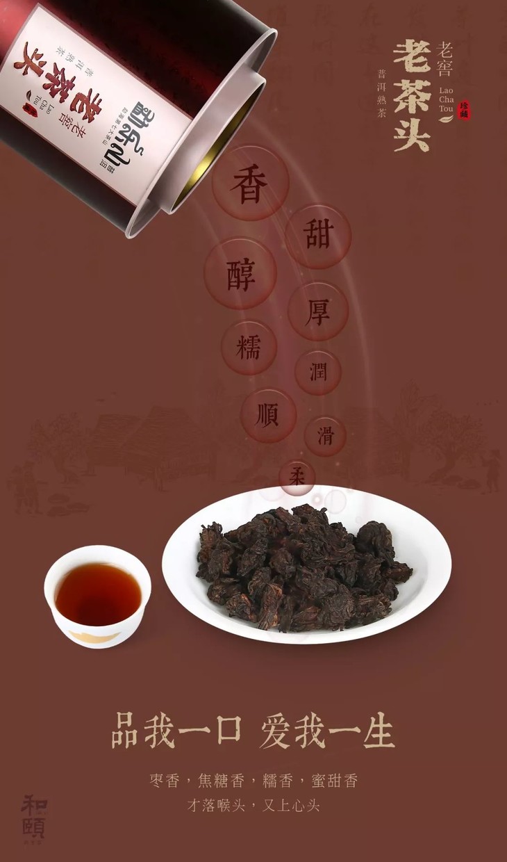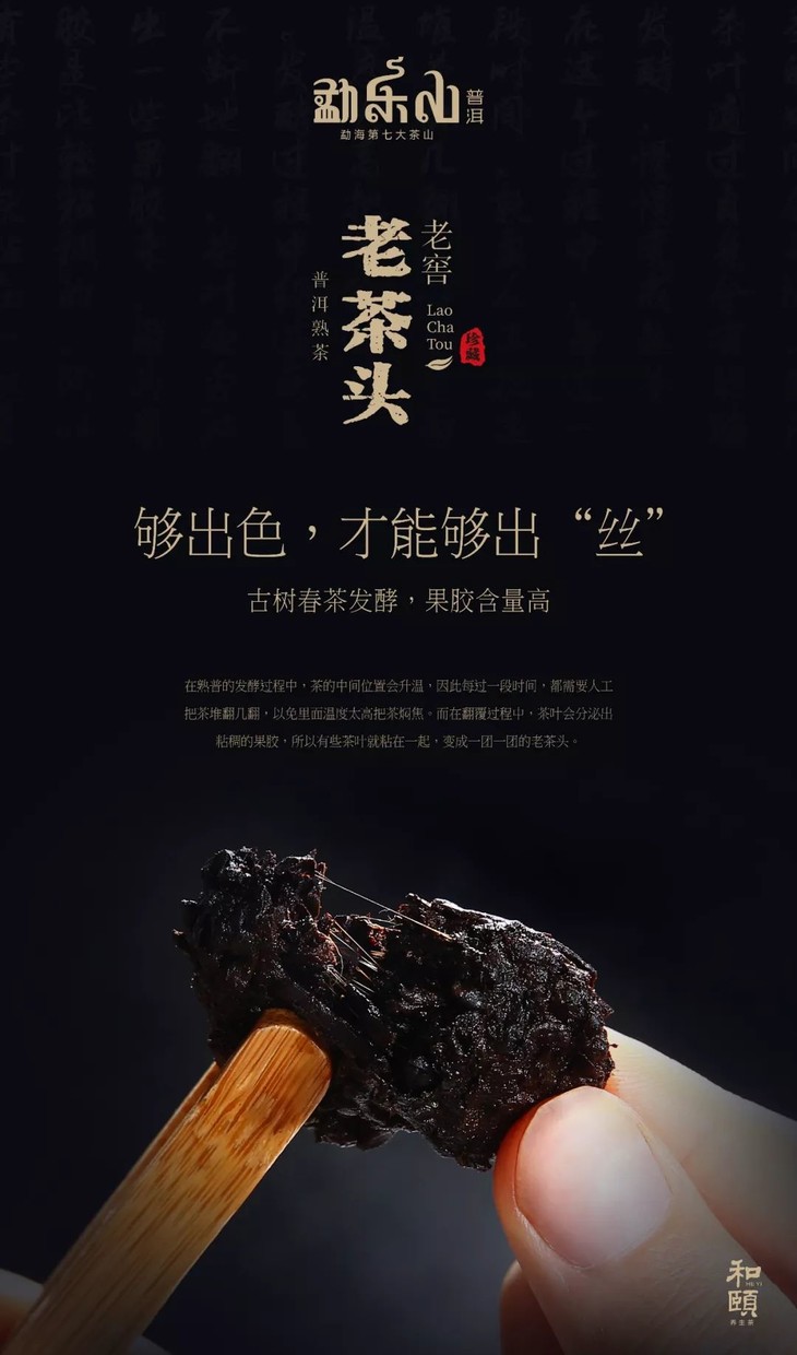 因为老茶头在熟茶中的占比非常小(仅1%~2%),因此老茶头生产周期长,往往需要发酵许多熟茶才能成就一款老茶头。勐乐山老窖老茶头,精选多堆春茶发酵的原料茶头,跨年份拼配制成,综合了各茶的优点。更香,更甜,更醇,更厚,更柔,更糯,更润,更顺滑。茶汤才落喉头,回味又上心头。让你品一口,足以爱一生。