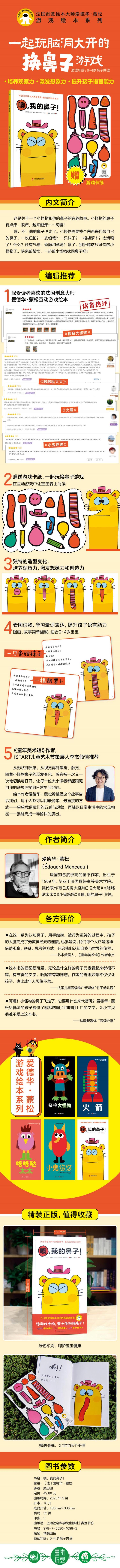 ◆ 法国创意大师爱德华•蒙松继《挠挠大怪物》《火箭》后又一脑洞大开的互动游戏书。 ◆ 赠送游戏卡纸,一起玩换鼻子游戏,在互动游戏中让宝宝爱上阅读! ◆ 独特的造型变化,培养观察力,激发想象力和创造力! ◆ 看图识物,学习量词表达,提升孩子语言能力。 ◆ 图画、故事简单幽默,适合0~4岁的宝宝。 ◆《童年美术馆》作者,iSTART儿童艺术节策展人李杰倾情推荐。