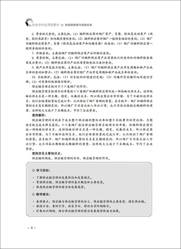 《供应链管理与系统实训》本教材可以作为应用型高等院校物流管理与工程类、工商管理类、管理科学与工程类本科生、专业硕士及工商管理硕士(MBA)的教材和参考书,也可作为高职高专院校物流管理专业和经济管理类专业教材,还可作为相关领域的企业管理人员的参考书。