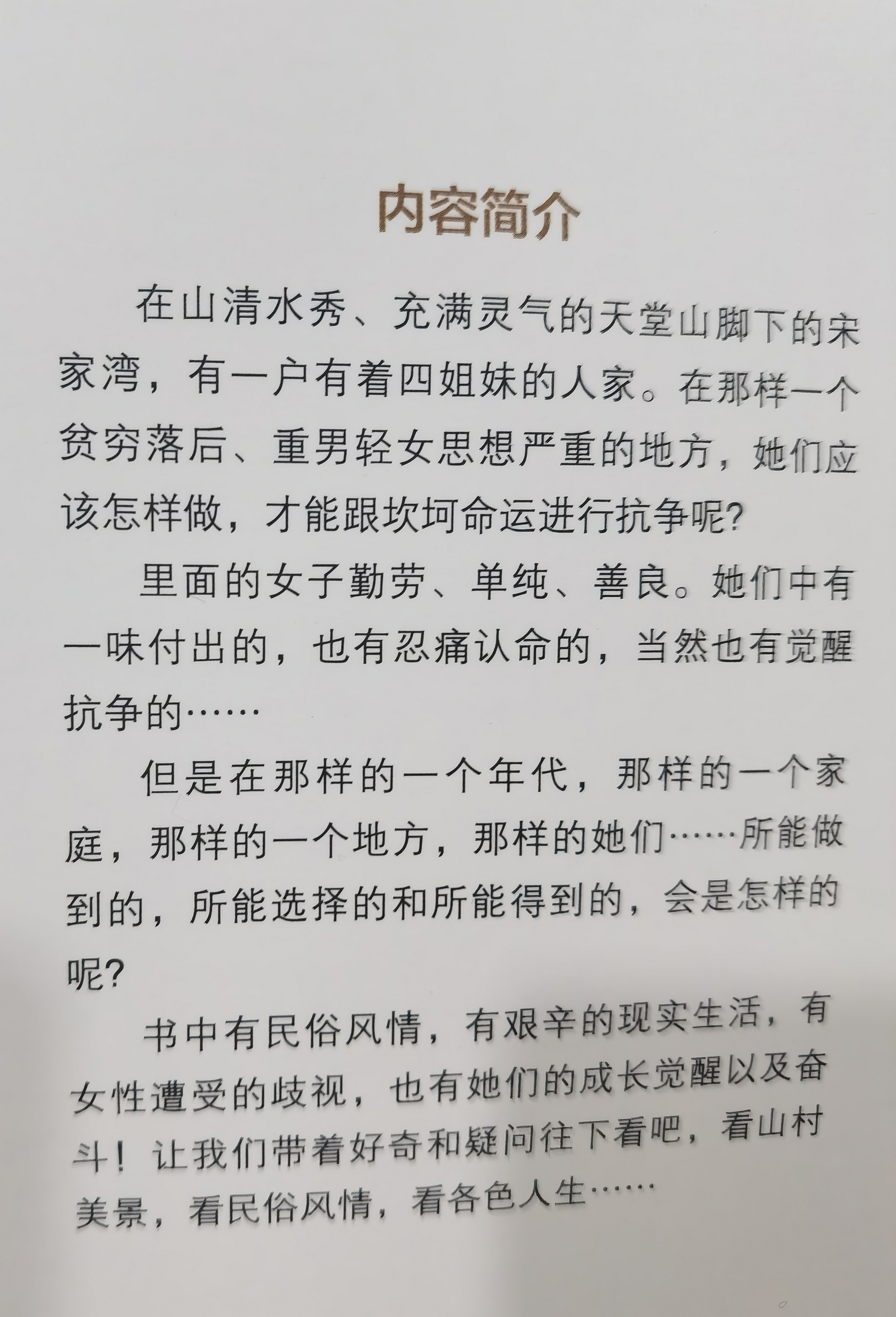 在山清水秀,充满灵气的天堂山脚下的宋家湾,有一户有着四姐妹的人家。在那样一个贫穷落后,重男轻女思想严重的地方,她们应该怎样做,才能跟命运、温饱、求学、婚姻进行抗争呢?