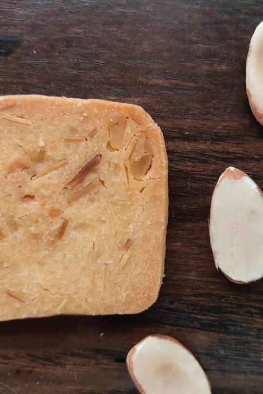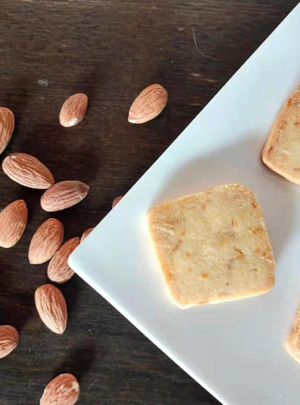 配料:有机黄油、糖粉、生态散养鸡蛋、石磨有机面粉、杏仁粉、高邮鸭蛋黄、盐、杏仁片