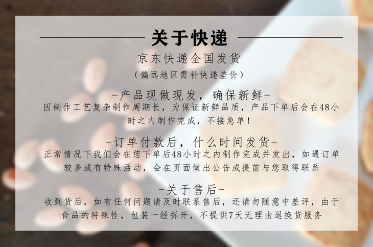 售后须知 2、生鲜产品自然生长,因个人口感喜好不同,非质量问题不给予理赔,介意慎拍; 3、由于收货人电话关机、停机、电话号码填写错误、收货信息不详等原因导致派件不及时、拒收、退回。 1、运输过程挤压碰撞的严重破损导致无法正常使用; 2、签收后12小时内腐败变质; 3、收到的产品与详情页介绍的信息不符、数量不符、重量不足等; 4、由于极端天气导致派单不及时造成产品变质、破损。 |