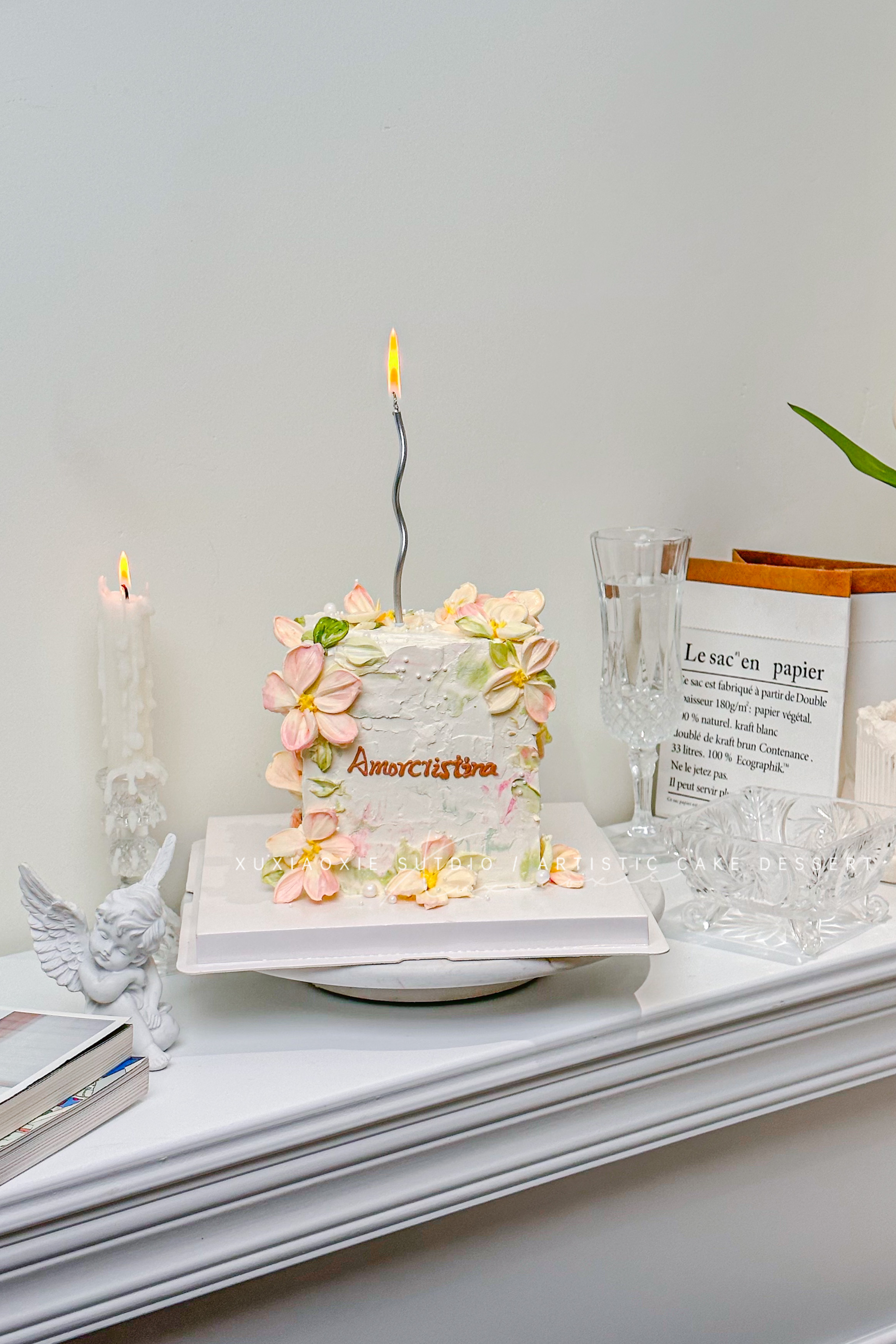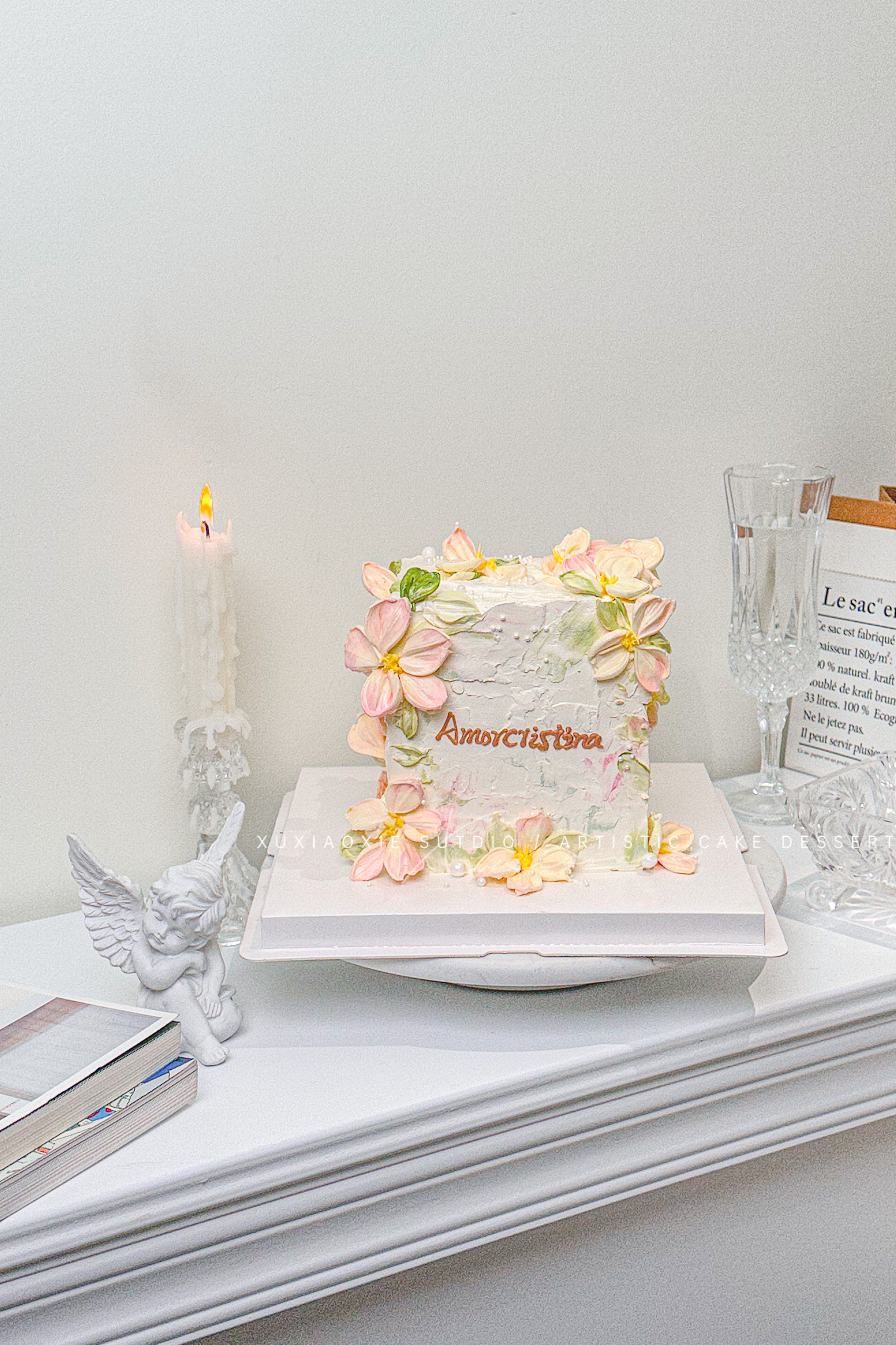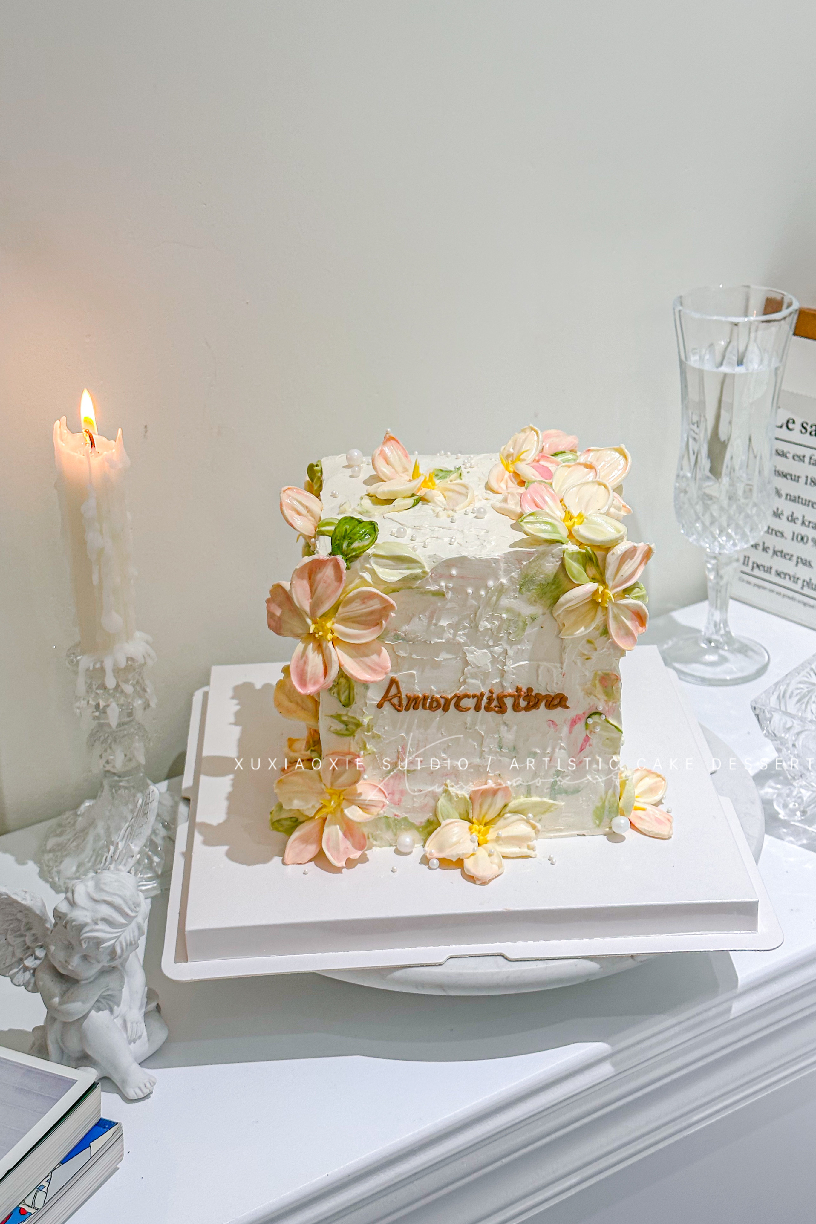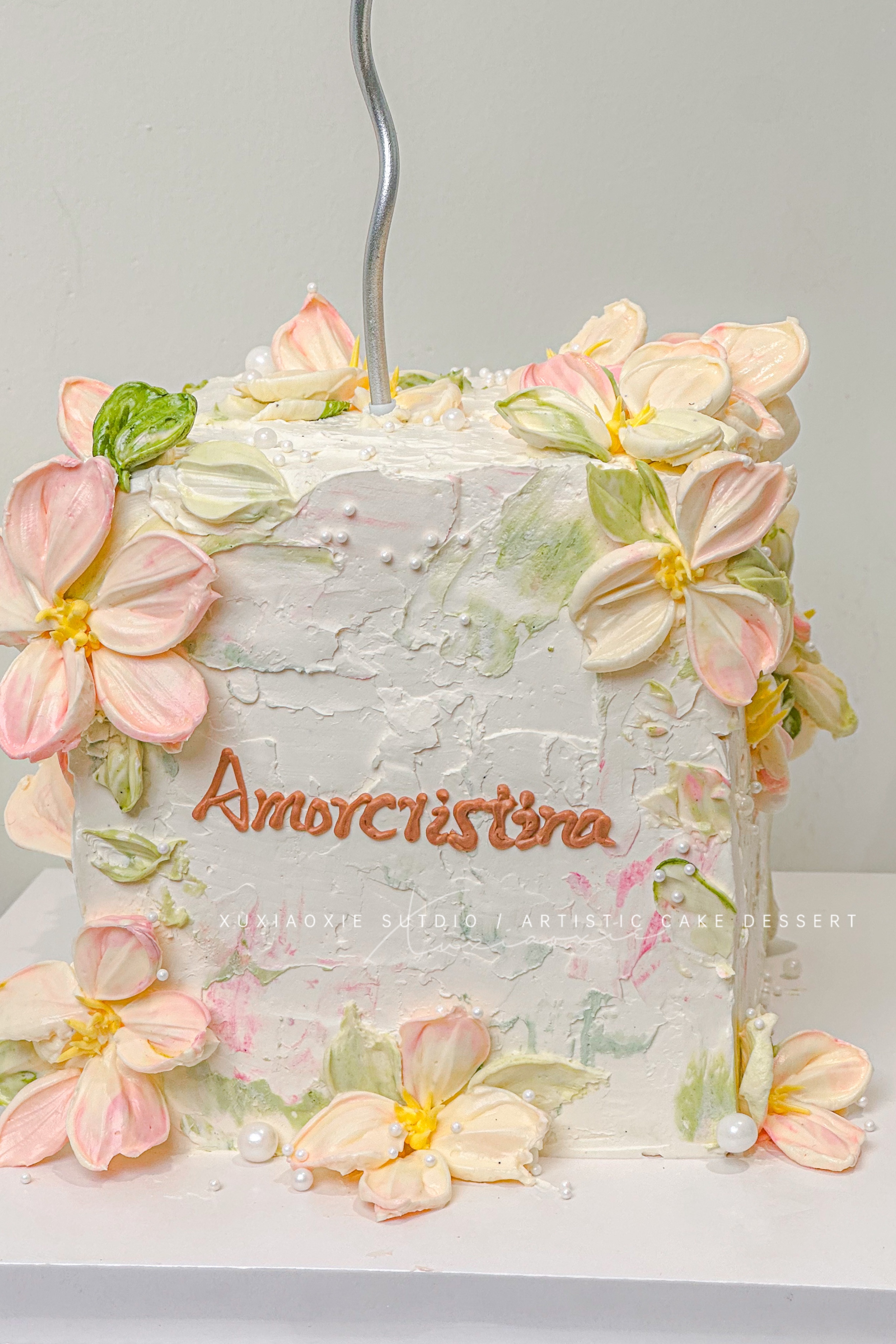 由于这款蛋糕是加高的且造型比较复杂,我们会使用奶油霜抹面来确保蛋糕的稳定性。