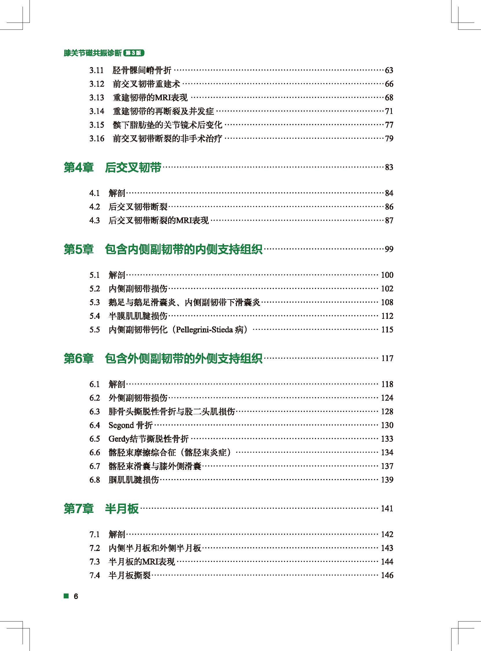全书共分12章,第1-2章介绍膝关节各切面影像解剖,磁共振成像的各种方法;第3-7章分别介绍了前交叉韧带、后交叉韧带、包含内侧副韧带的内侧支持组织、包含外侧副韧带的外侧支持组织、半月板的解剖,磁共振图像,以及各种常见疾病的影像诊断要点;第8-12章分别介绍了骨折脱臼、肌肉损伤,青少年膝关节疾病,软骨损伤、变形及坏死,滑膜病变与皱襞功能障碍,膝关节内外积液5类疾病中各种问题的影像诊断。