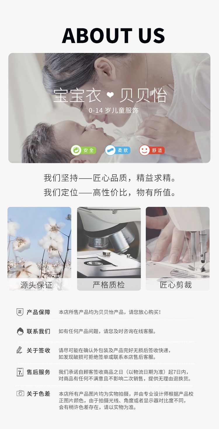 - 贝贝怡专注0-6岁婴幼儿服饰,坚持安全、柔软、舒适的产品理念,为千万中国家庭提供超高品质、安全可靠的婴幼儿服饰产品,妈妈放心,宝宝开心!