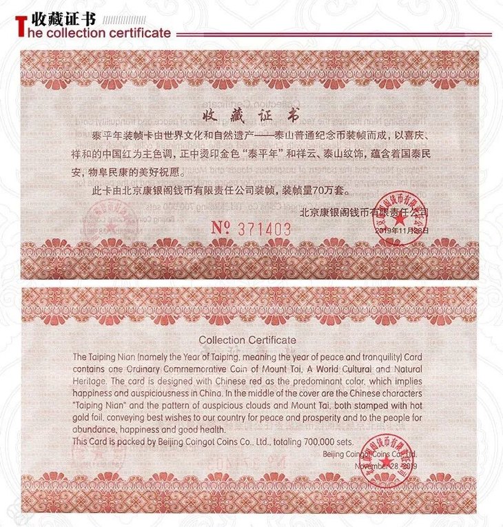 产品规格:一套一枚装,带收藏证书。