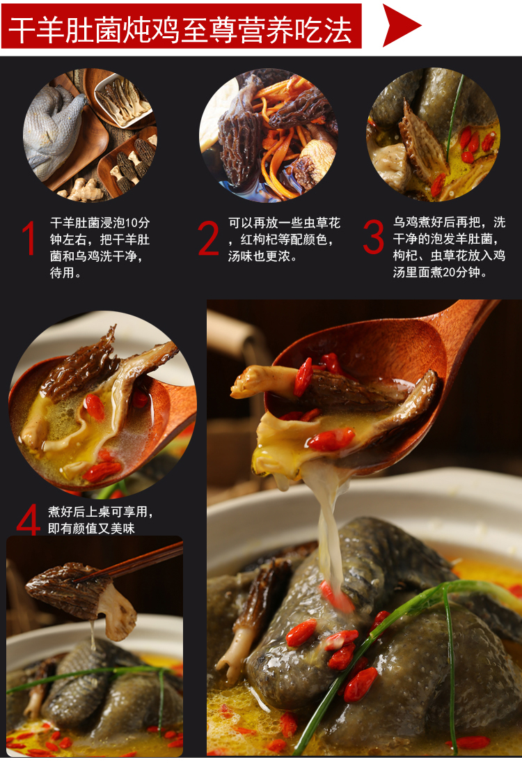 【产品介绍】羊肚菌既是宴席上的珍品,又是久负盛名的食补良品,民间有‘年年吃羊肚、八十照样满山走’的说法。羊肚菌“性平、味甘,具有益肠胃、消化助食、化痰理气、补肾、壮阳、补脑、提神之功能,对脾胃虚弱、消化不良、痰多气短、头晕失眠有良好的治疗作用。羊肚菌有机锗含量较高,具有强健身体、预防感冒、增强人体免疫力的功效。