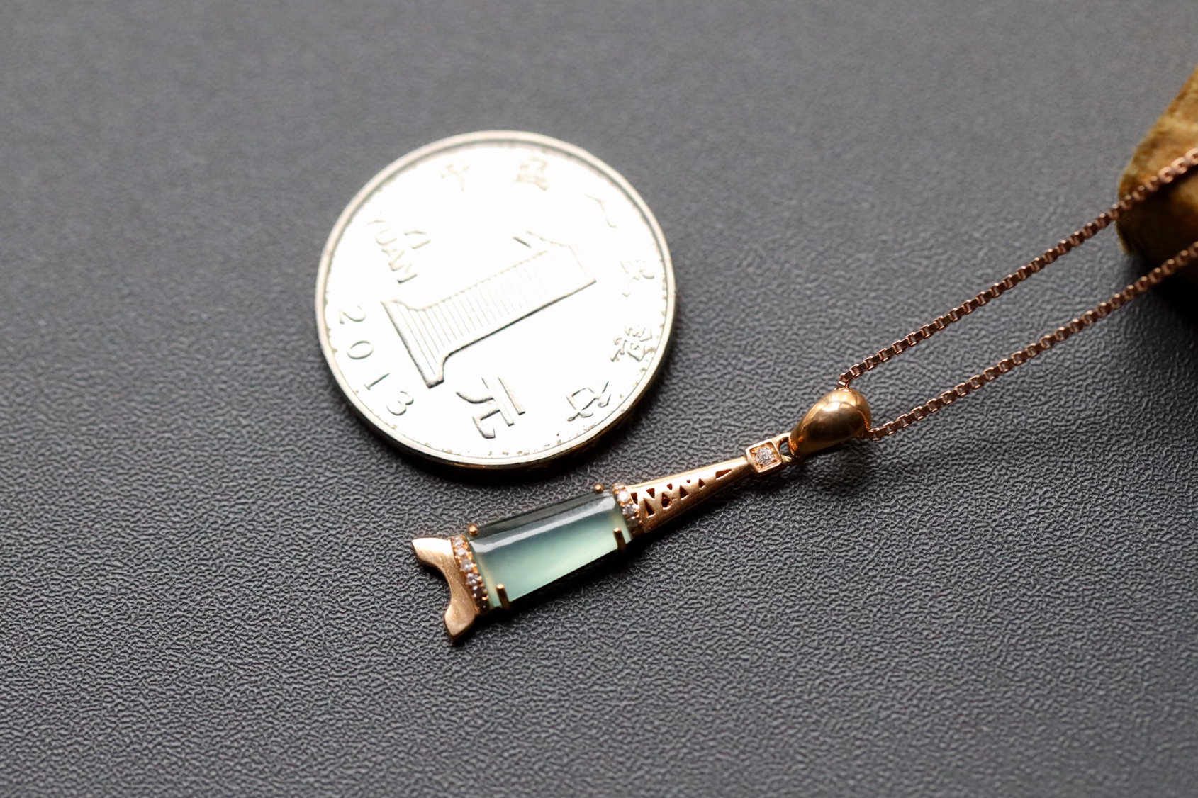 翡翠塔吊坠,向往巴黎的艾菲尔铁塔,也想在漫天飘雪的冬夜从东京塔俯瞰全城。曾经为小伙伴打造过这样一件浪漫的“塔”,念念不忘。幸得少有的高冰种蓝水戒面原料,每次复刻都是经典,令人怦然心动的种水,荧光四射,裸石10.4*6.5*3.2mm,镶嵌后32.2*7.8*3.3mm。18k玫瑰金钻石镶嵌款式精致无比,一件众人侧目的宝贝,今天请走我再送她银镀玫瑰金项链一条,精品推荐,小四价位