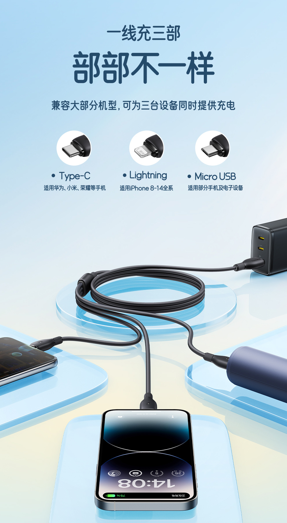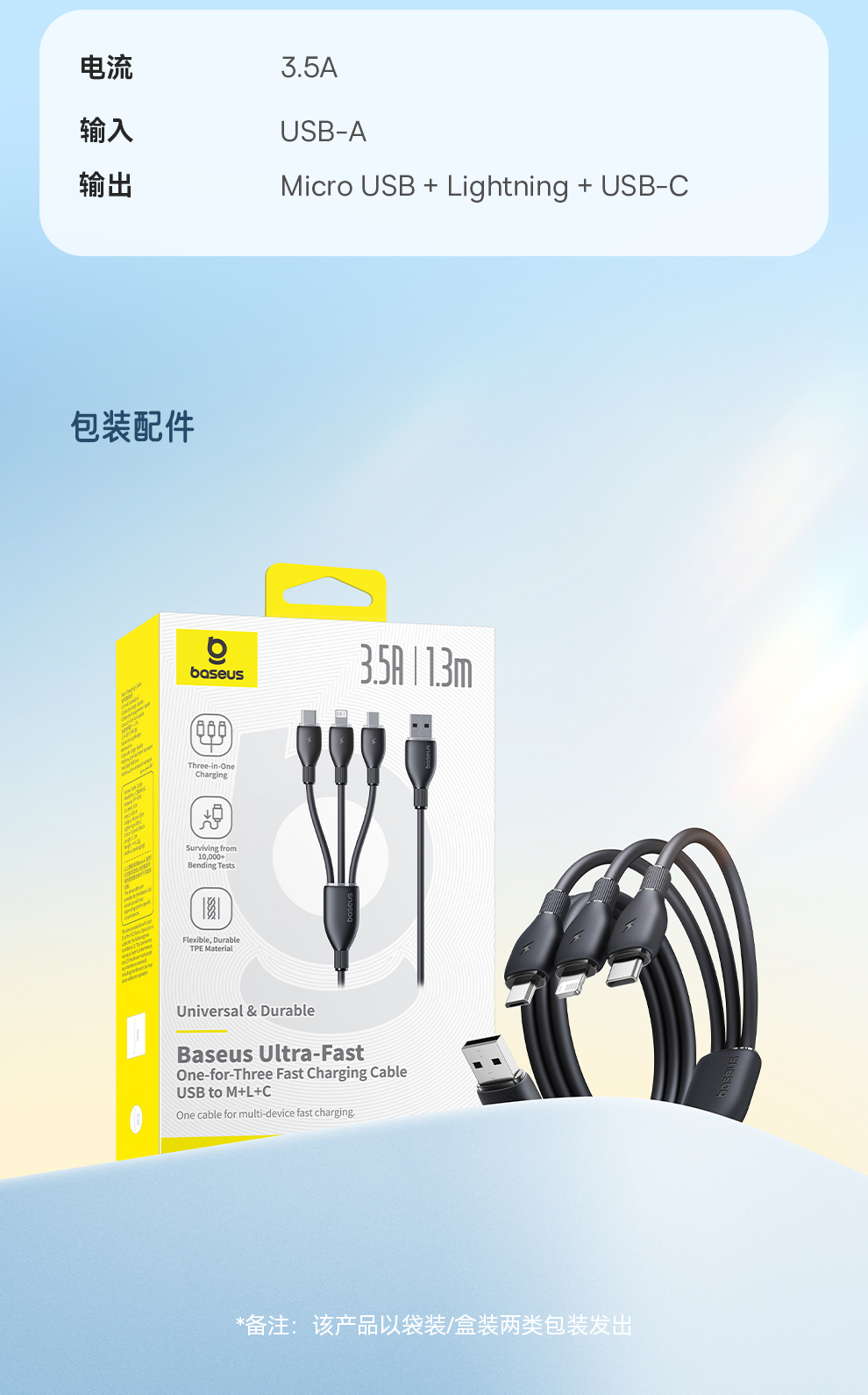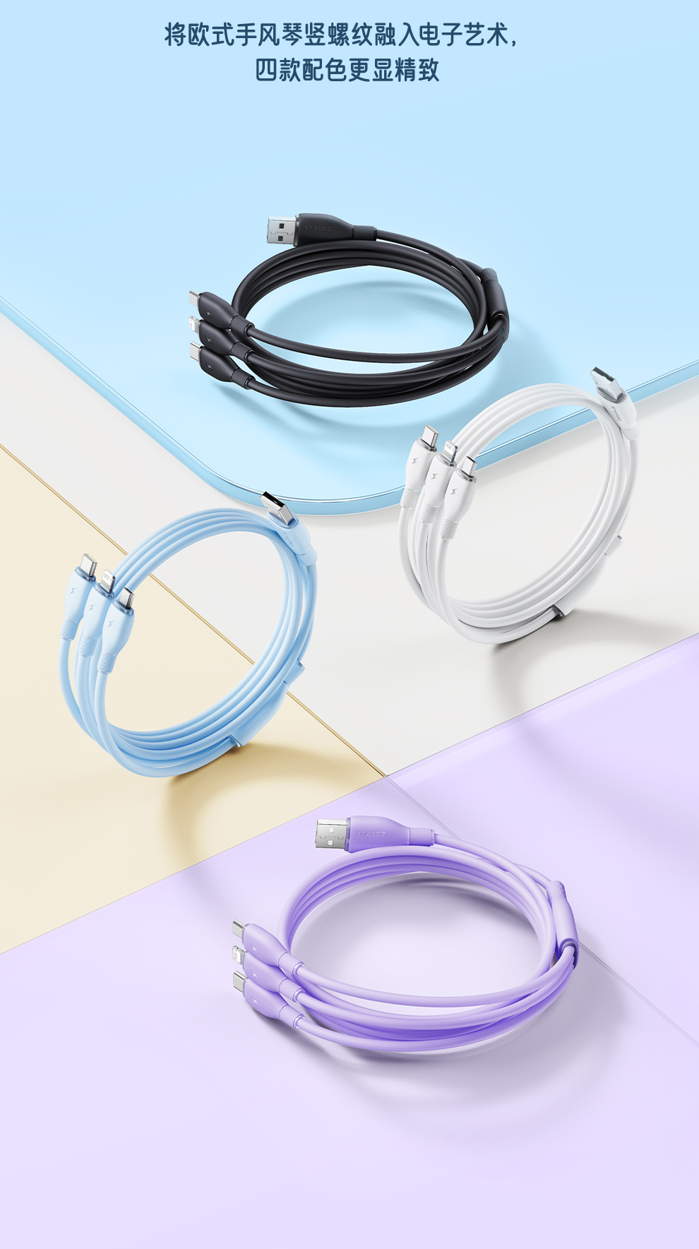 【社群赠品】倍思 劲速系列 一拖三快充充电线 USB to M+L+C 3.5A