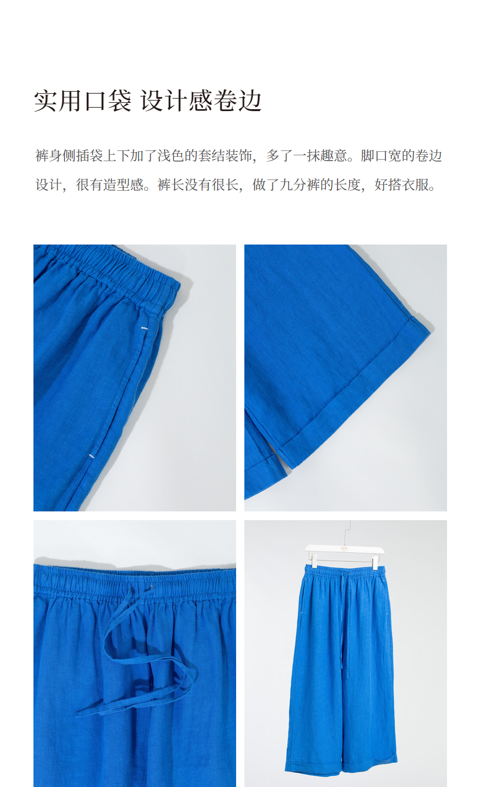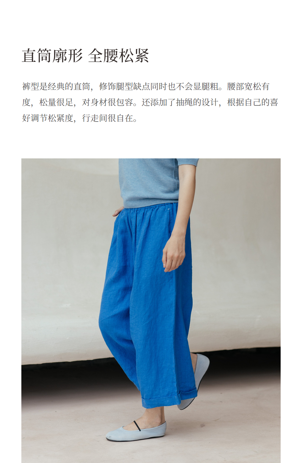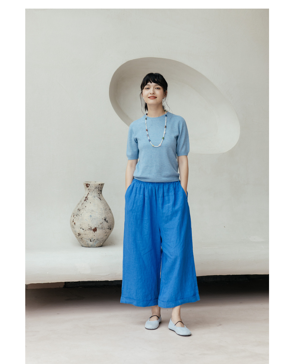 绽放旅行女装437/进口高支亚麻松紧腰卷边九分裤直筒廓形休闲裤女