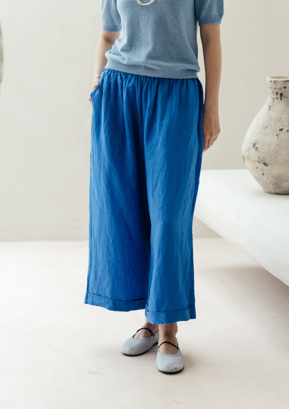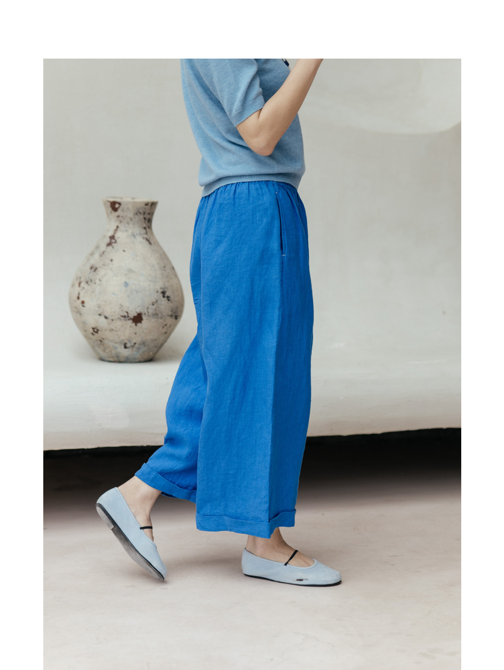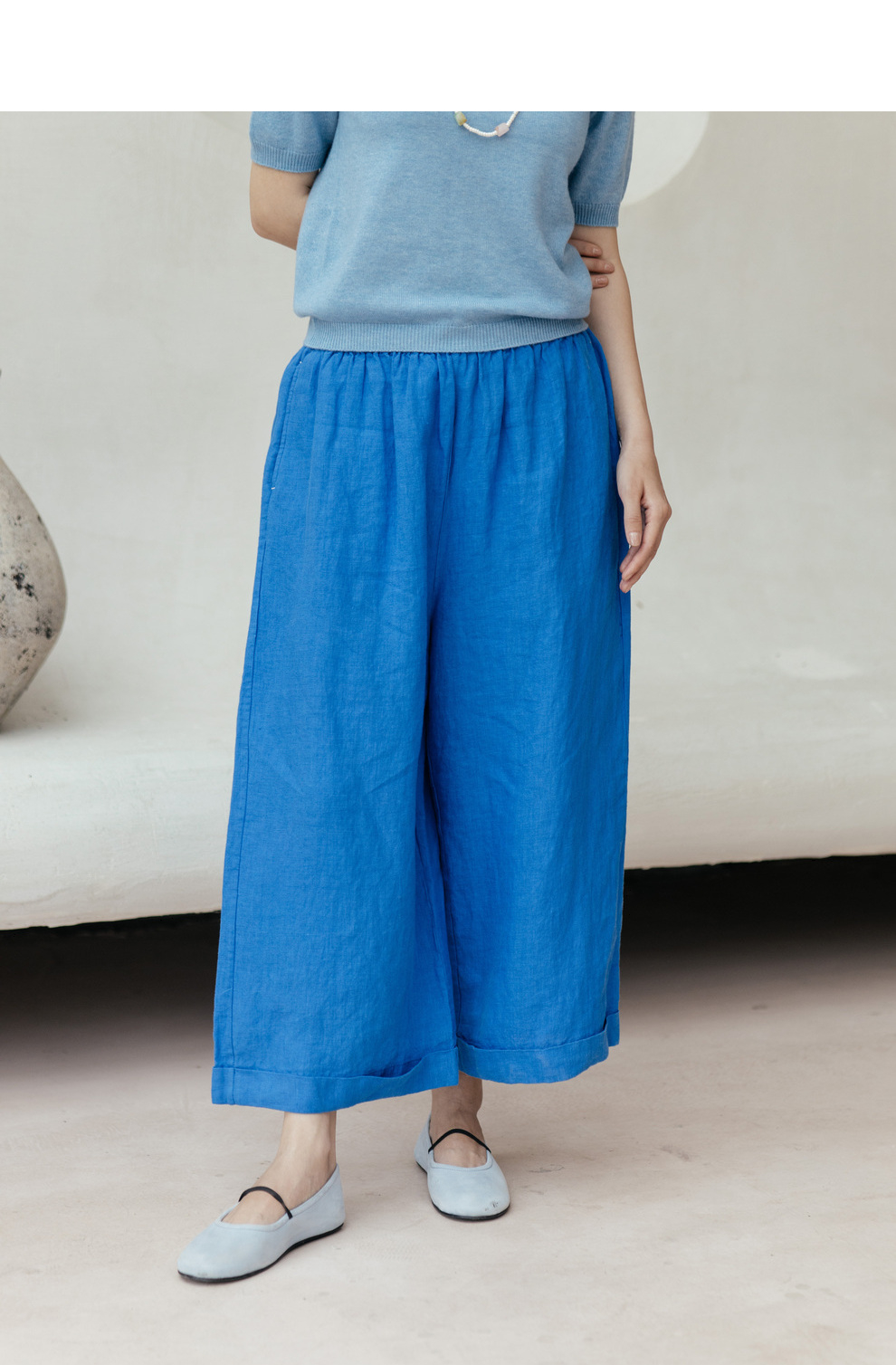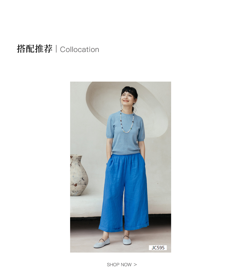 绽放旅行女装437/进口高支亚麻松紧腰卷边九分裤直筒廓形休闲裤女