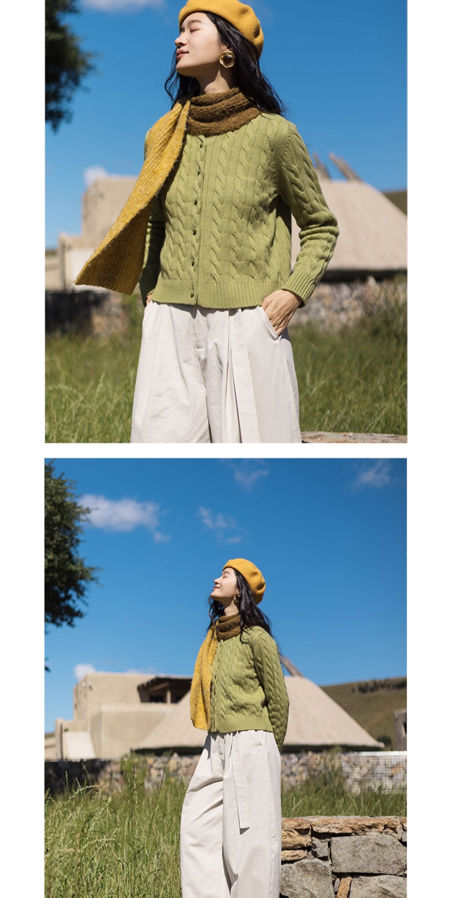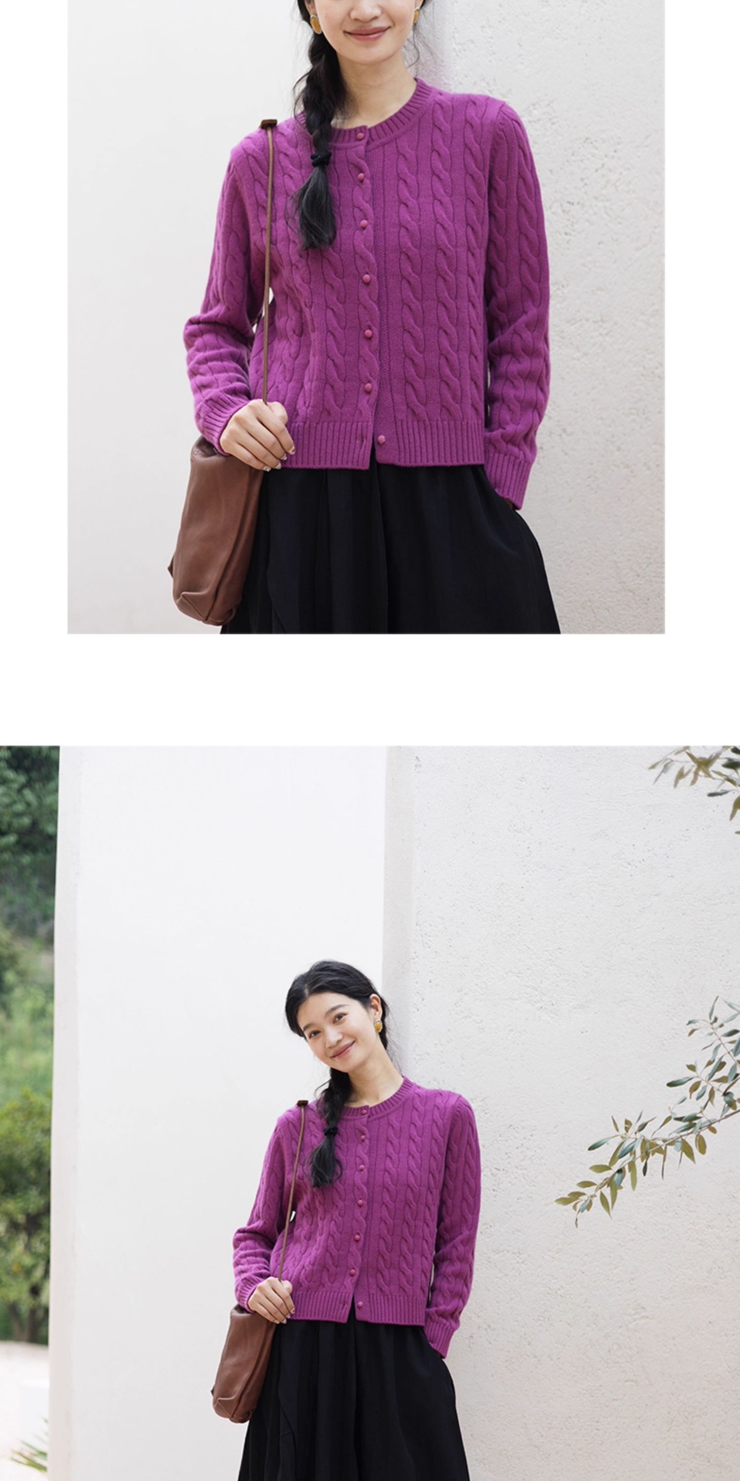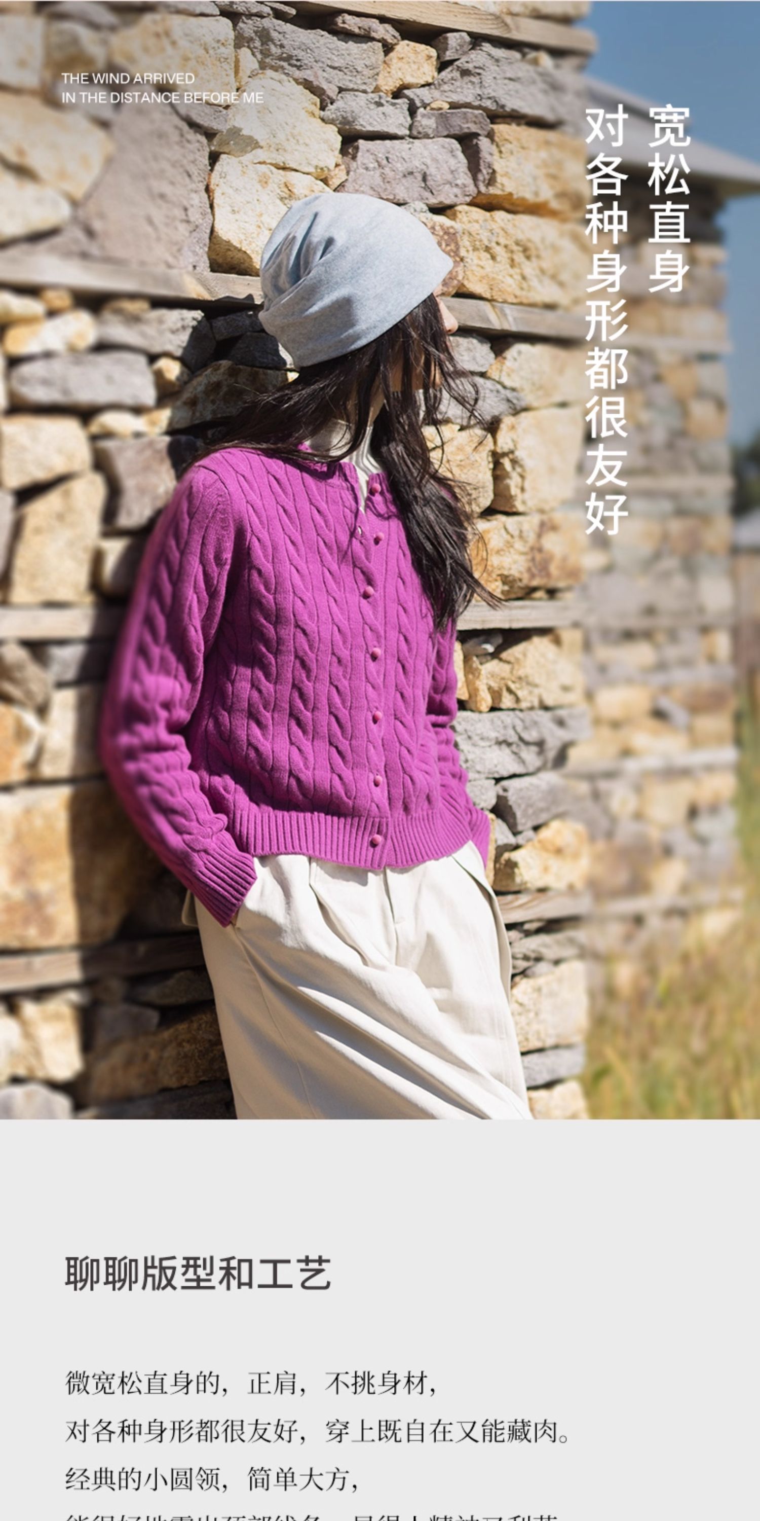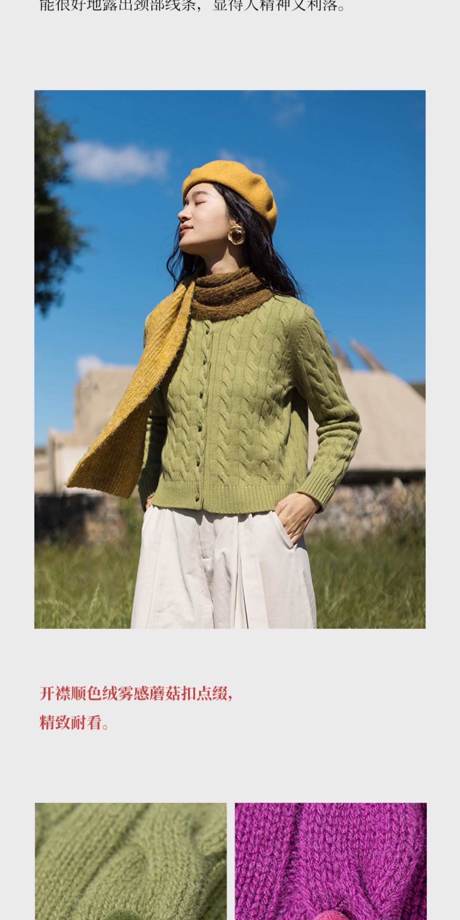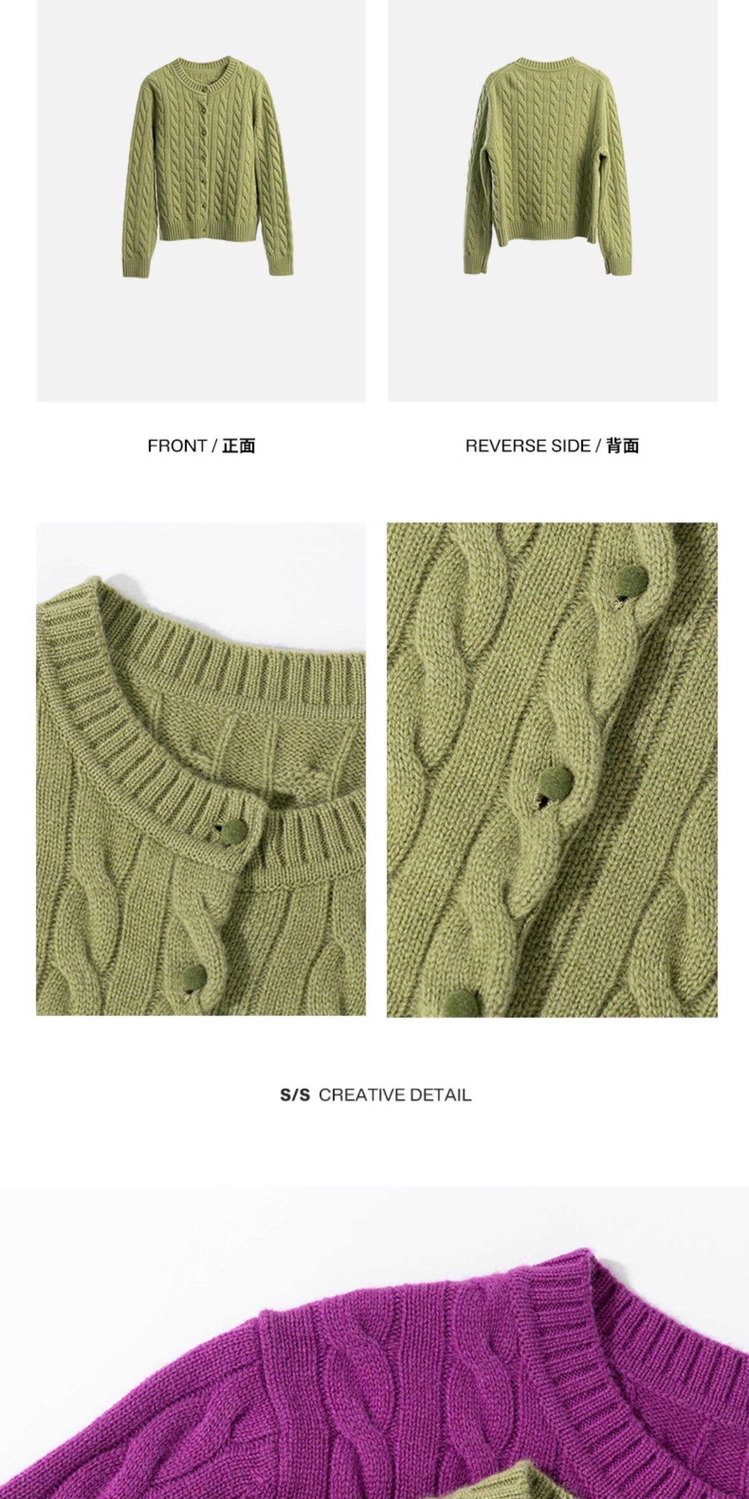 特绽放649朵/纯羊毛绞花圆领短款开襟毛针织衫女秋冬新款毛衣外套