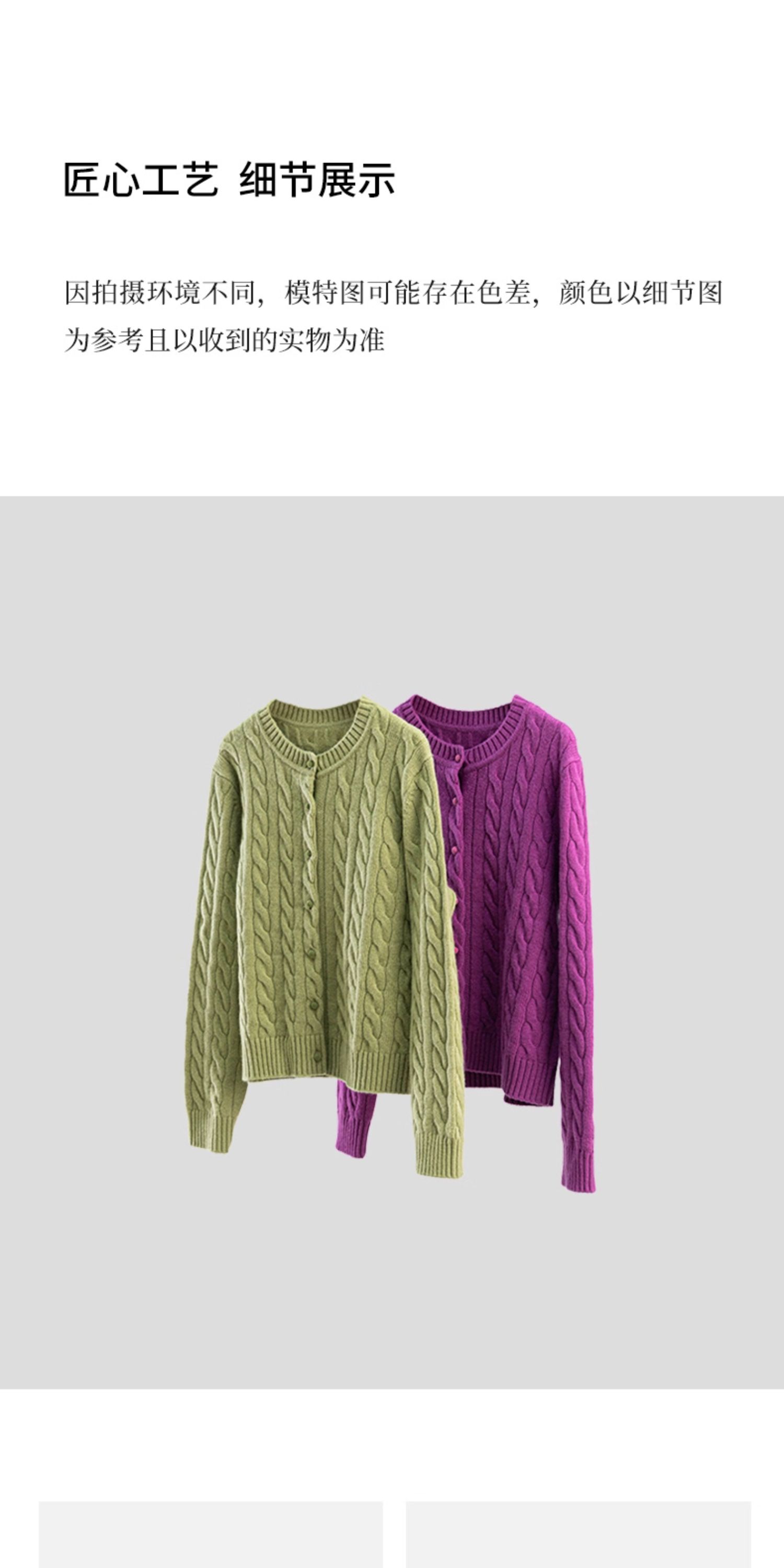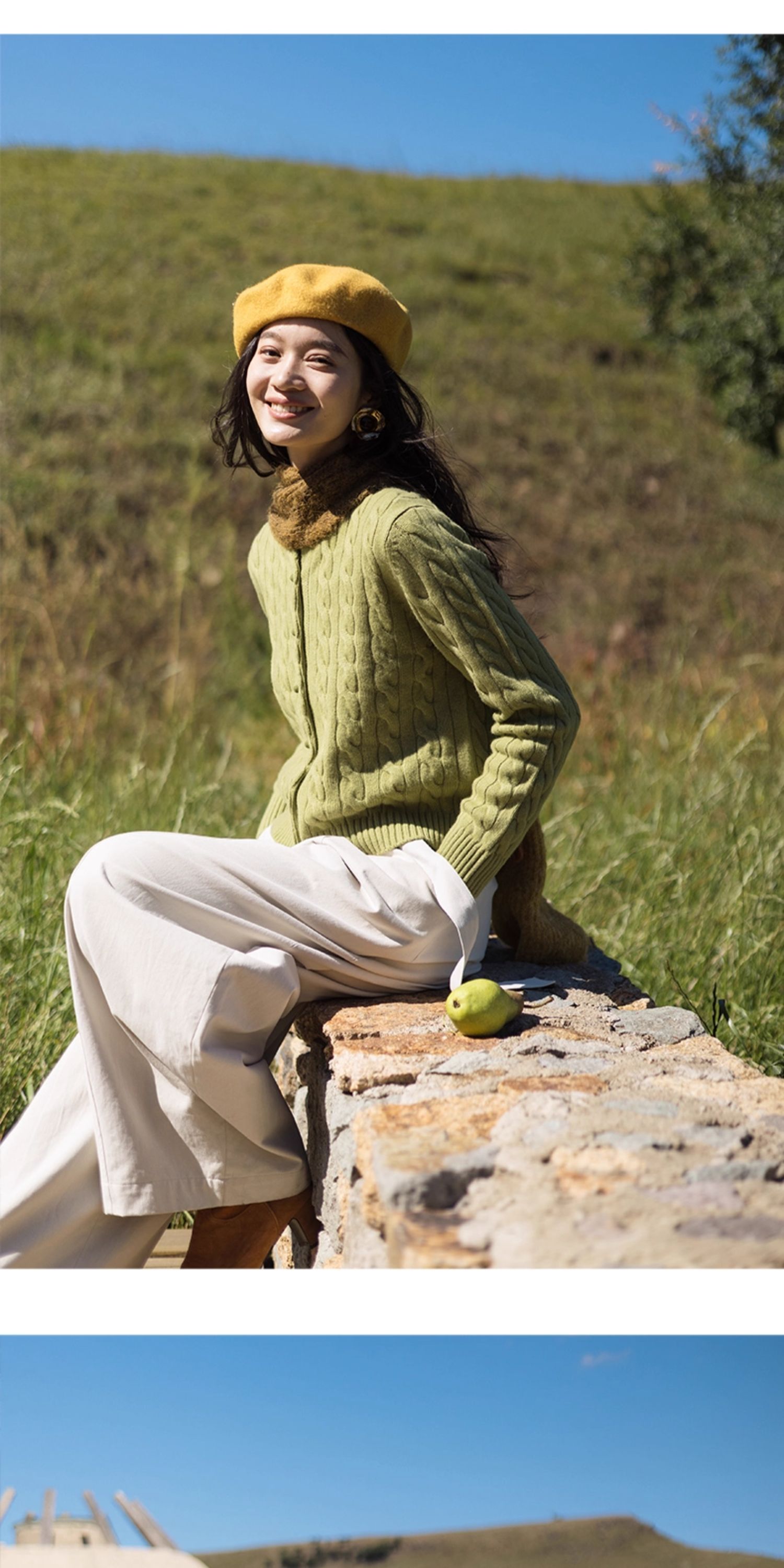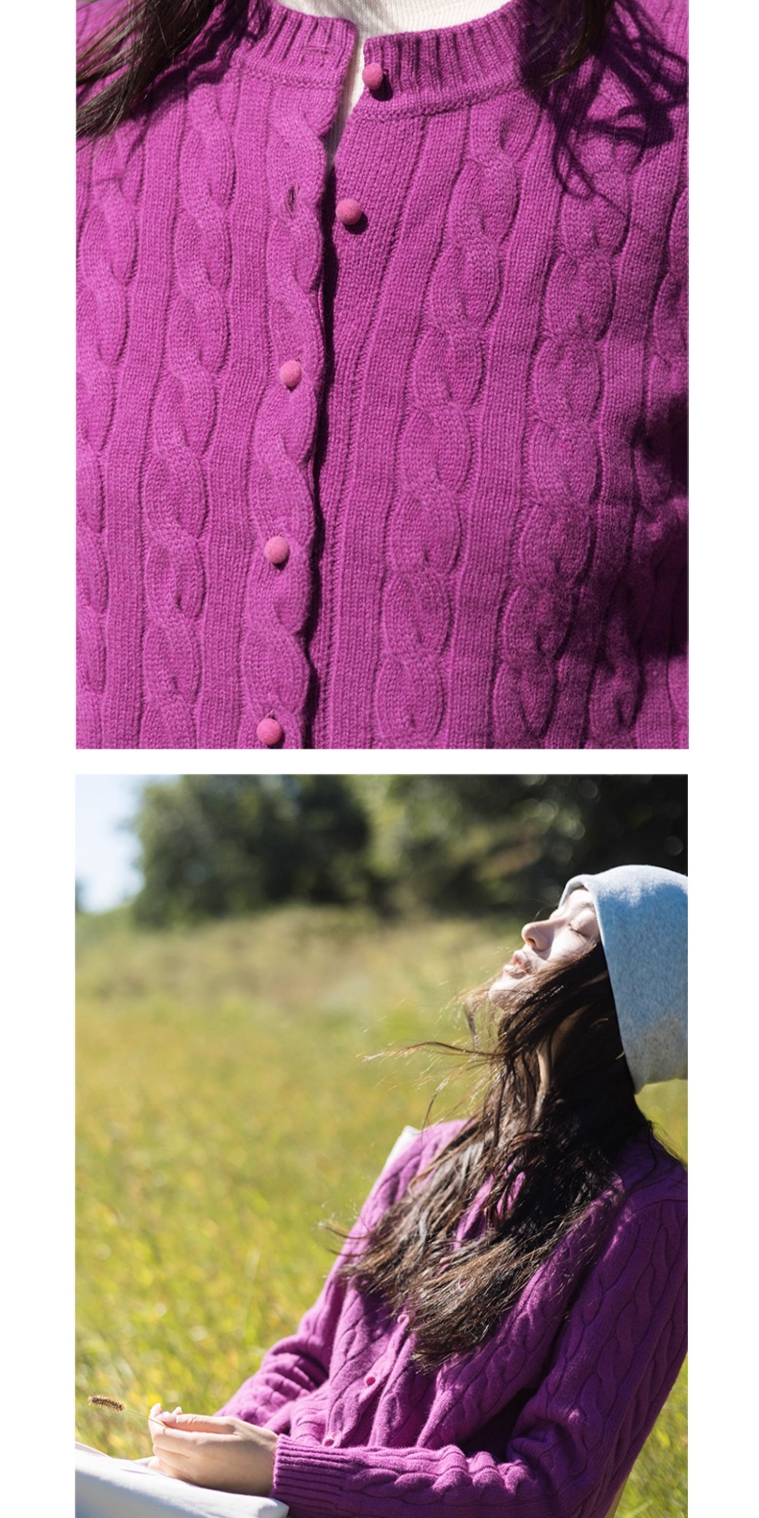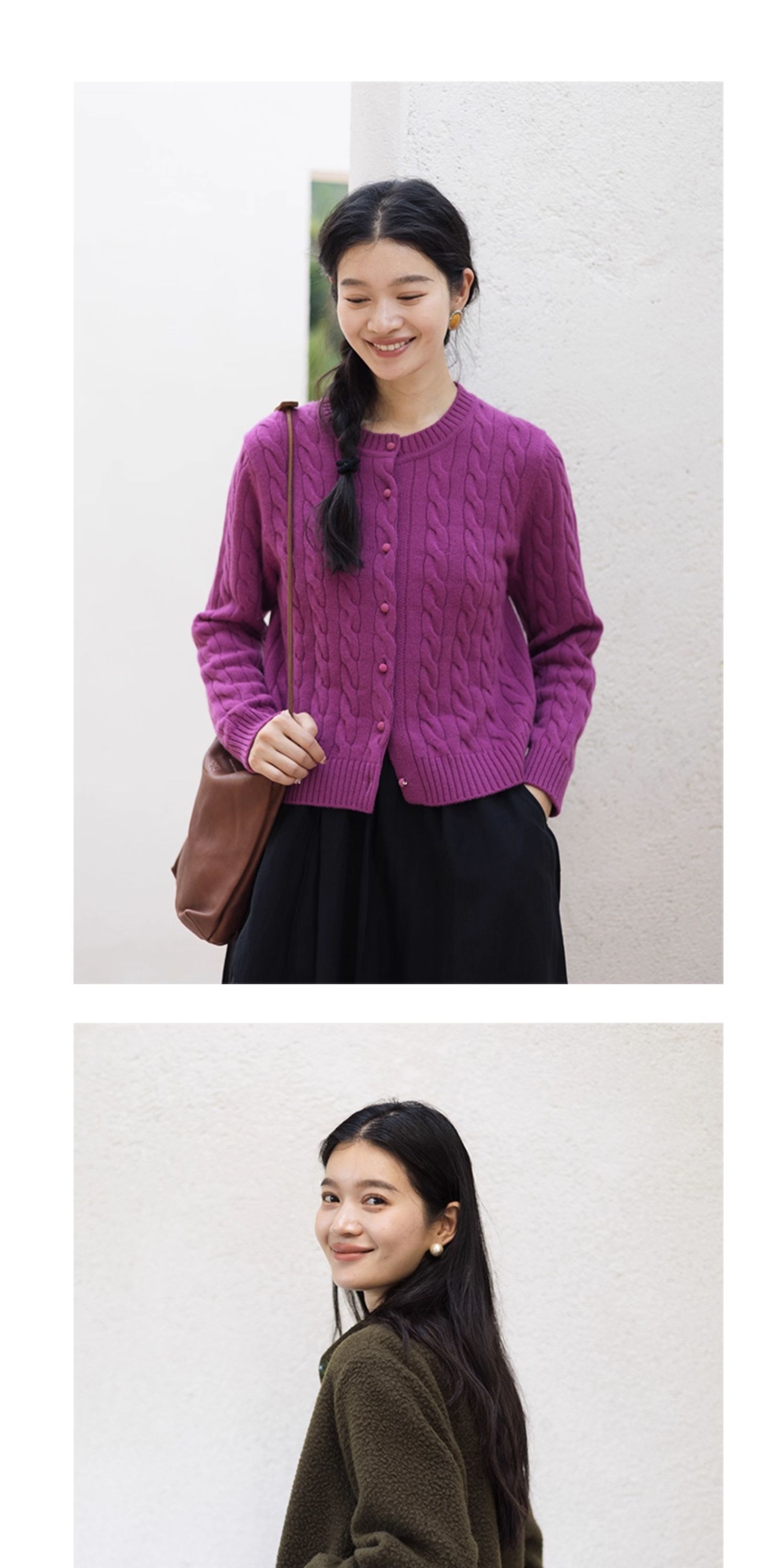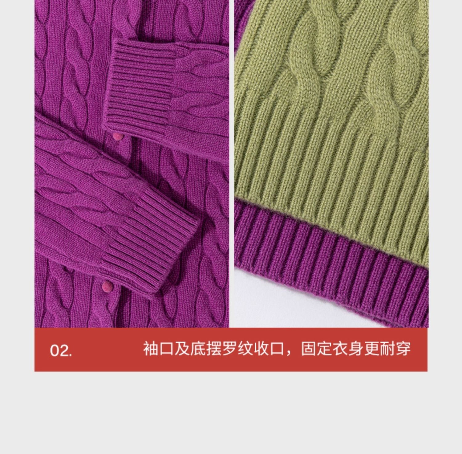 特绽放649朵/纯羊毛绞花圆领短款开襟毛针织衫女秋冬新款毛衣外套